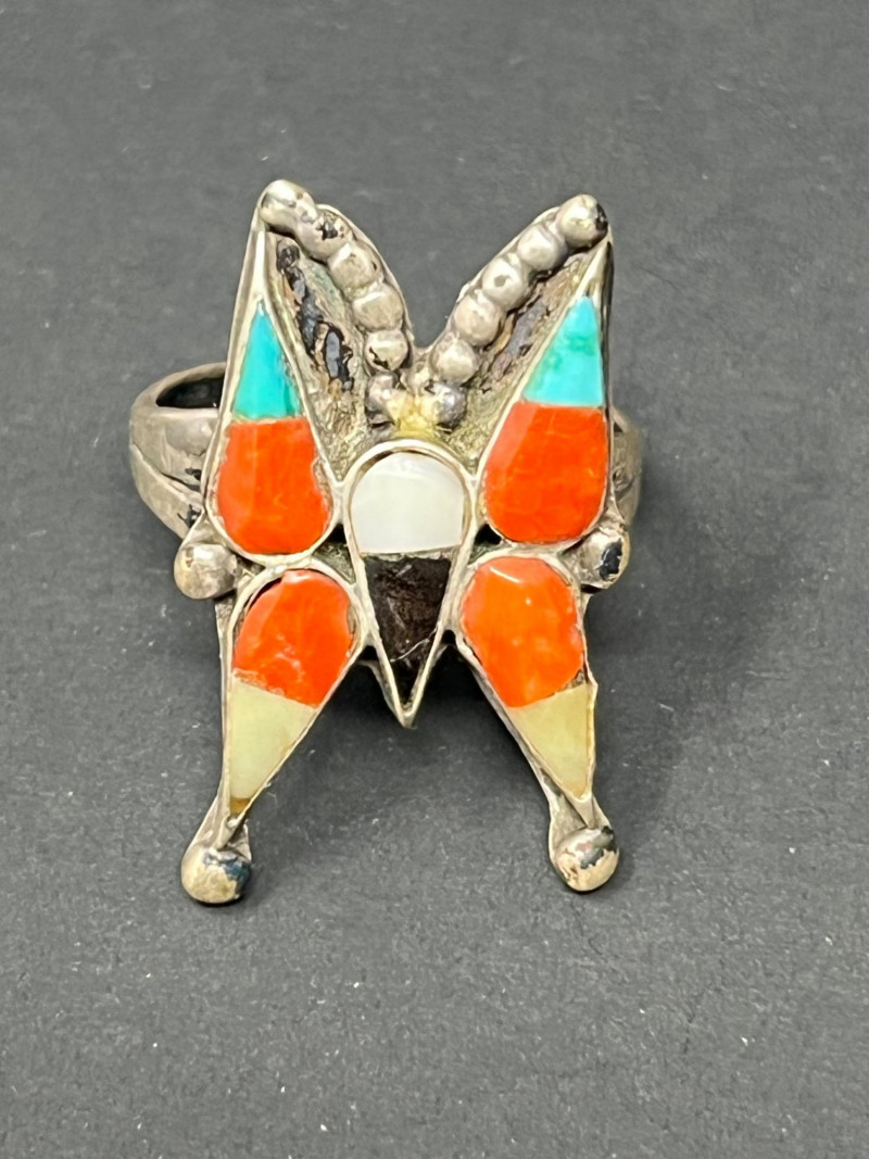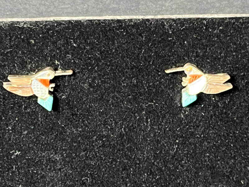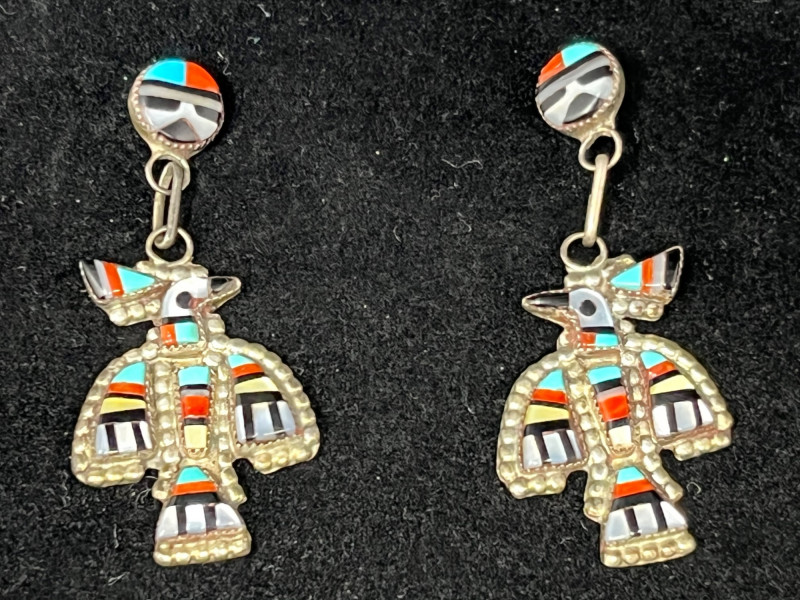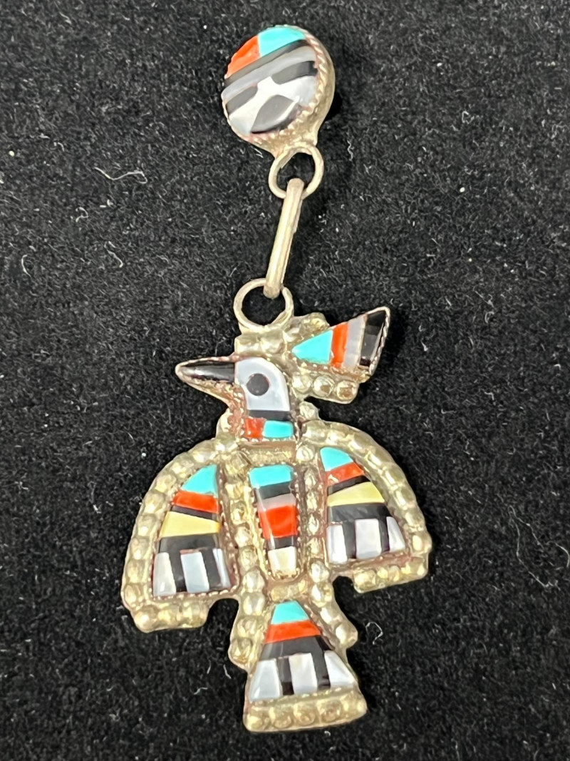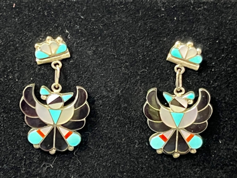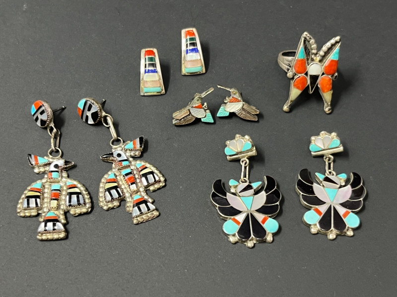 A vibrant ensemble of handcrafted Native American earrings showcasing traditional inlay artistry across iconic forms—thunderbirds, butterflies, birds in flight, and geometric panels. Featuring turquoise, coral, mother-of-pearl, and onyx, this collection celebrates the symbolic language and meticulous craftsmanship of Southwestern jewelry design. Origin: Likely Zuni and Navajo artisans, Southwestern United States Materials: Sterling silver or silver-toned metal, turquoise, coral, mother-of-pearl, black onyx, and other semi-precious stones Included Pieces: (2) Pairs of Thunderbird earrings with multi-stone inlay (1) Pair of butterfly earrings with red, turquoise, and black accents (1) Pair of rectangular inlay earrings with red, blue, white, and turquoise (1) Turquoise ring with silver-toned bezel Design Motifs: Thunderbird (power and protection), butterfly (transformation), birds (freedom and spirit), geometric forms (tribal identity) Era: Mid-to-late 20th century Condition: Excellent vintage condition; artisan-made Estimated Value: $250–$600 depending on attribution and provenanceSummary