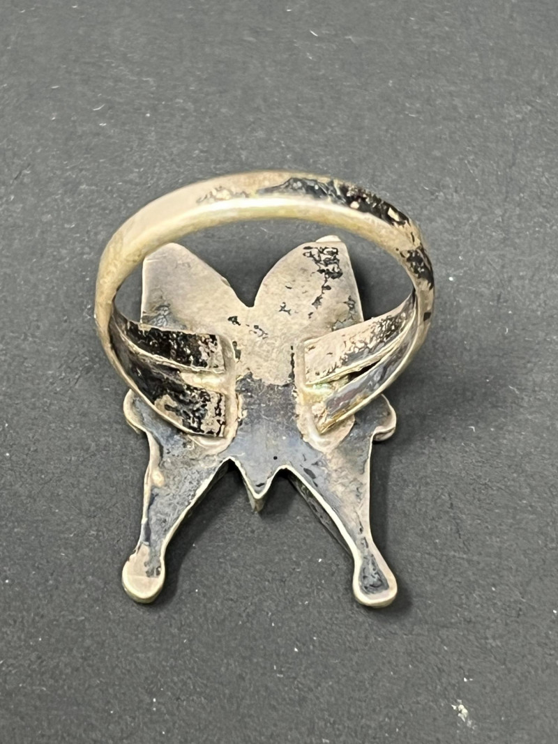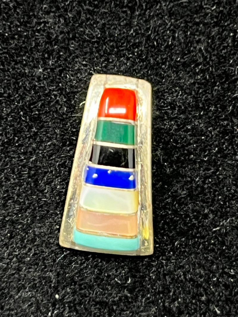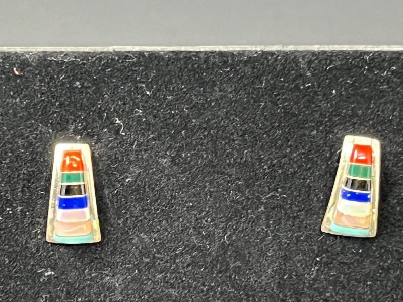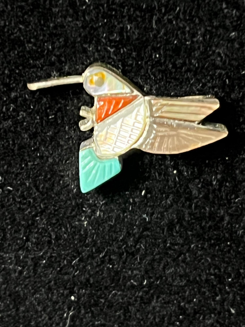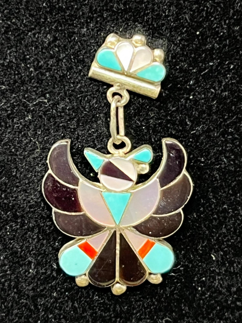 A vibrant ensemble of handcrafted Native American earrings showcasing traditional inlay artistry across iconic forms—thunderbirds, butterflies, birds in flight, and geometric panels. Featuring turquoise, coral, mother-of-pearl, and onyx, this collection celebrates the symbolic language and meticulous craftsmanship of Southwestern jewelry design. Origin: Likely Zuni and Navajo artisans, Southwestern United States Materials: Sterling silver or silver-toned metal, turquoise, coral, mother-of-pearl, black onyx, and other semi-precious stones Included Pieces: (2) Pairs of Thunderbird earrings with multi-stone inlay (1) Pair of butterfly earrings with red, turquoise, and black accents (1) Pair of rectangular inlay earrings with red, blue, white, and turquoise (1) Turquoise ring with silver-toned bezel Design Motifs: Thunderbird (power and protection), butterfly (transformation), birds (freedom and spirit), geometric forms (tribal identity) Era: Mid-to-late 20th century Condition: Excellent vintage condition; artisan-made Estimated Value: $250–$600 depending on attribution and provenanceSummary