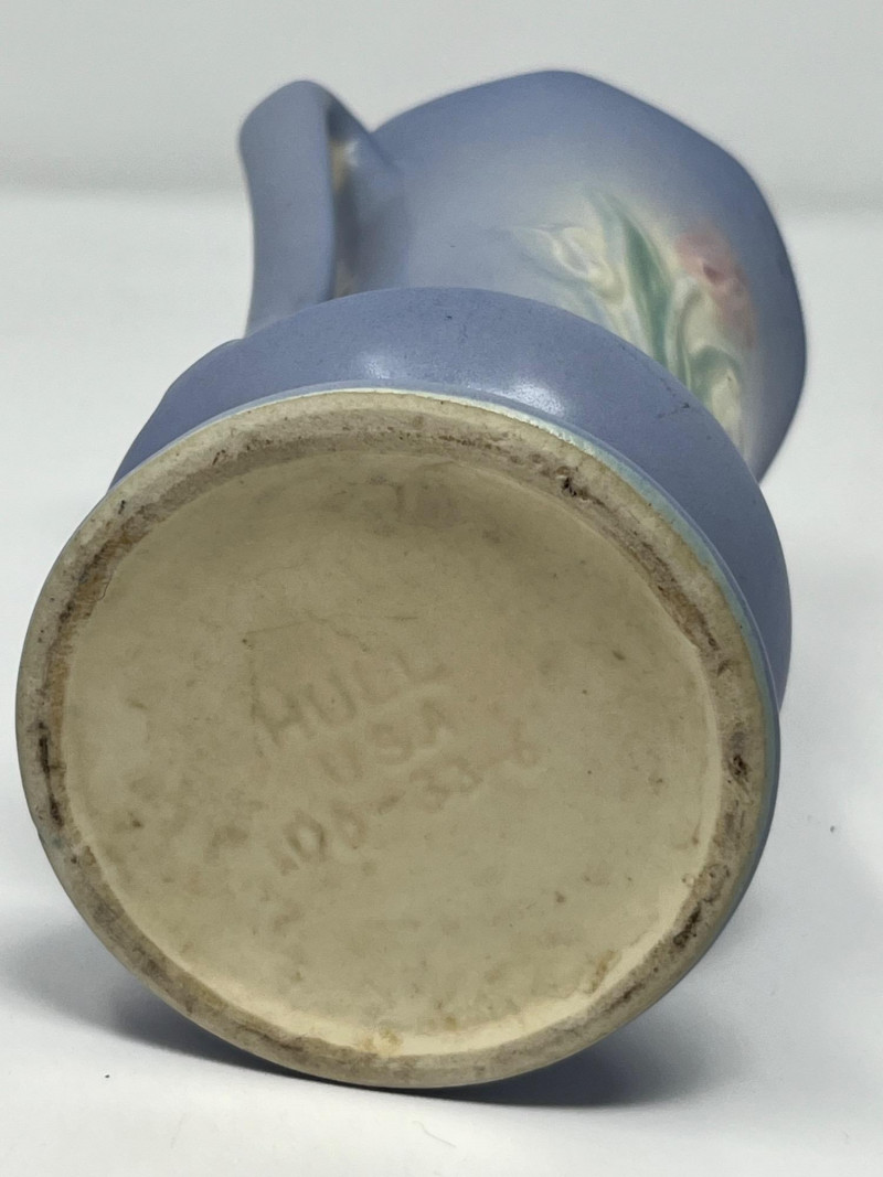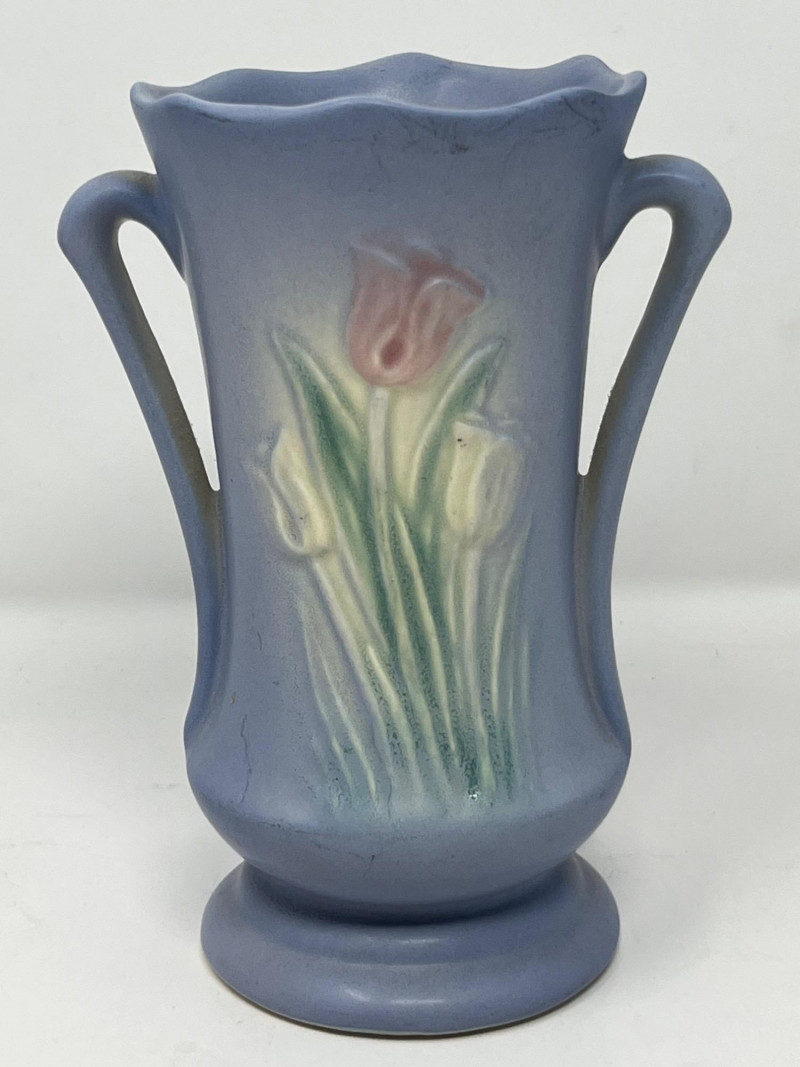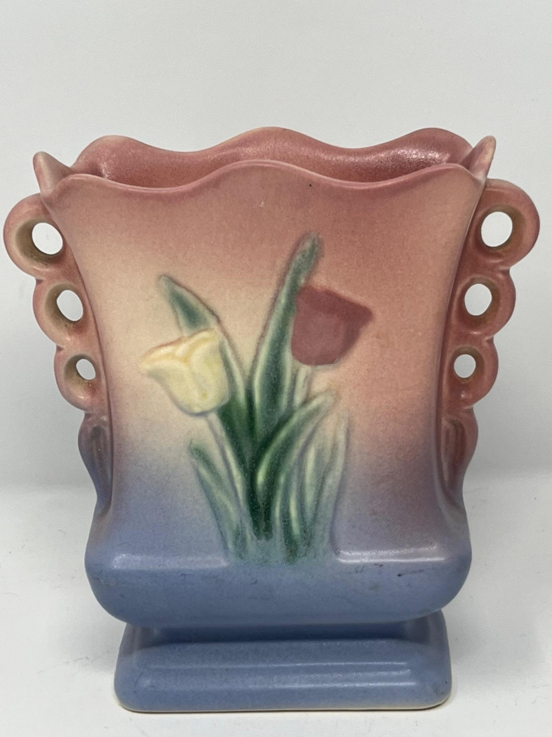 A charming pair of vintage Hull vases featuring embossed tulip motifs in soft pastel tones. With sculptural handles and scalloped rims, these ceramic pieces showcase Hull’s signature blend of Art Deco elegance and floral whimsy. Ideal for collectors of American pottery or spring-themed displays. Maker: Hull Pottery, USA Pattern: Tulip motif with embossed flowers and leaves Color Scheme: Gradient pink to purple with multicolor tulips (white, yellow, red) and green foliage Design Features: Vase 1: Rectangular base, scalloped rim, loop handles – approx. 5" × 7" Vase 2: Rounded base, flared top, curved handles – approx. 4" × 7" Era: Mid-20th century (likely 1930s–1950s) Condition: Excellent vintage condition; no chips or cracks noted Estimated Value: $45–$90 each depending on model and glaze quality Use: Decorative vases, spring-themed centerpieces, collectible displaySummary