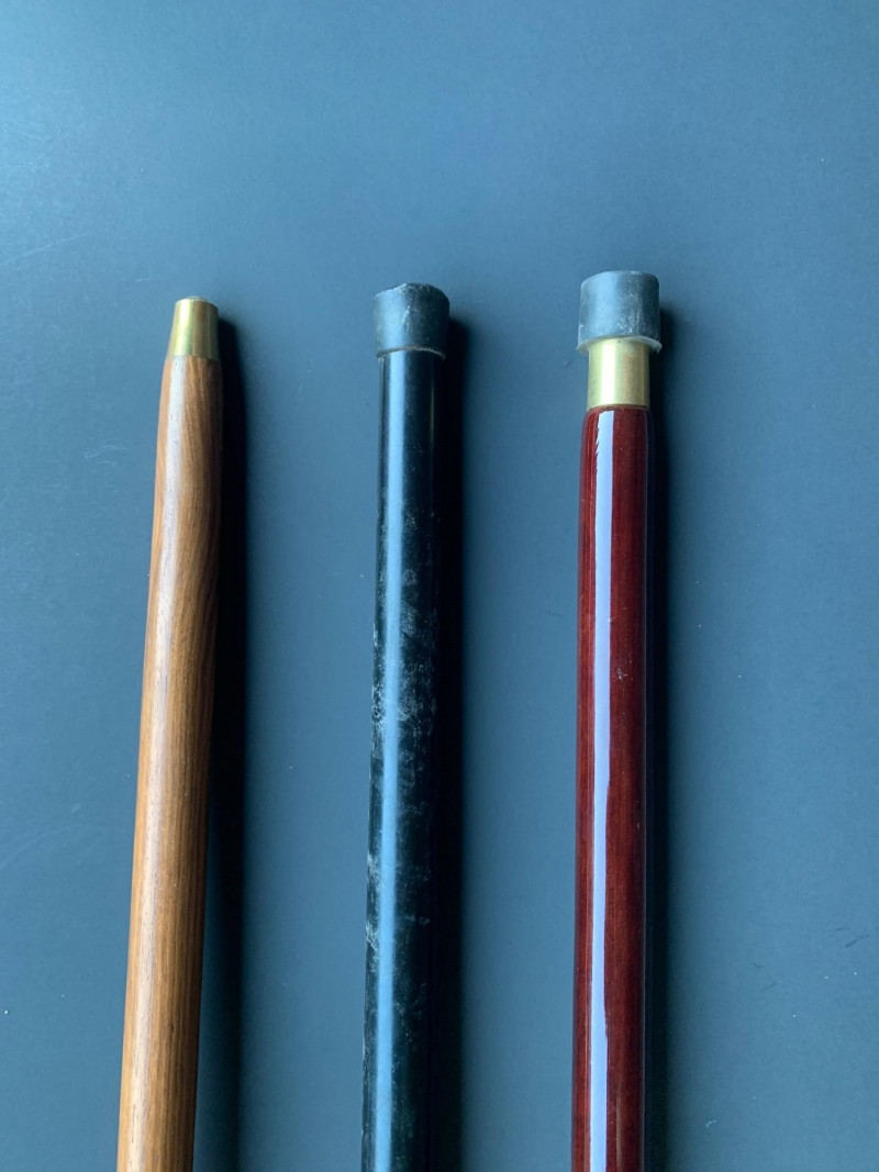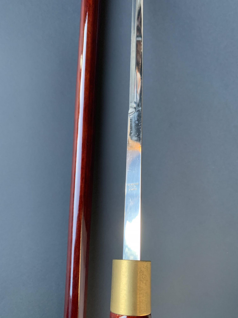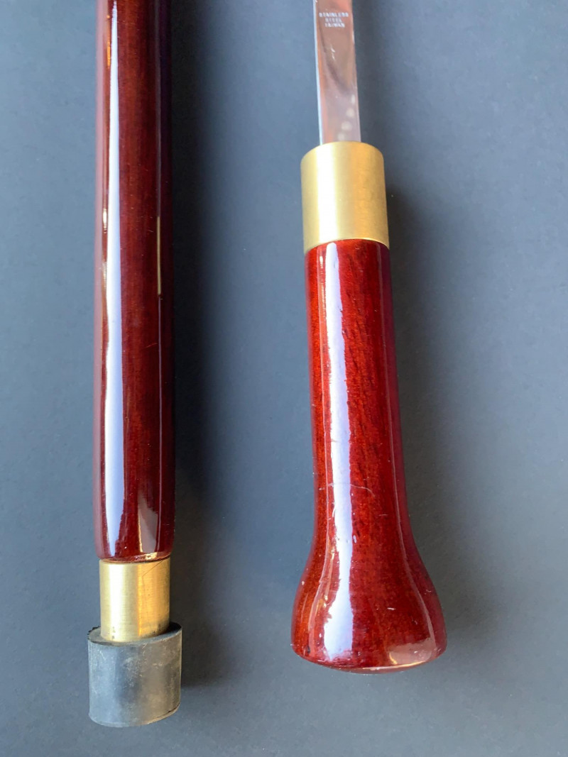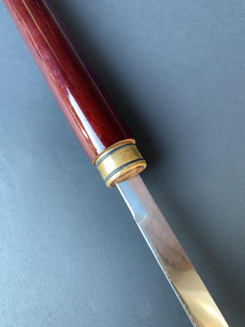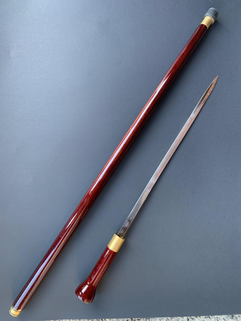 A striking three-piece collection of vintage sword canes, each blending craftsmanship with concealed utility. From the fierce dragon-head cane to the classic brass eagle and polished wood variants, this group showcases the artistry and intrigue of walking sticks designed for both fashion and defense. Ideal for collectors of militaria, costume props, or historical curiosities. Included Pieces: Dragon Cane Sword – 32", ornate handle with serpent or dragon motif, long concealed blade. Made in China. Brass Eagle Cane Sword – 35", stylized eagle head handle, reddish wood shaft, twist-lock blade. Made in India. Wood & Brass Cane Sword – 35", polished shaft with brass collar, rounded cane. Made in Taiwan. Materials: Wood, brass, steel blades Function: Concealed blades within walking cane shafts; twist or pull-release mechanisms Era: Mid-to-late 20th century Condition: Good vintage condition; blades intact, handles show light wear Estimated Value: $50–$150 each depending on design and mechanism Use: Fashion accessory, theatrical prop, collector’s displaySummary