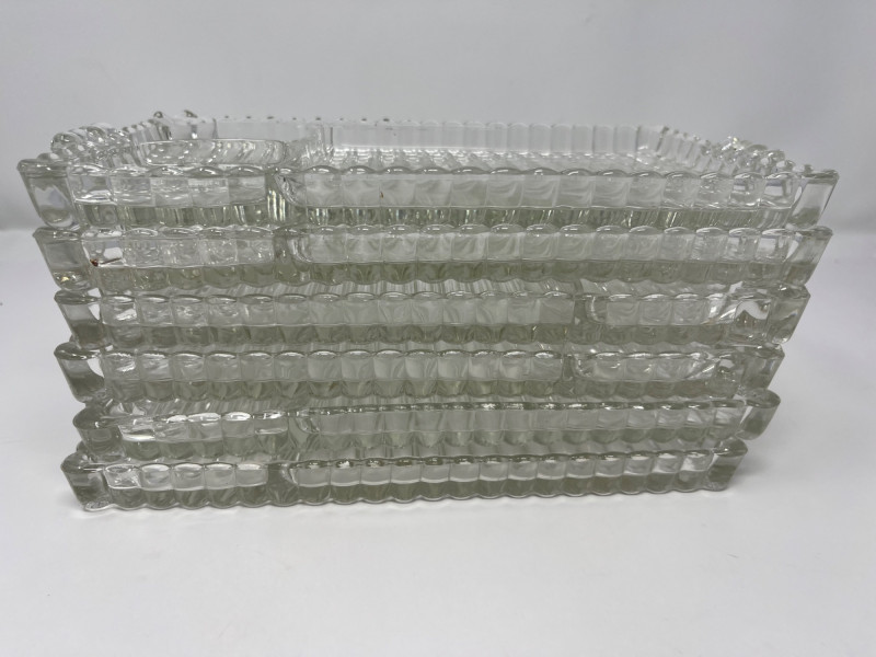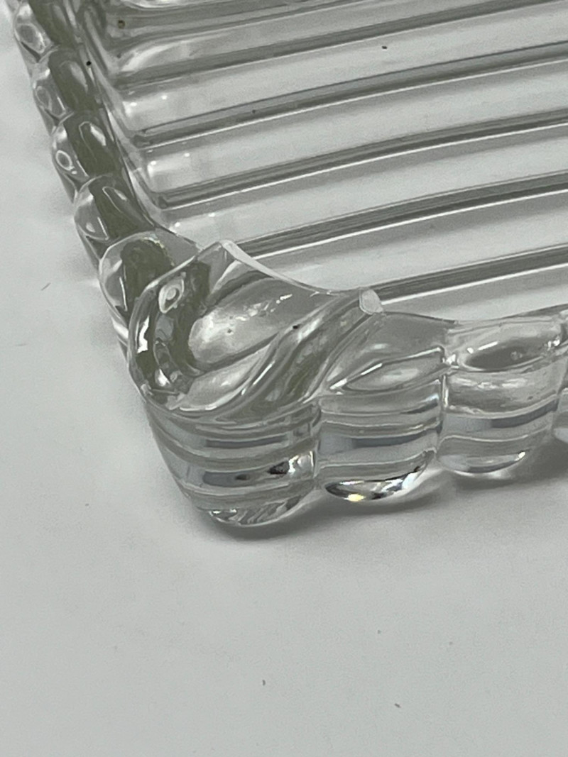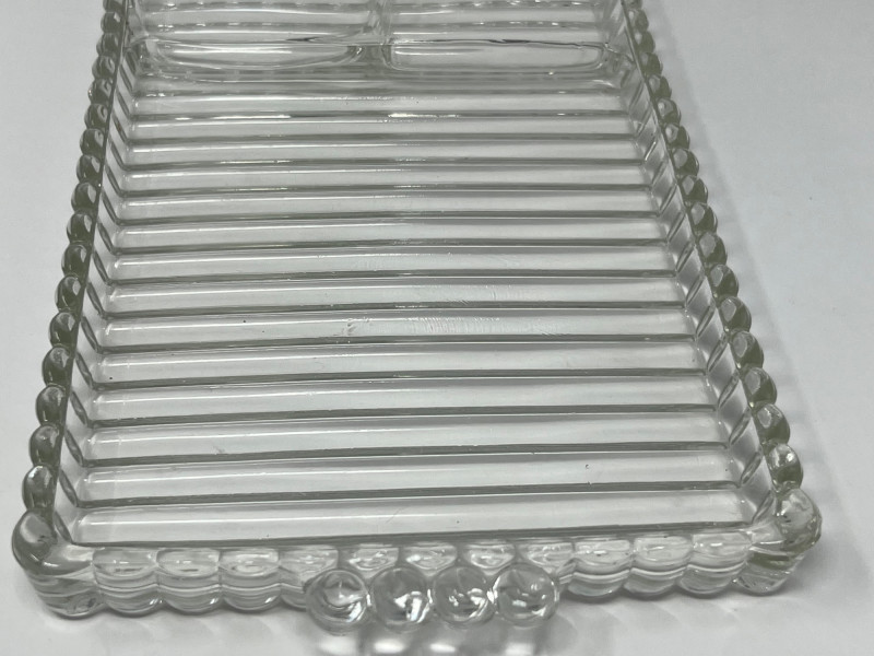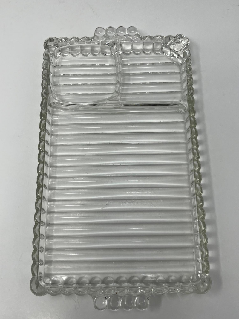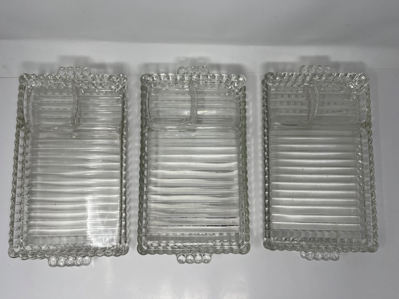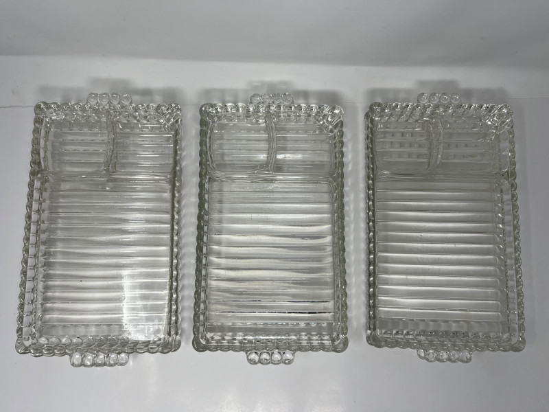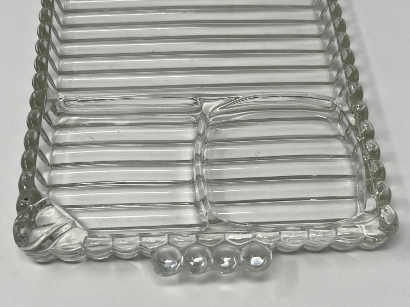 Summary: A trio of vintage Hazel-Atlas Orchard Crystal trays, designed for mid-century entertaining with style and function. Each tray features a ribbed texture, beaded edge, and dual compartments—one for snacks, one for a drink or cigarette. Originally marketed for bridge parties and cocktail hours, these trays embody 1940s–1950s hospitality culture. Elegant, practical, and increasingly collectible. Maker: Hazel-Atlas Glass Company Line: Orchard Crystal Style: Sip, Smoke & Snack Tray (#1305) Material: Pressed crystal-clear glass Dimensions: 11" L × 6" W Era: Late 1940s–1950s Design Features: Wide ribbed texture Beaded tab handles Two compartments (snack + sip/smoke) Condition: Excellent vintage; no chips or cracks notedItem Details