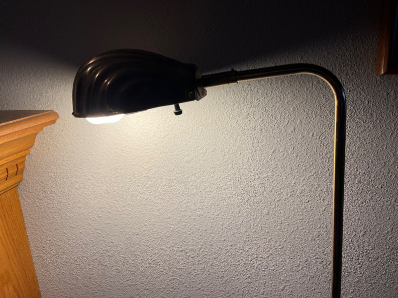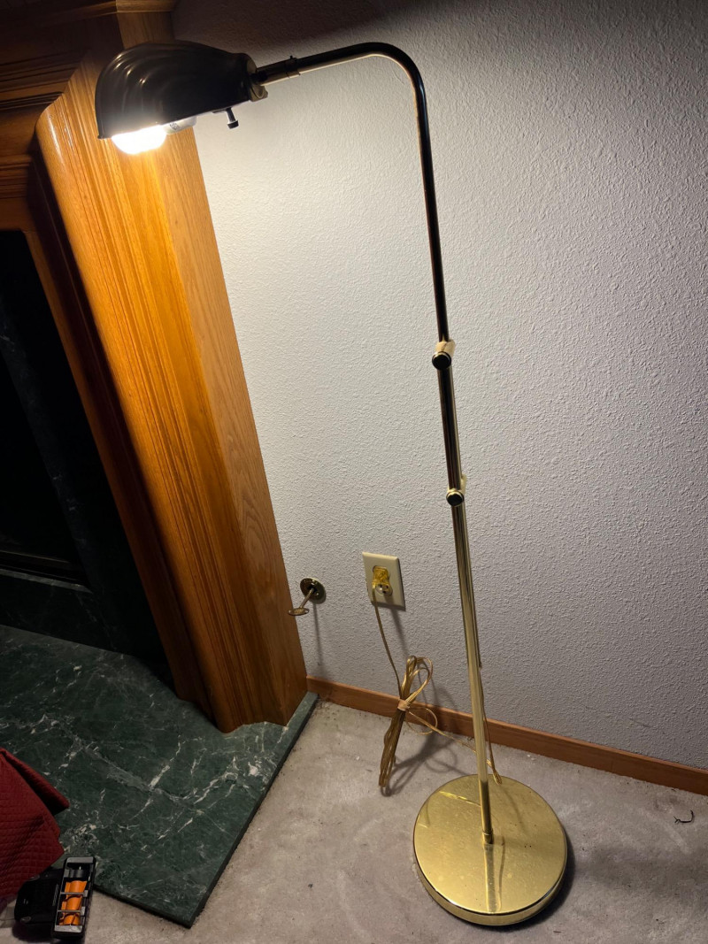 A sleek and sculptural mid-century modern floor lamp in warm brass tones, featuring a dome-shaped metal shade and adjustable arm. The lamp’s minimalist silhouette is anchored by a round weighted base, with a gently arched stem and pivoting head for directional lighting. Ideal for reading nooks, studio spaces, or retro-inspired interiors, this piece blends function with timeless design. Height: 49" Base Diameter: 14" Shade Diameter: Approx. 10" Cord Length: Approx. 6' Brass-finished metal construction Dome-style shade with aged patina Adjustable arm and pivoting head Weighted round base for stability Inline switch on cord Standard bulb socket (bulb not included)Description