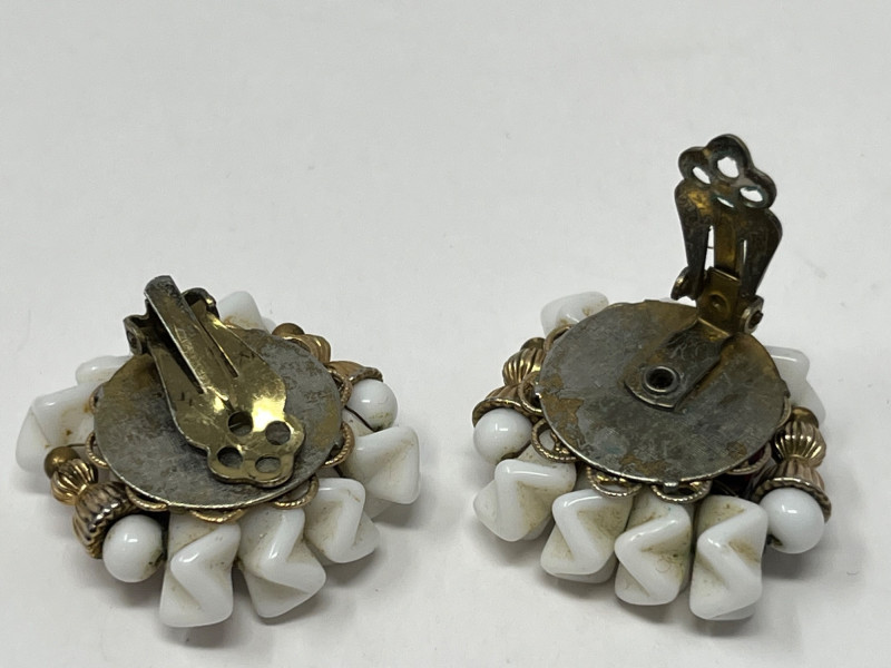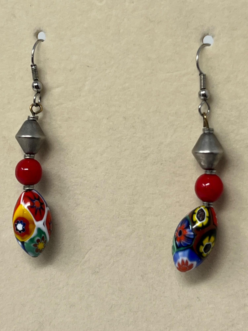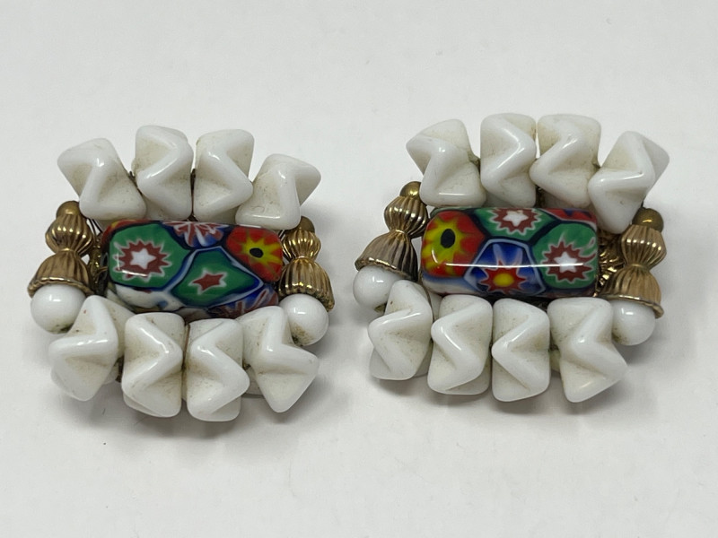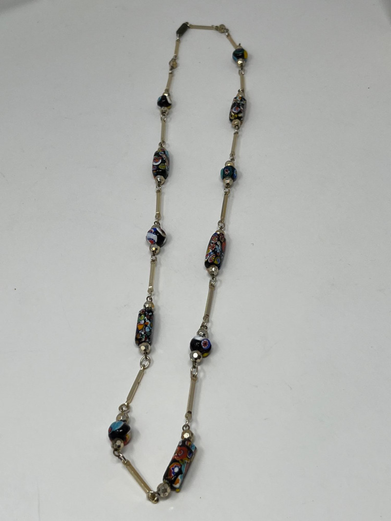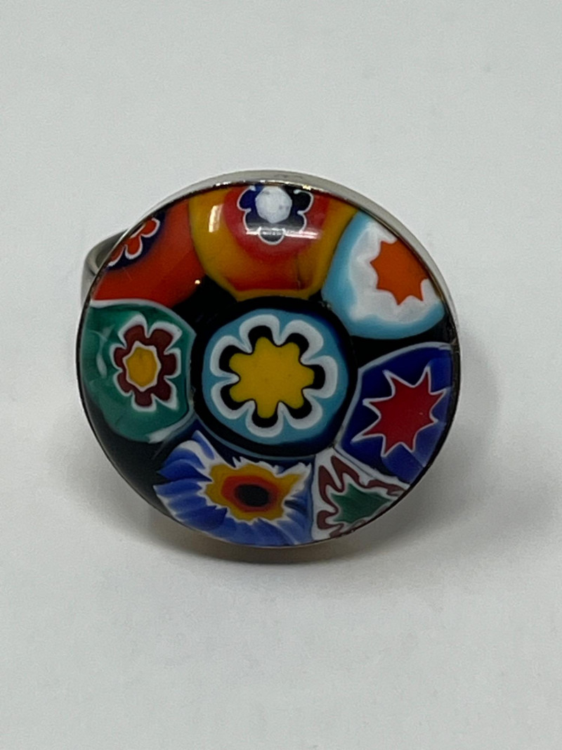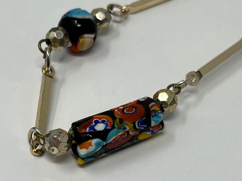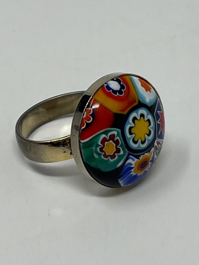 Summary: A coordinated set of vintage-style Murano millefiori jewelry featuring a beaded necklace, clip-on earrings, statement ring, and ornate brooch. Each piece showcases vibrant mosaic glasswork in the millefiori tradition—“a thousand flowers”—with floral and abstract motifs in red, blue, yellow, and green. The necklace alternates elongated metal links with oval millefiori beads, while the earrings combine petal-like white elements with dangling glass drops. The ring and brooch echo the same palette, offering a unified and eye-catching suite ideal for collectors or statement wearers. Maker: Murano-style (likely handmade; studio not marked) Material: Millefiori glass, metal alloy findings Components: Necklace: Approx. 18" L, alternating metal and millefiori beads Earrings: Clip-on, approx. 2" drop Ring: Adjustable band, round millefiori top Brooch: Oval millefiori cabochon in vintage-style metal frame Era: Contemporary handmade or late 20th century Condition: Excellent; no chips or cracks notedItem Details