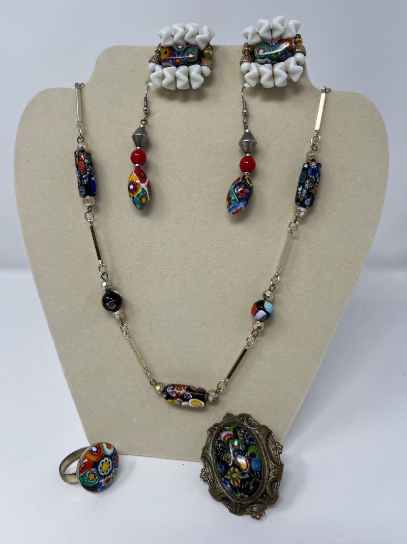 Lot # 68 - Murano Millefiori Jewelry Ensemble – Necklace, Earrings, Ring & Brooch