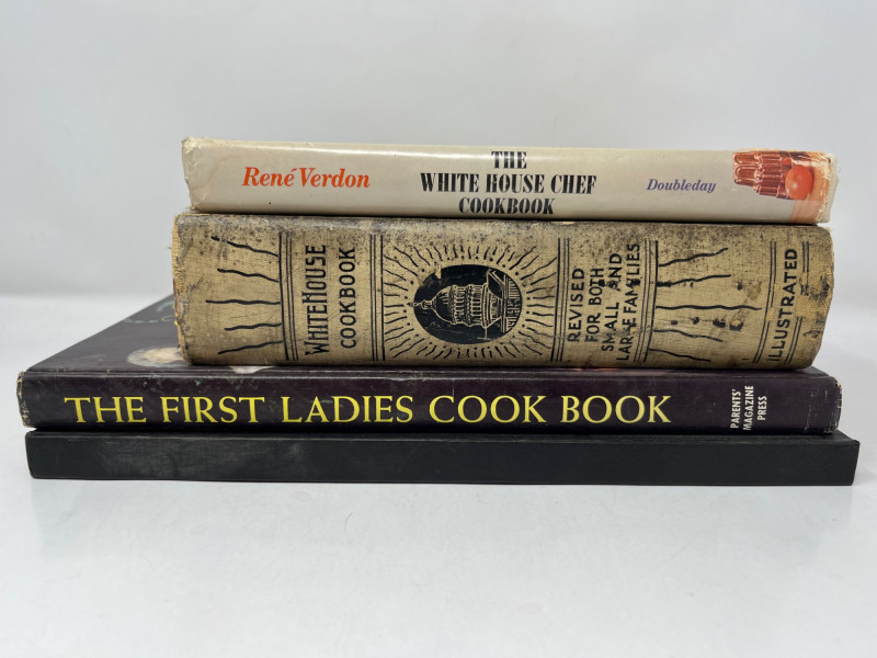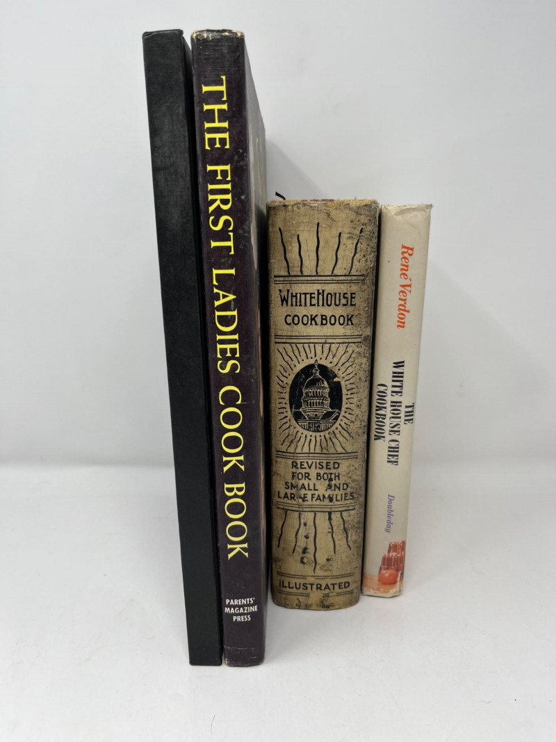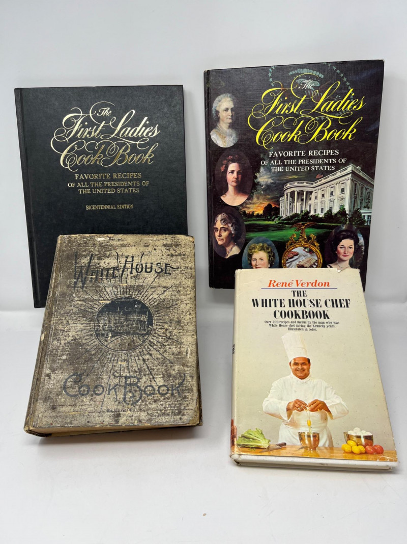 The First Ladies Cook Book – Bicentennial Edition Black cover with gold script Recipes and entertaining notes from First Ladies Hardcover, approx. 9.5" × 6.5" The First Ladies Cook Book – Illustrated Edition Colorful cover with portraits and White House imagery Expanded content with historical context Hardcover, approx. 10" × 7" The White House Cook Book Vintage edition with faded illustrated cover Recipes, household tips, and formal menus Hardcover, approx. 9" × 6" The White House Chef Cookbook – René Verdon Photographic cover featuring the chef Personal anecdotes and refined recipes from JFK’s chef Hardcover, approx. 10" × 7"Included Titles