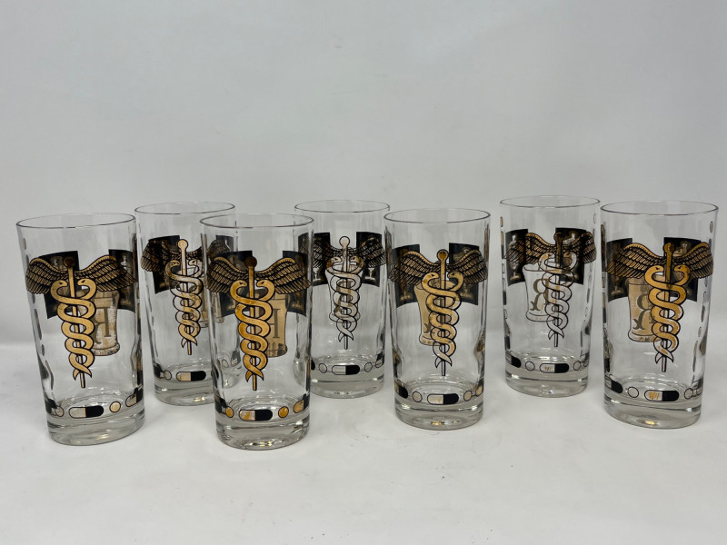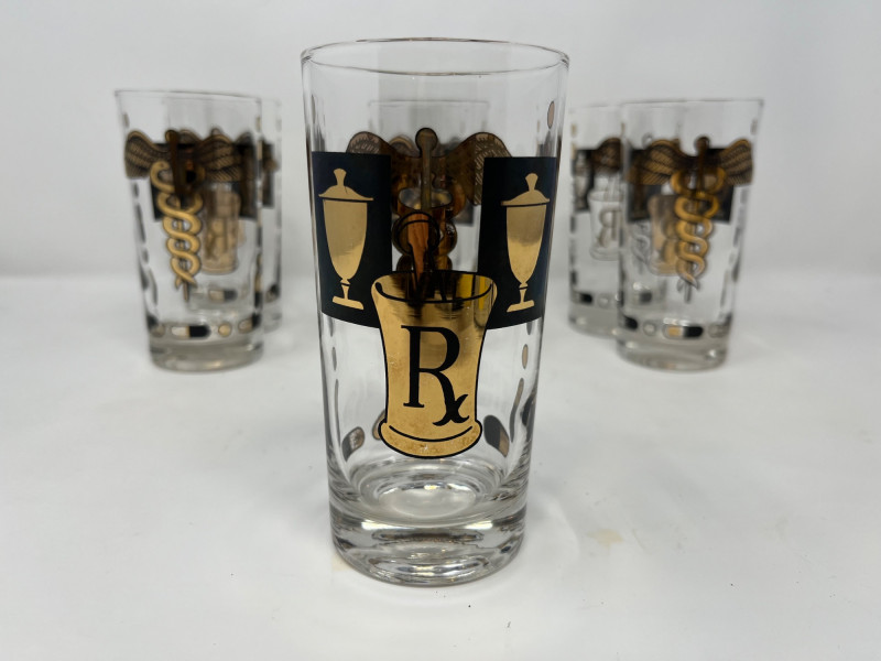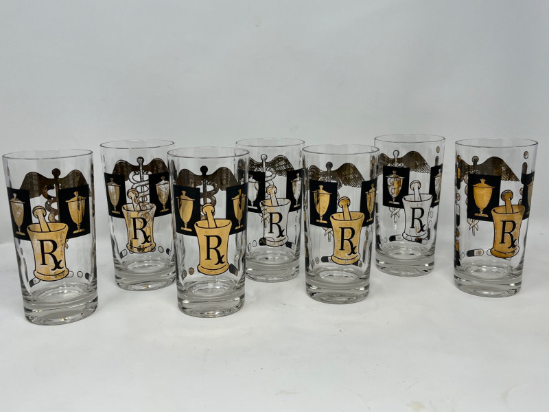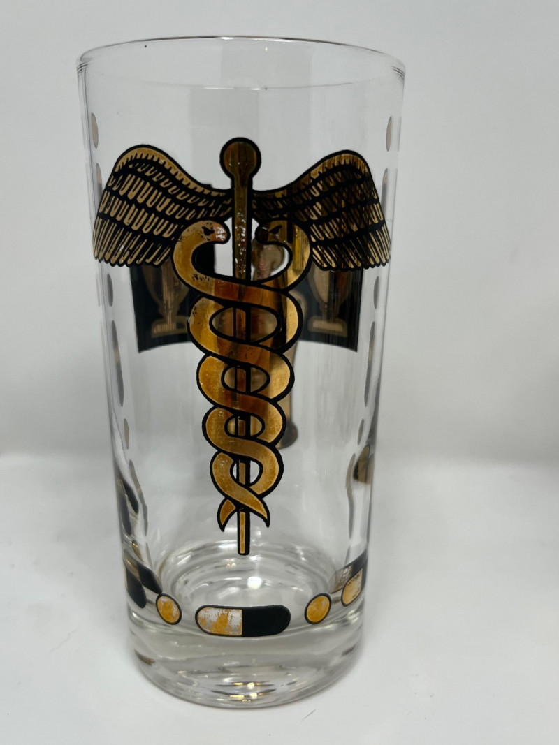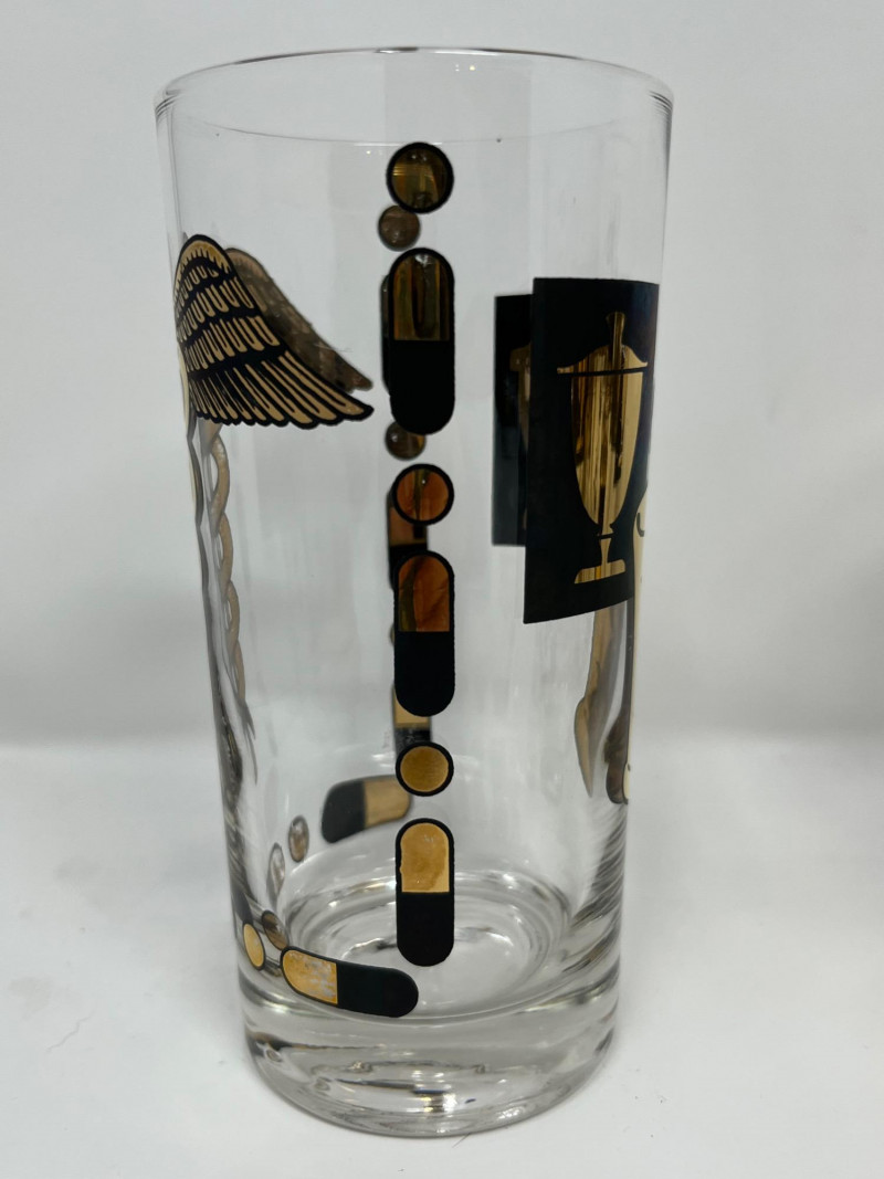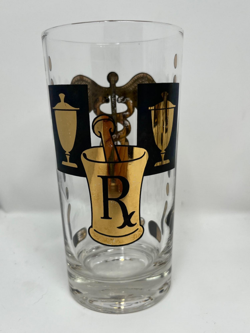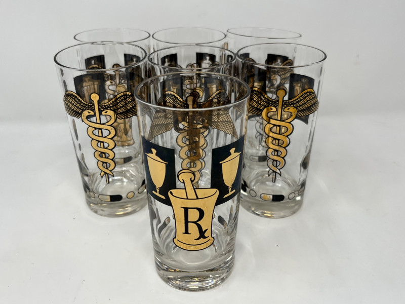 A bold and collectible set of seven vintage drinking glasses featuring black and gold medical motifs, including caduceus staffs, Rx mortar-and-pestles, and apothecary jars. These mid-century tumblers blend professional pride with retro barware flair—ideal for pharmacists, medical historians, or anyone seeking a conversation-starting set. The crisp graphics and metallic accents make this set a standout in any cabinet or cocktail setup. (7) Matching Tumblers Clear glass with printed black and gold medical symbols Approx. 5.5" tall × 3" diameter each Molded clear glass Black and gold enamel graphics Caduceus, Rx mortar, and apothecary jar motifs Likely mid-century American production (unmarked) Hand-wash recommended to preserve metallic detailingDescription