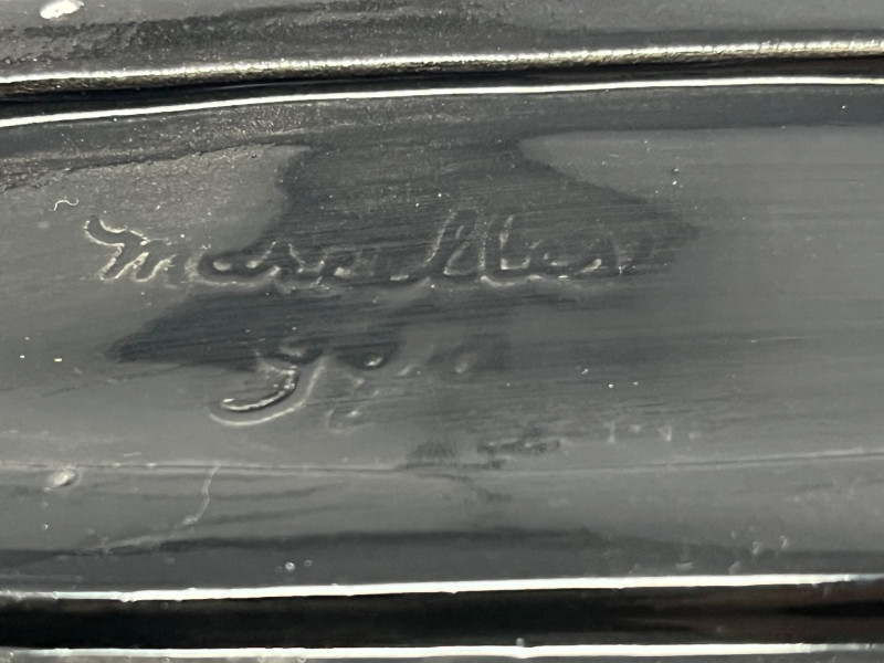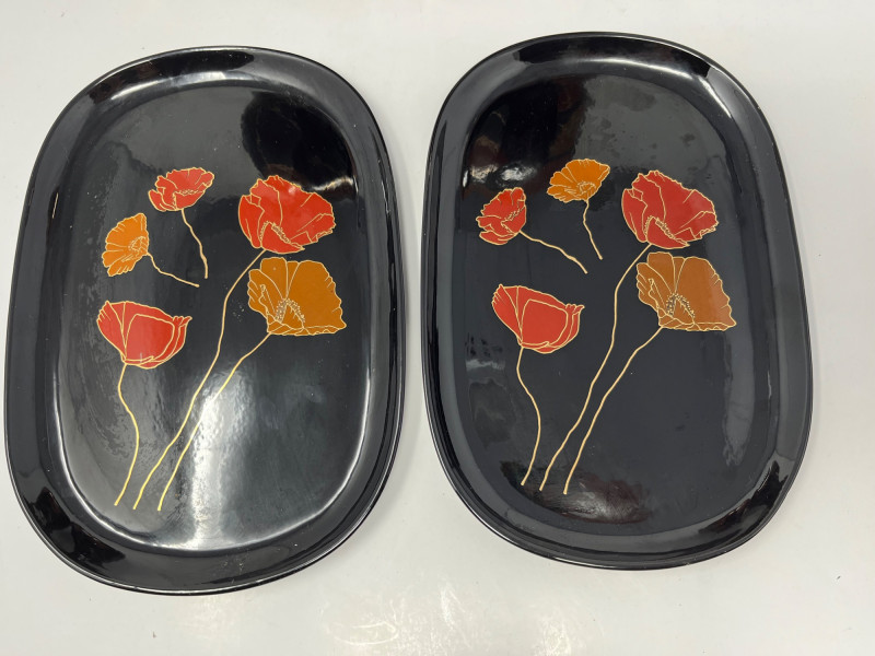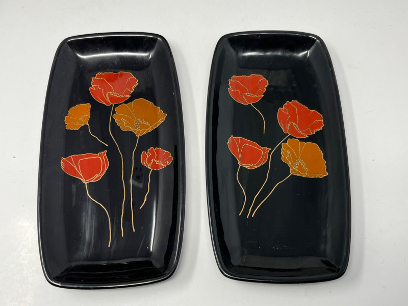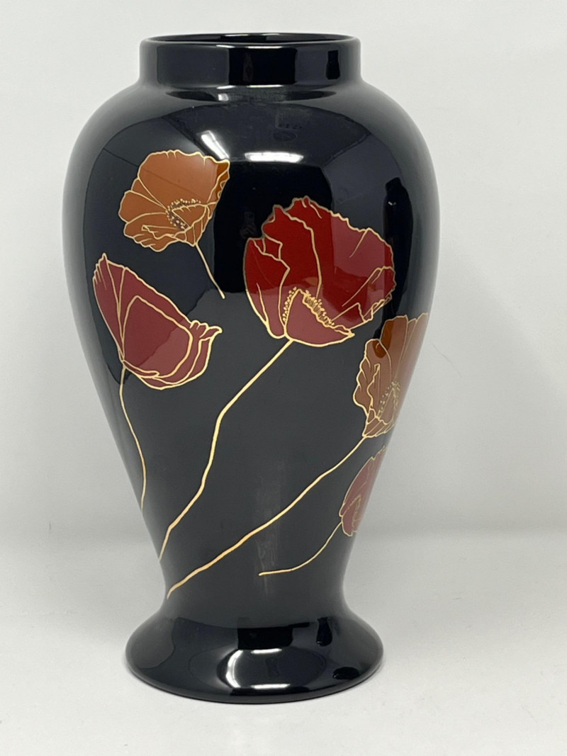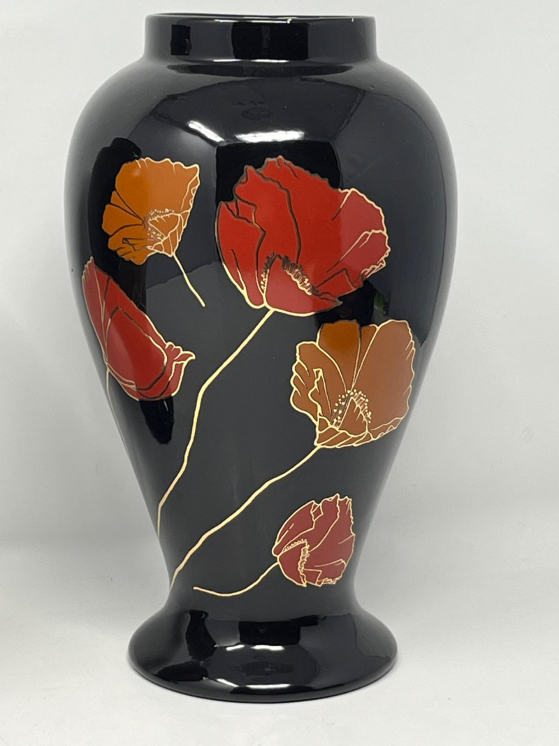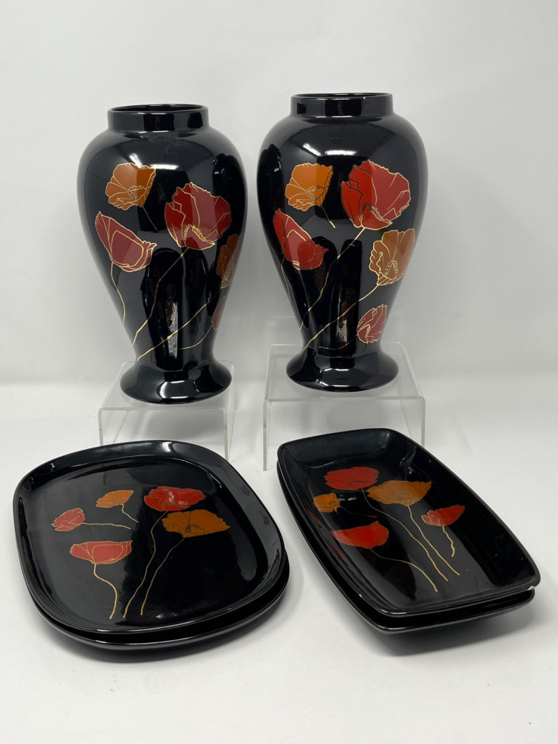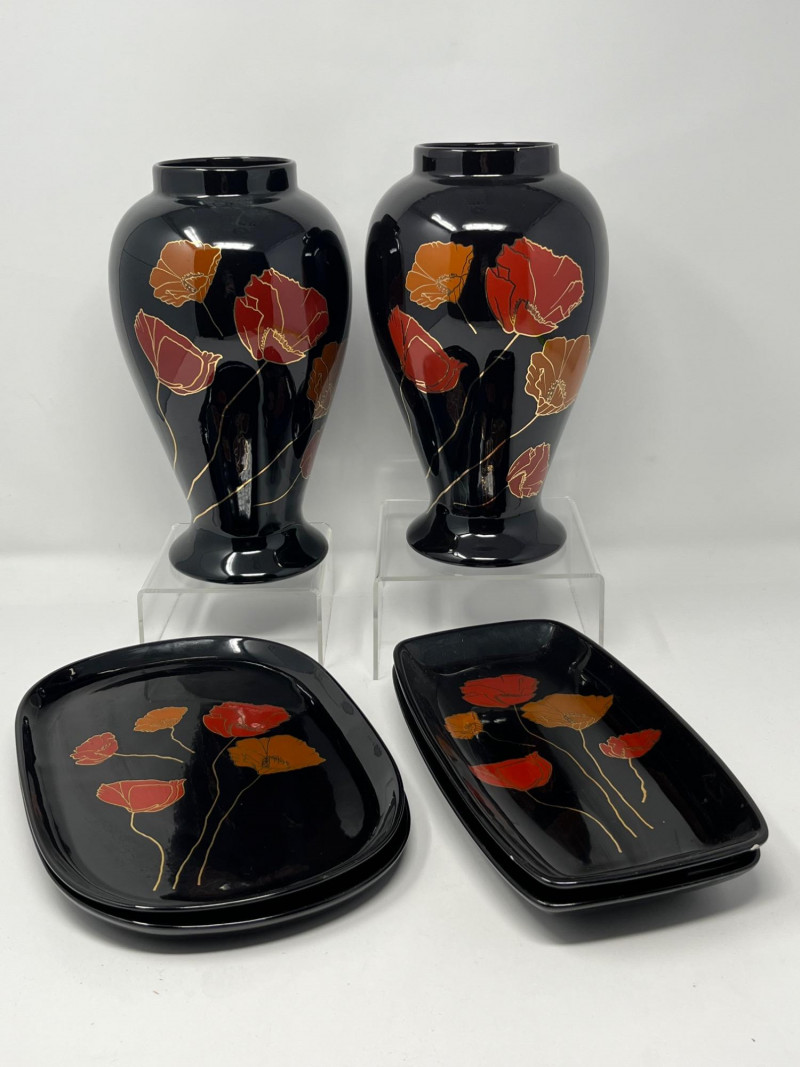 Summary: A dramatic and elegant set of black-glazed ceramic featuring two tall vases and two rectangular trays, each adorned with vivid red and orange poppies outlined in gold. The glossy finish and stylized floral design evoke mid-century Japanese export ware or contemporary studio pottery with Art Nouveau influence. Displayed on clear stands, these pieces offer bold contrast and botanical charm—ideal for collectors of floral ceramics or statement decor. Maker: Unmarked (possibly Japanese export or studio pottery) Material: Glazed ceramic Color: Black base with red/orange poppy motif and gold detailing Dimensions: Vases: Approx. 12" H × 4" W Trays: Approx. 10" L × 5" W Design Features: Stylized poppy flowers Gold outlines and accents Glossy black glaze Era: Likely 1970s–1990s Condition: Excellent; no chips or cracks notedItem Details