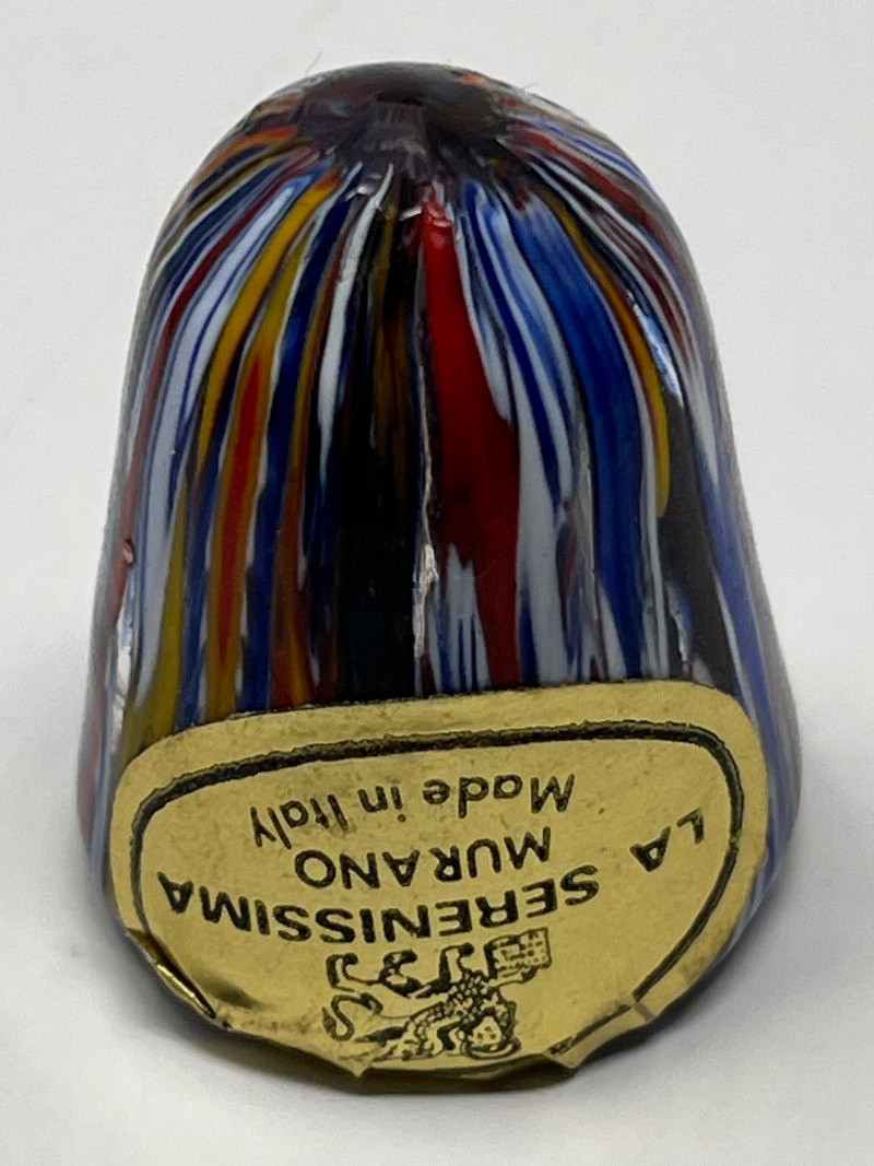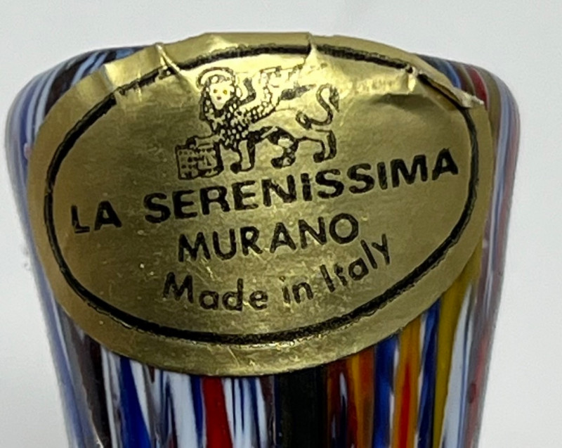 Summary: A vibrant four-piece collection of Murano glass paperweights showcasing millefiori artistry in varied forms. The standout is a cone-shaped upright paperweight labeled “La Serenissima Murano – Certified Original,” with vertical rainbow striping and classic Venetian craftsmanship. Accompanying it are two dome-style millefiori paperweights—one in warm reds and pinks, the other in cool teals and purples—and a petite clear orb with embedded floral mosaics. A colorful study in form, technique, and Italian glass tradition. Maker: Cone: La Serenissima Murano (certified original) Others: Unmarked Murano studio glass Material: Handblown glass with millefiori technique Color Palette: Multicolor floral and geometric mosaic; cone features vertical rainbow striping Dimensions: Cone: Approx. 3.5" H × 2" W Domes: Approx. 3" diameter Orb: Approx. 2" diameter Era: Late 20th century to early 2000s Condition: Excellent; cone retains original label Item Details