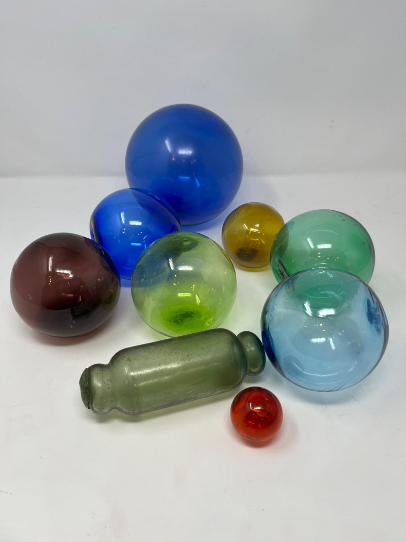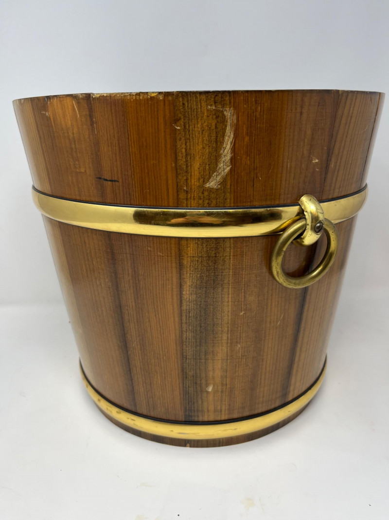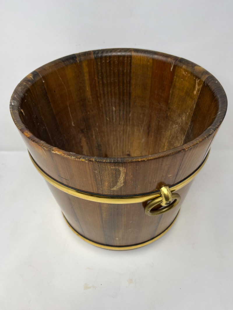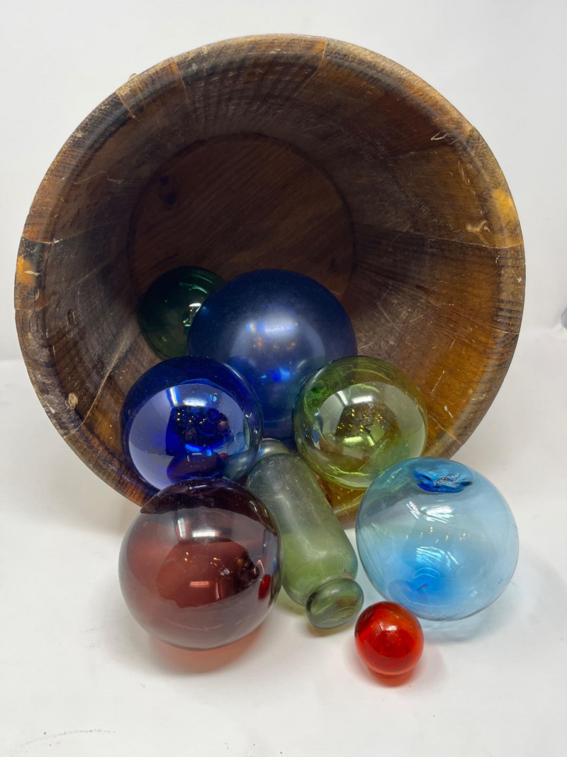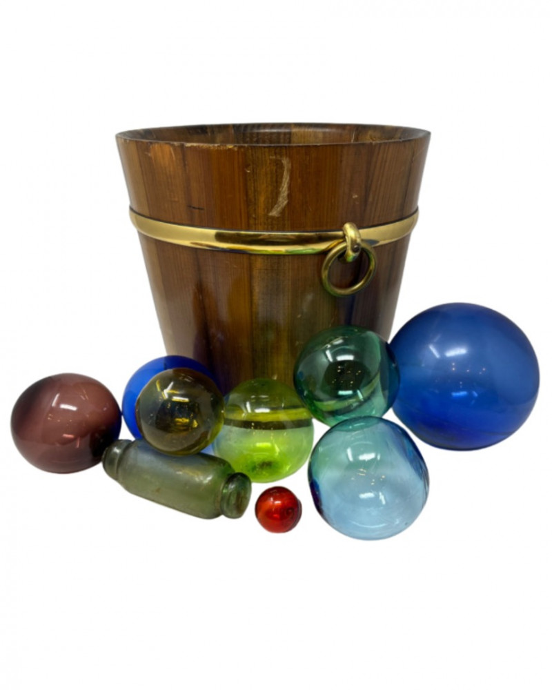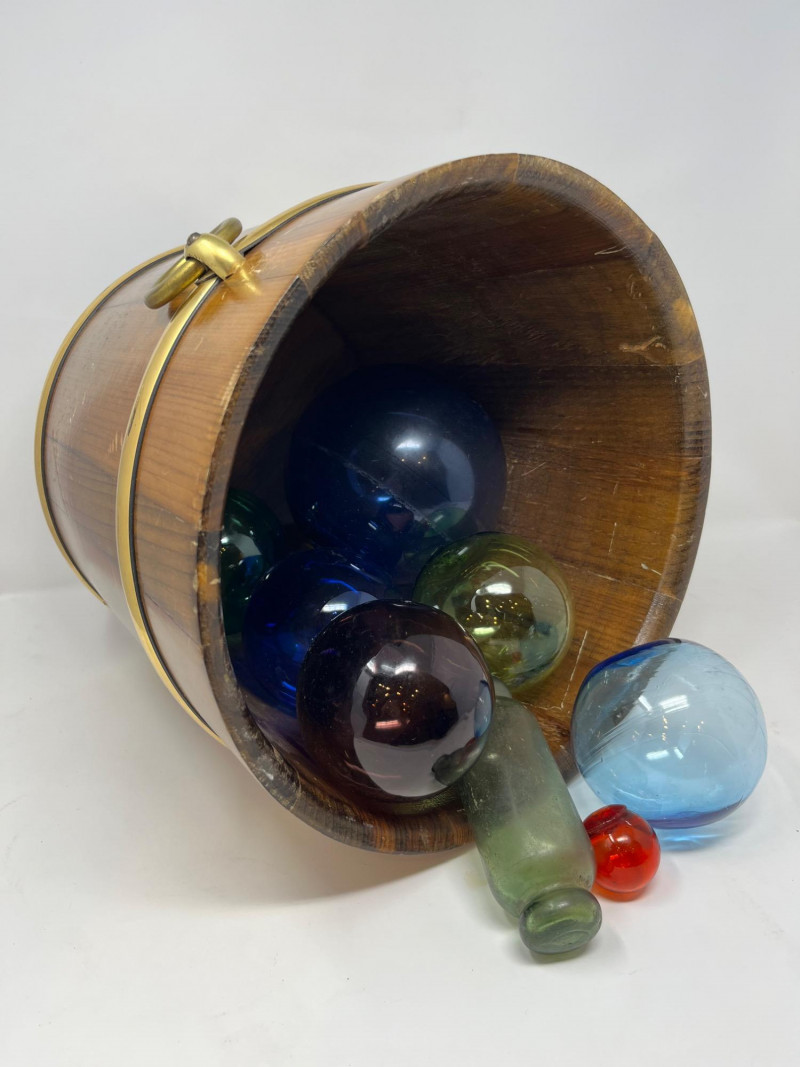 Lot # 101 - MCM Wooden Ice Bucket With Brass Accents & Japanese Fishing Floats
