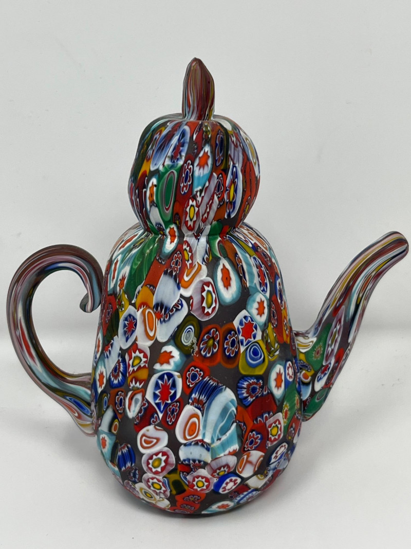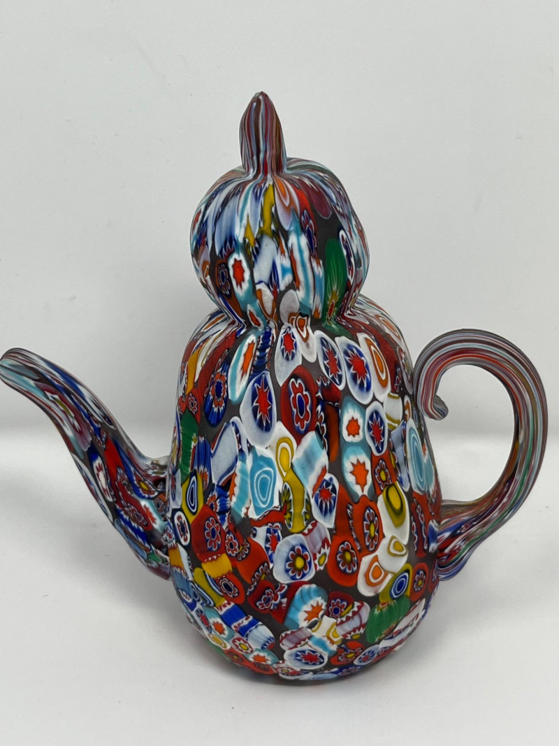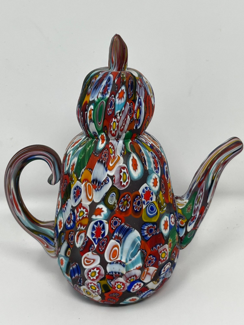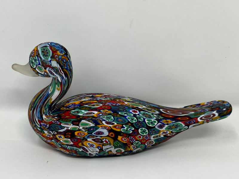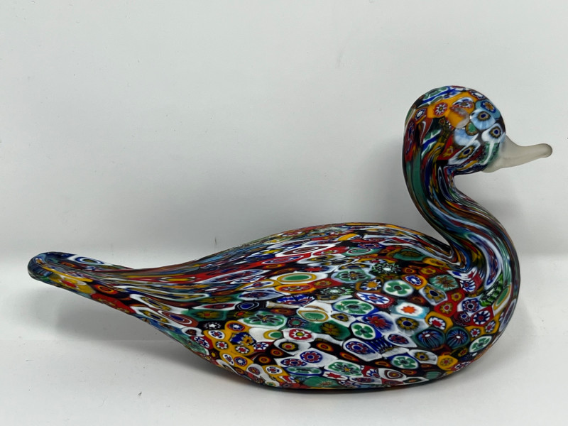Summary: A playful and vibrant trio of Murano glass millefiori pieces featuring a lidded teapot, a stoppered bottle, and a duck-shaped figurine. Each piece showcases intricate mosaic cane work in vivid reds, blues, greens, and yellows. The teapot and bottle offer sculptural charm with functional silhouettes, while the duck adds a touch of whimsy with its stylized form and glossy finish. A delightful blend of Venetian tradition and imaginative form—ideal for collectors of Italian glass or lovers of millefiori artistry. Maker: Murano (likely V. Nason or AVEM; unmarked) Material: Handblown glass with millefiori technique Color Palette: Multicolor floral and geometric mosaic Design Features: Millefiori cane work throughout Teapot with lid and handle Bottle with fitted stopper Duck figurine with stylized form Era: Late 20th century to early 2000s Condition: Excellent; no chips or cracks notedItem Details