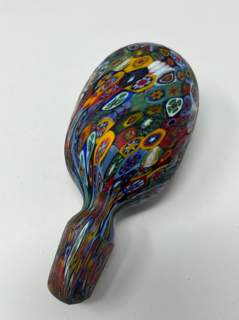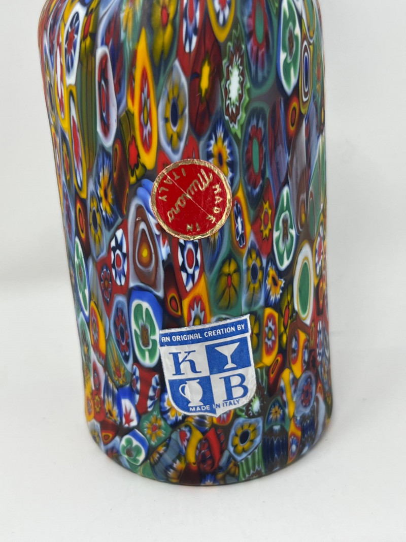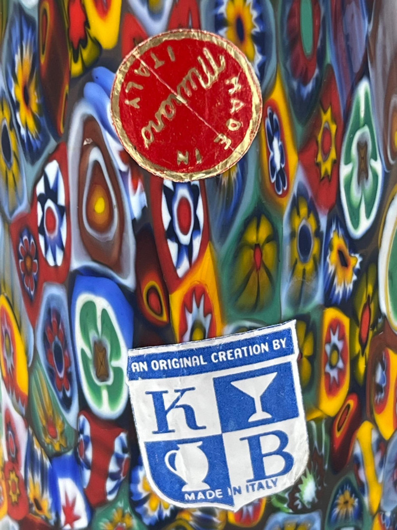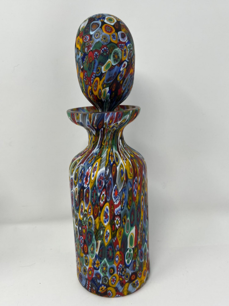 Summary: A playful and vibrant trio of Murano glass millefiori pieces featuring a lidded teapot, a stoppered bottle, and a duck-shaped figurine. Each piece showcases intricate mosaic cane work in vivid reds, blues, greens, and yellows. The teapot and bottle offer sculptural charm with functional silhouettes, while the duck adds a touch of whimsy with its stylized form and glossy finish. A delightful blend of Venetian tradition and imaginative form—ideal for collectors of Italian glass or lovers of millefiori artistry. Maker: Murano (likely V. Nason or AVEM; unmarked) Material: Handblown glass with millefiori technique Color Palette: Multicolor floral and geometric mosaic Design Features: Millefiori cane work throughout Teapot with lid and handle Bottle with fitted stopper Duck figurine with stylized form Era: Late 20th century to early 2000s Condition: Excellent; no chips or cracks notedItem Details