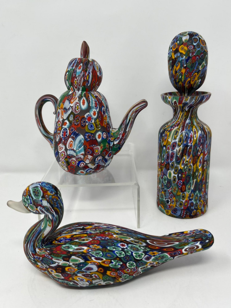 Lot # 102 - Murano Millefiori Trio – Teapot, Stoppered Bottle & Duck Figurine