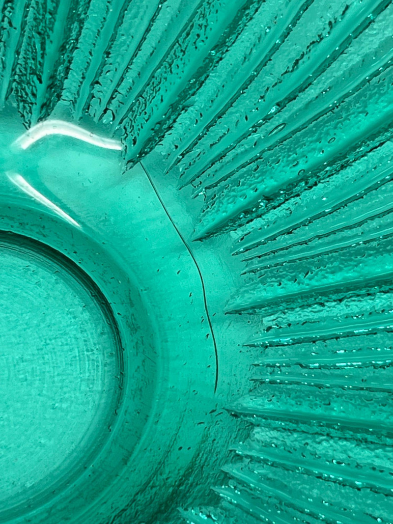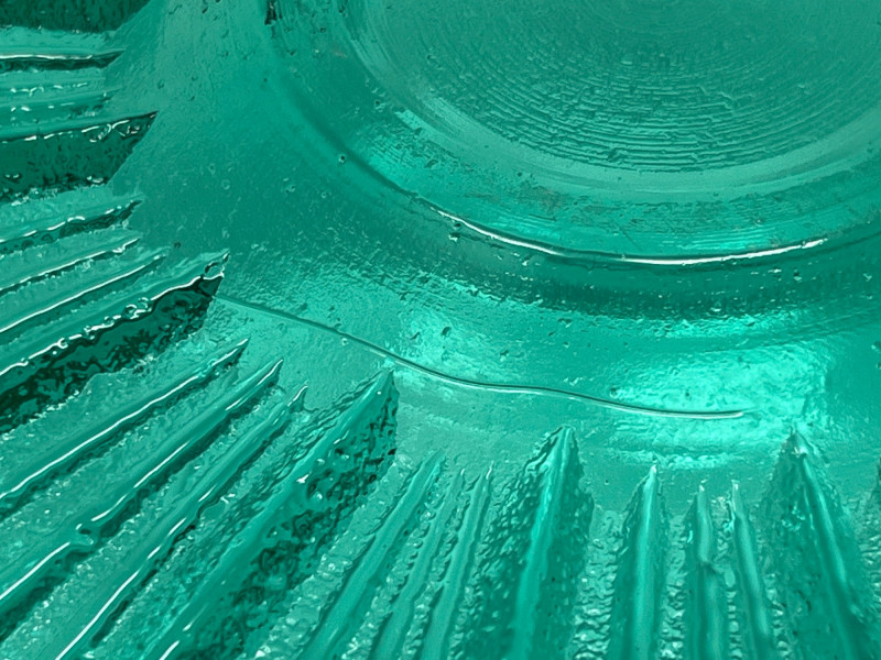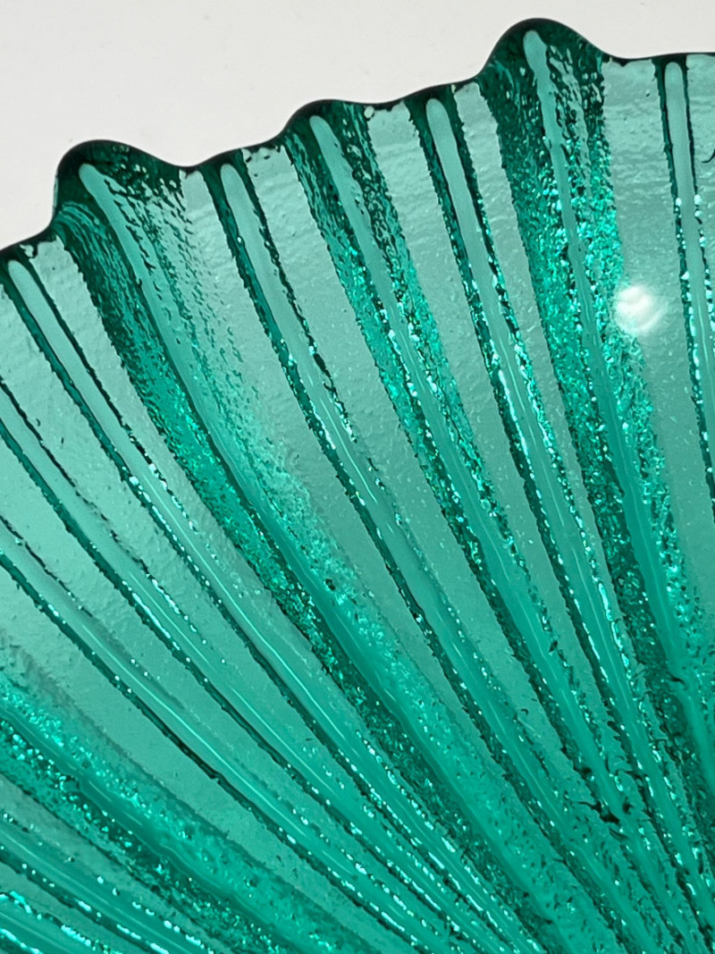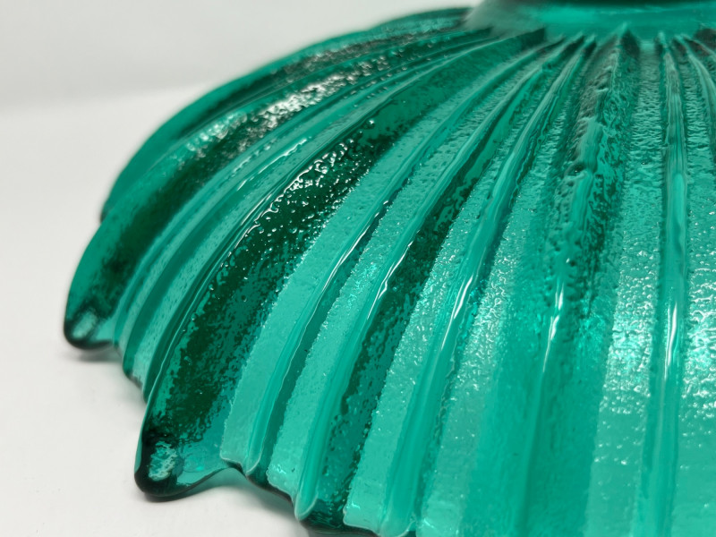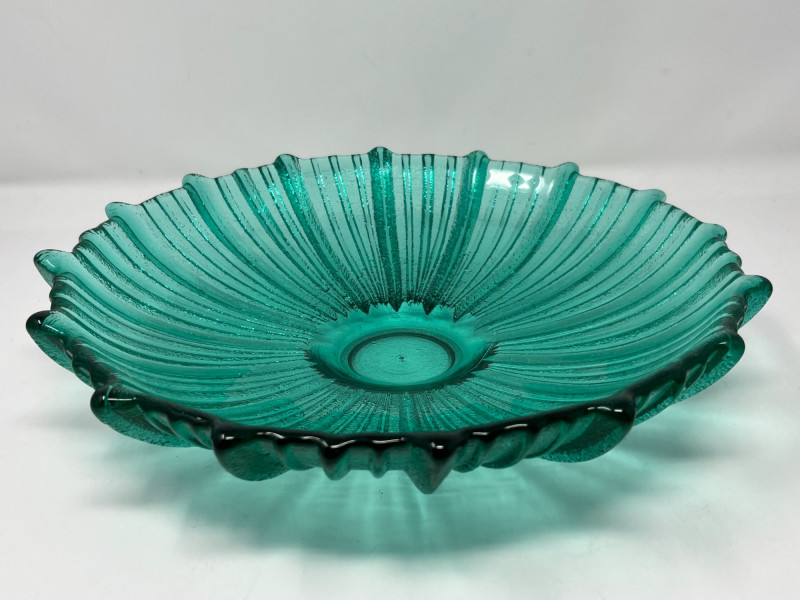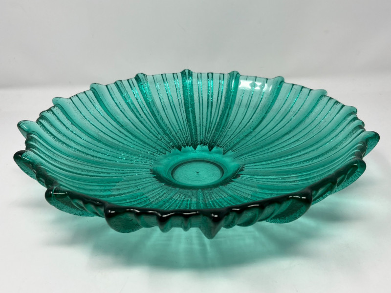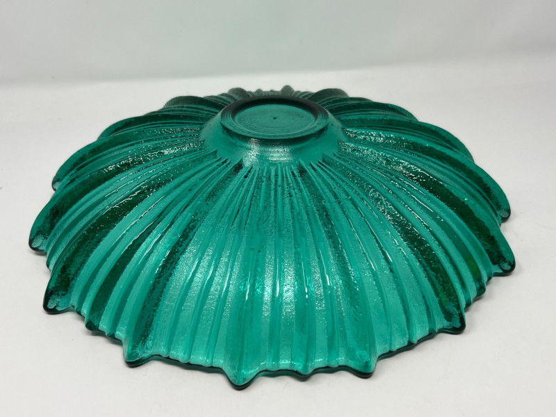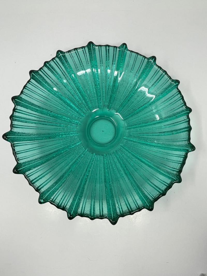 Summary: A vibrant teal glass bowl featuring a scalloped rim and radiating ribbed texture, reminiscent of Blenko’s mid-century floriform and daisy designs. Measuring 13" wide × 3" tall, the bowl’s thick glass and visible bubbles suggest handblown or studio craftsmanship. While unmarked, the form and finish align with Blenko’s signature color palette and organic silhouettes. A striking centerpiece for collectors of American art glass or fans of coastal-toned decor. Maker: Unmarked; attributed style suggests Blenko or Blenko-inspired Material: Handblown or molded glass Color: Teal / Aqua Dimensions: 13" W × 3" H Design Features: Scalloped, wavy rim Ribbed radial texture Thick glass with visible bubbles Era: Likely mid to late 20th century Condition: Excellent; no chips or cracks notedItem Details