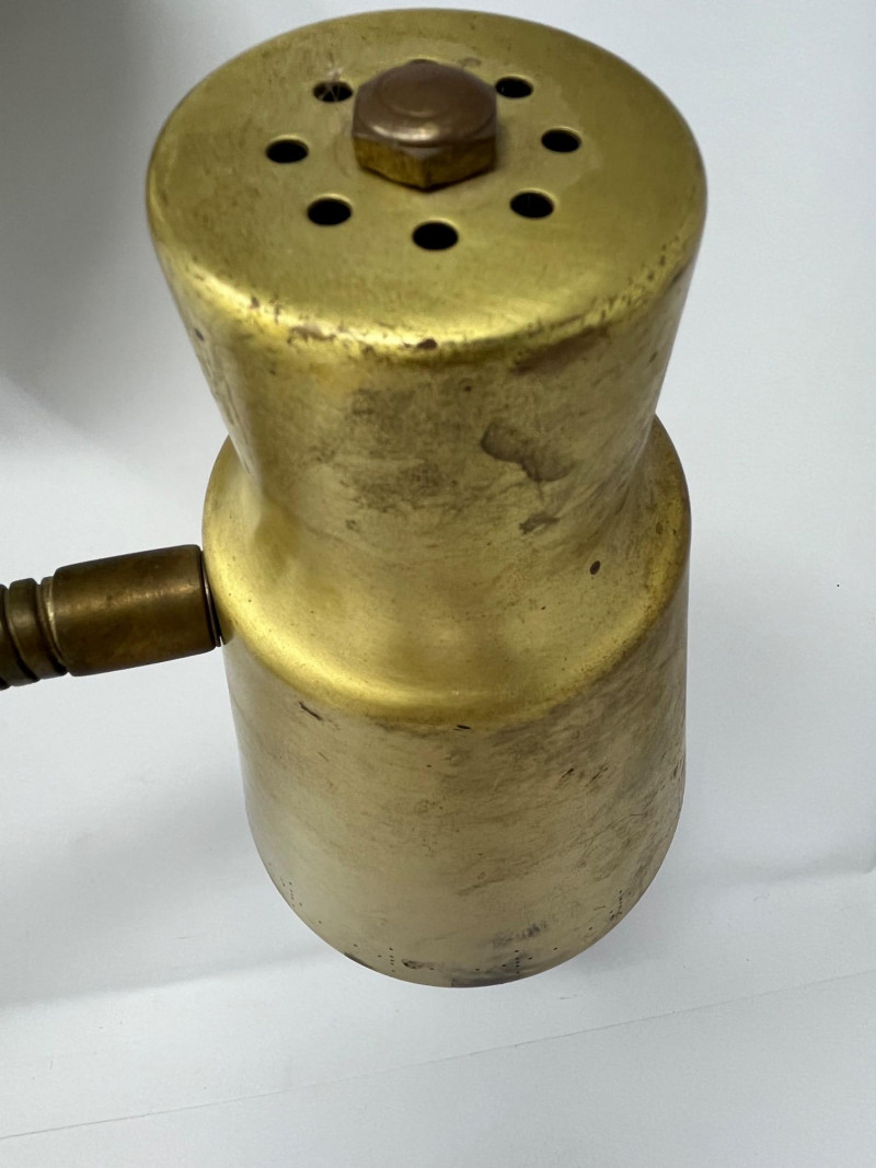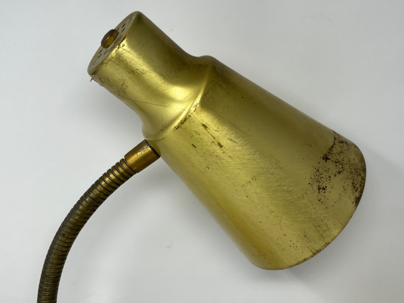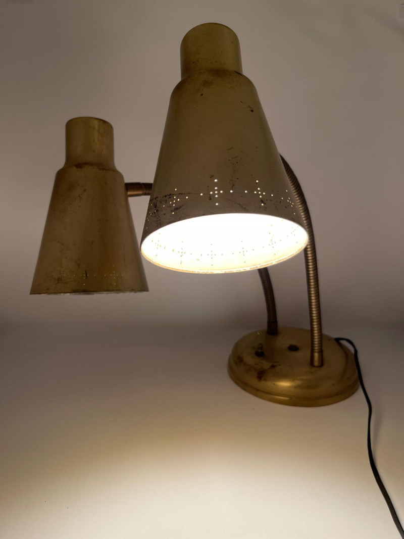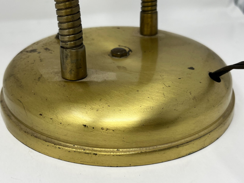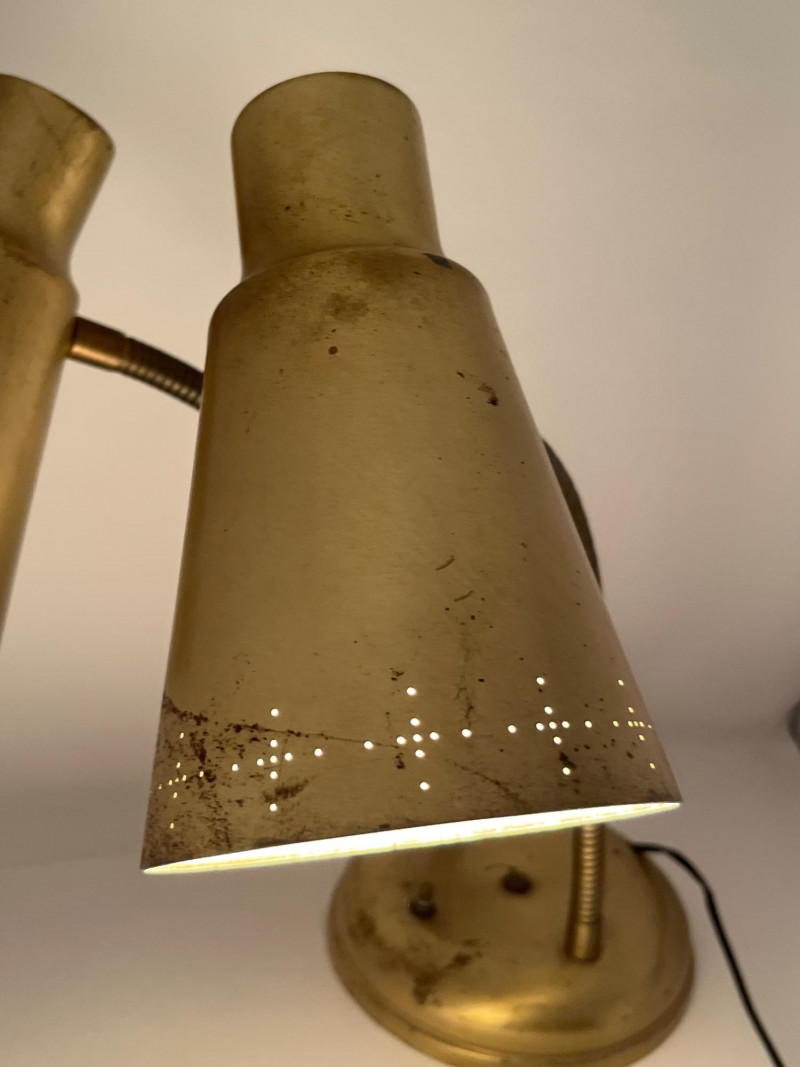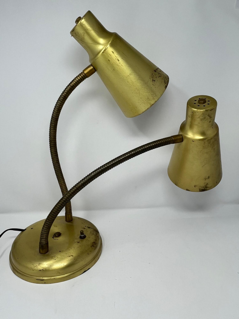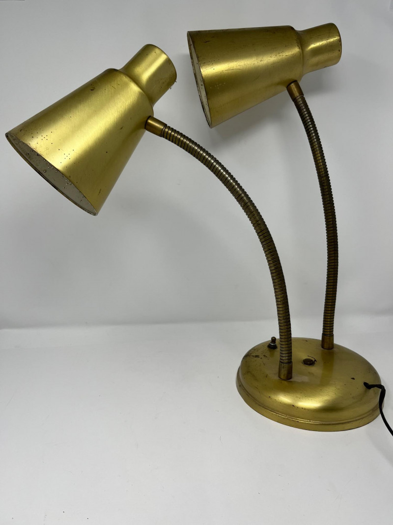 A mid-century brass-finished desk lamp featuring dual adjustable gooseneck arms and conical metal shades. Each lamp head operates independently via its own switch, allowing directional lighting for reading, drafting, or display. The sculptural form and warm patina give this piece timeless appeal—ideal for vintage interiors, office setups, or collectors of retro lighting. Width: Approx. 20" (fully extended) Height: Approx. 18" Base Diameter: Approx. 7" Brass-tone metal construction Dual gooseneck arms with flexible positioning Conical shades with matching finish One individual toggle switch on base Weighted round base for stability Condition: Good vintage; light tarnish and wear consistent with age- one light does not light and may need rewiring.Description