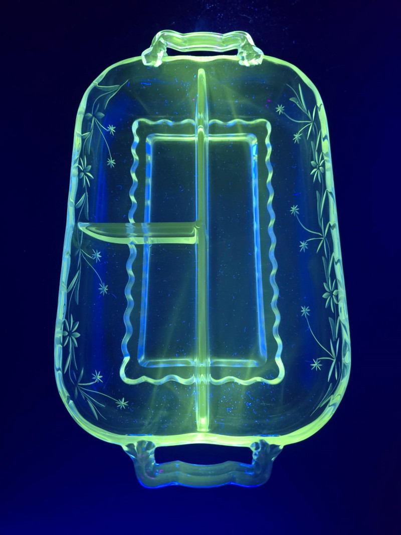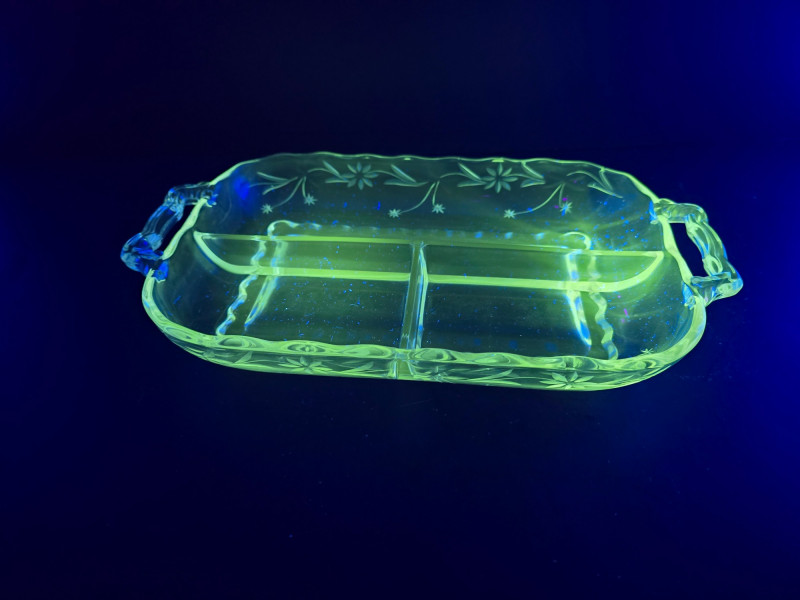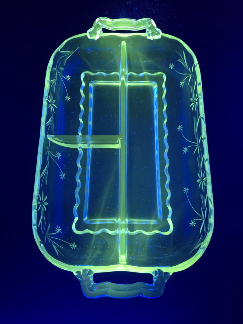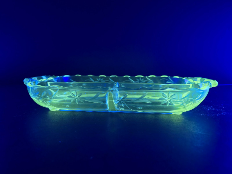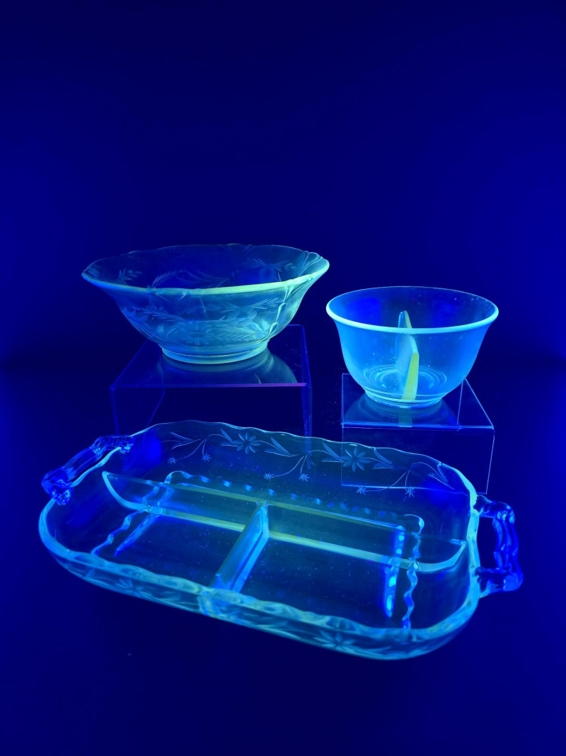 A glowing 3-piece set of vintage uranium glass servingware, each piece fluorescing vividly under UV light. This trio includes a divided serving tray with floral motifs, a two-part bowl with smooth finish, and a round bowl etched with delicate floral designs. Together, they offer a striking blend of Depression-era charm and atomic-age glow—ideal for collectors, entertainers, or display stylists seeking vintage glass with personality. (1) Divided Serving Tray – Three compartments, floral etched motifs (1) Divided Bowl – Smooth finish, no design, two equal sections (1) Round Bowl – Floral etched design, classic form Tray: 10" L × 6" W Divided Bowl: 8.5" L × 5.5" W × 2.5" H Etched Bowl: 8" D × 3.5" H Description