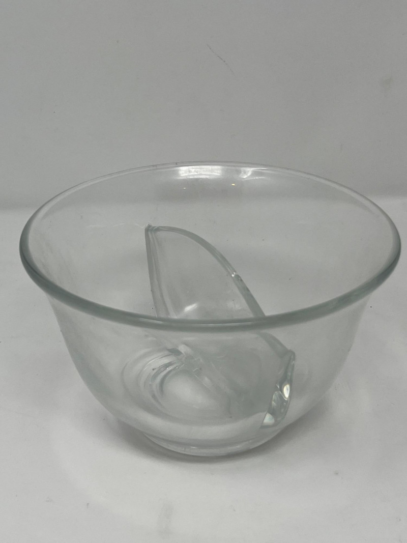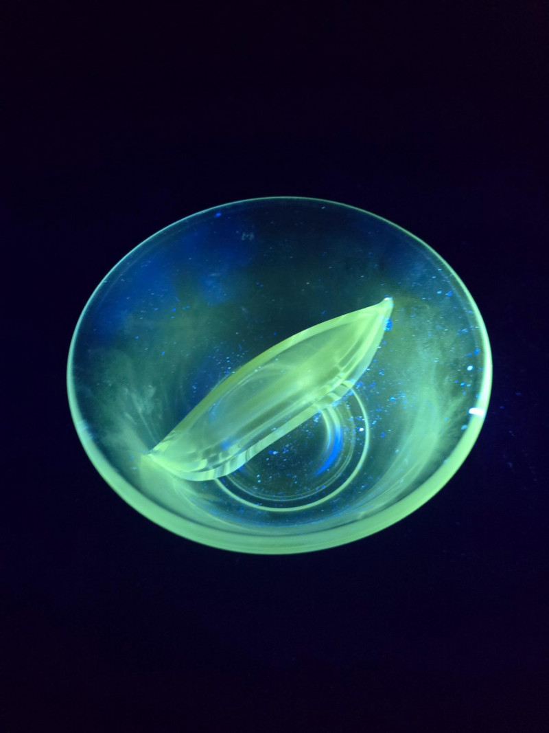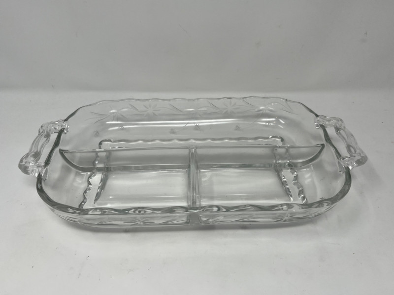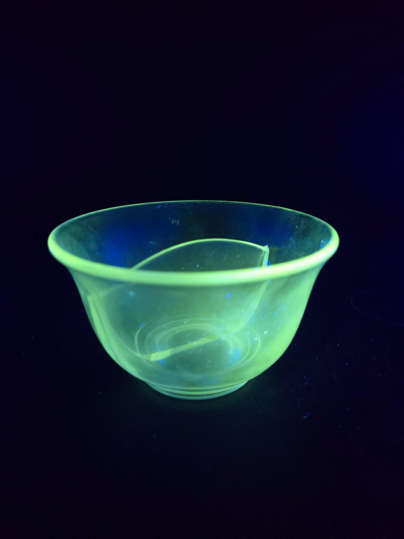 A glowing 3-piece set of vintage uranium glass servingware, each piece fluorescing vividly under UV light. This trio includes a divided serving tray with floral motifs, a two-part bowl with smooth finish, and a round bowl etched with delicate floral designs. Together, they offer a striking blend of Depression-era charm and atomic-age glow—ideal for collectors, entertainers, or display stylists seeking vintage glass with personality. (1) Divided Serving Tray – Three compartments, floral etched motifs (1) Divided Bowl – Smooth finish, no design, two equal sections (1) Round Bowl – Floral etched design, classic form Tray: 10" L × 6" W Divided Bowl: 8.5" L × 5.5" W × 2.5" H Etched Bowl: 8" D × 3.5" H Description