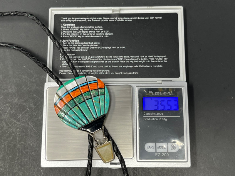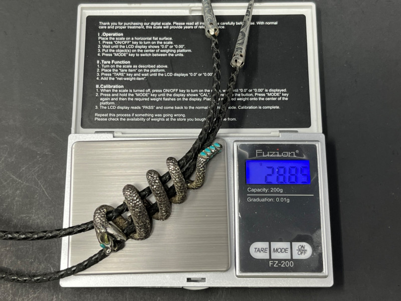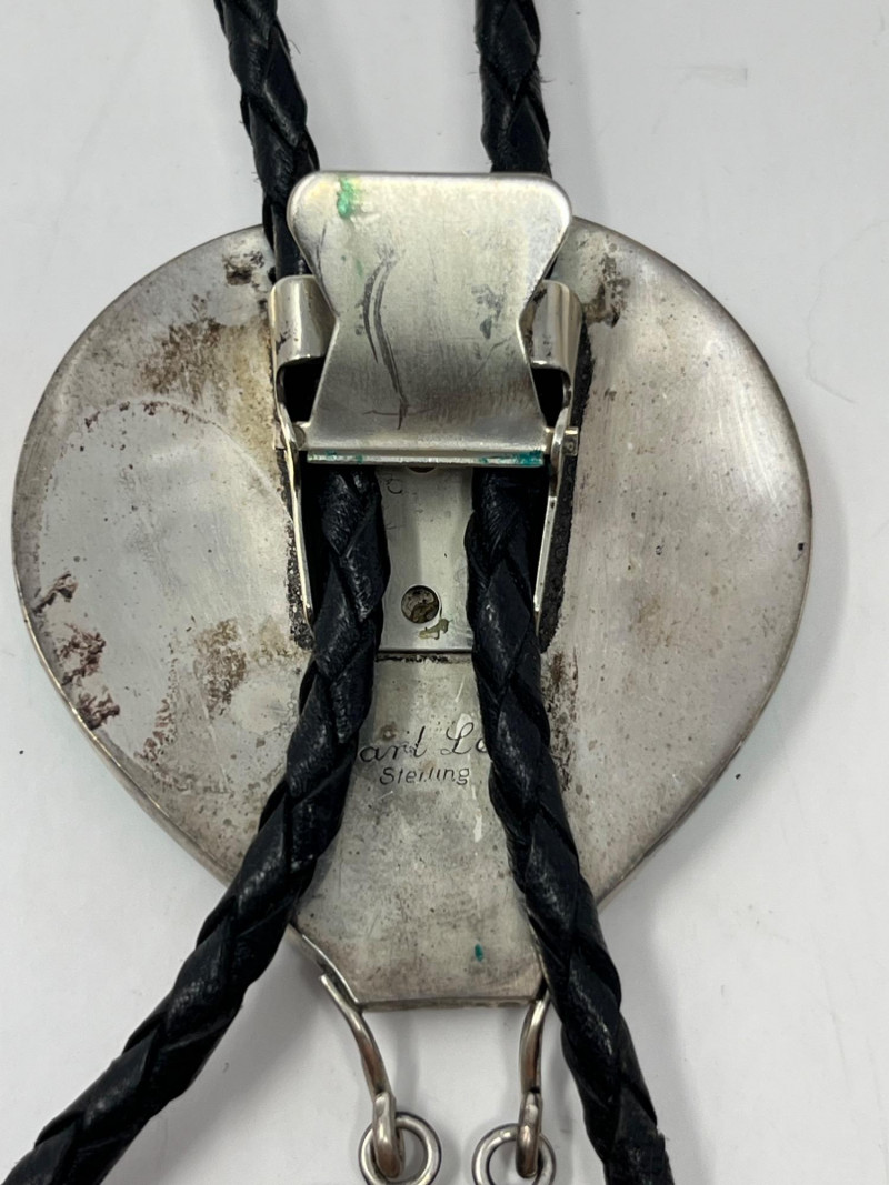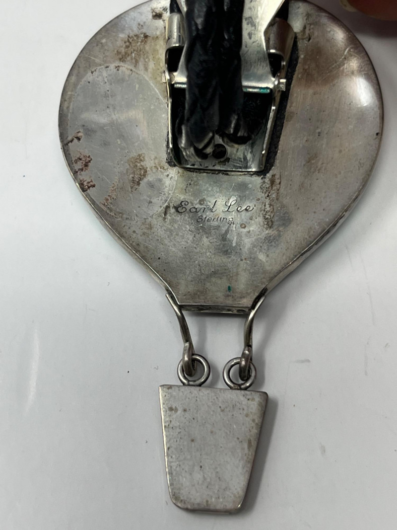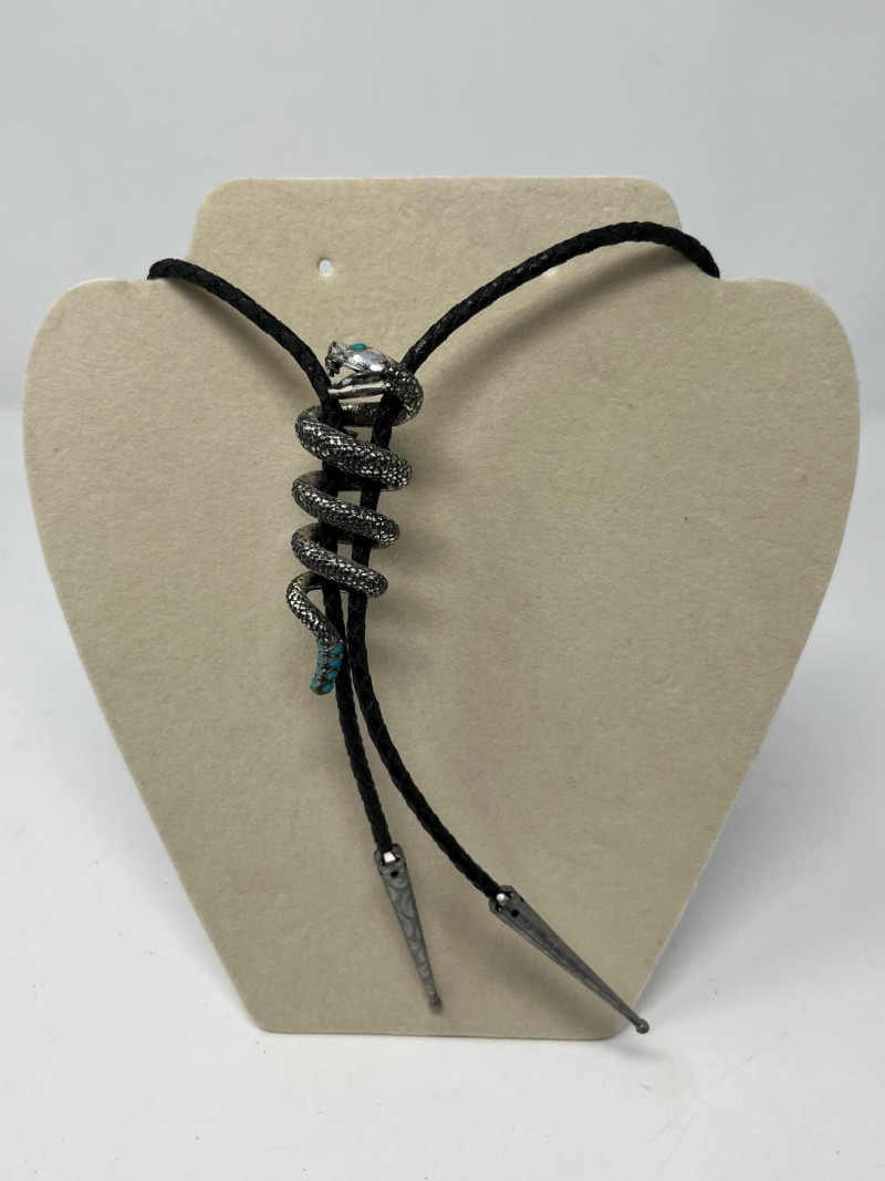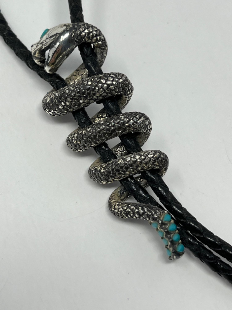 A bold and collectible pair of vintage bolo ties featuring sterling silver craftsmanship and Southwestern flair. This lot includes one hot air balloon bolo with vibrant inlay and shield detail, and one coiled snake bolo with a turquoise cabochon set in the serpent’s head. Both are mounted on braided black leather cords with silver-tone tips. Ideal for Western wear collectors, stylists, or anyone drawn to artisan jewelry with personality. Design: Vertical balloon shape with segmented inlay Inlay: Turquoise, orange, black, and silver Detail: Small shield emblem at base Pendant Size: Approx. 1.75" tall × 1.25" wide Cord: Braided black leather, approx. 36" long Tips: Cylindrical silver-tone metal Material: Sterling silver (tested) Condition: Excellent vintage Design: Textured snake wrapped in a circular coil Stone: Turquoise cabochon set in head Pendant Size: Approx. 1.75" diameter Cord: Braided black leather, approx. 36" long Tips: Silver-tone metal with ball-end detail Material: Sterling silver (tested) Condition: Excellent vintage Description