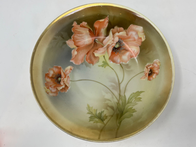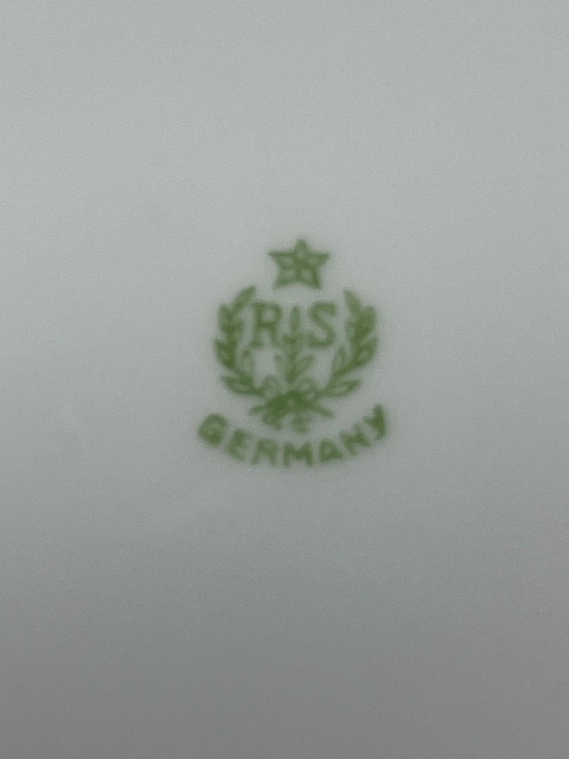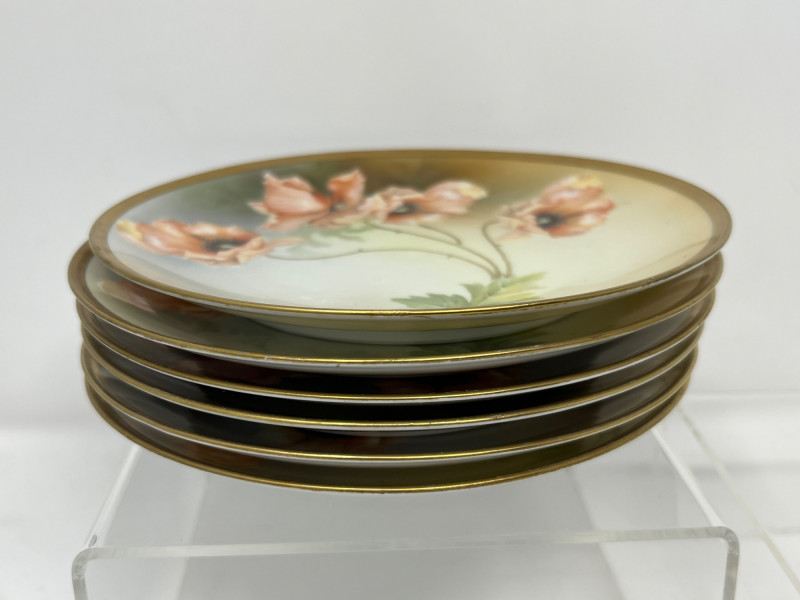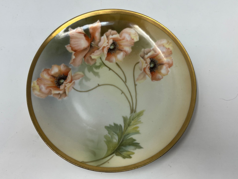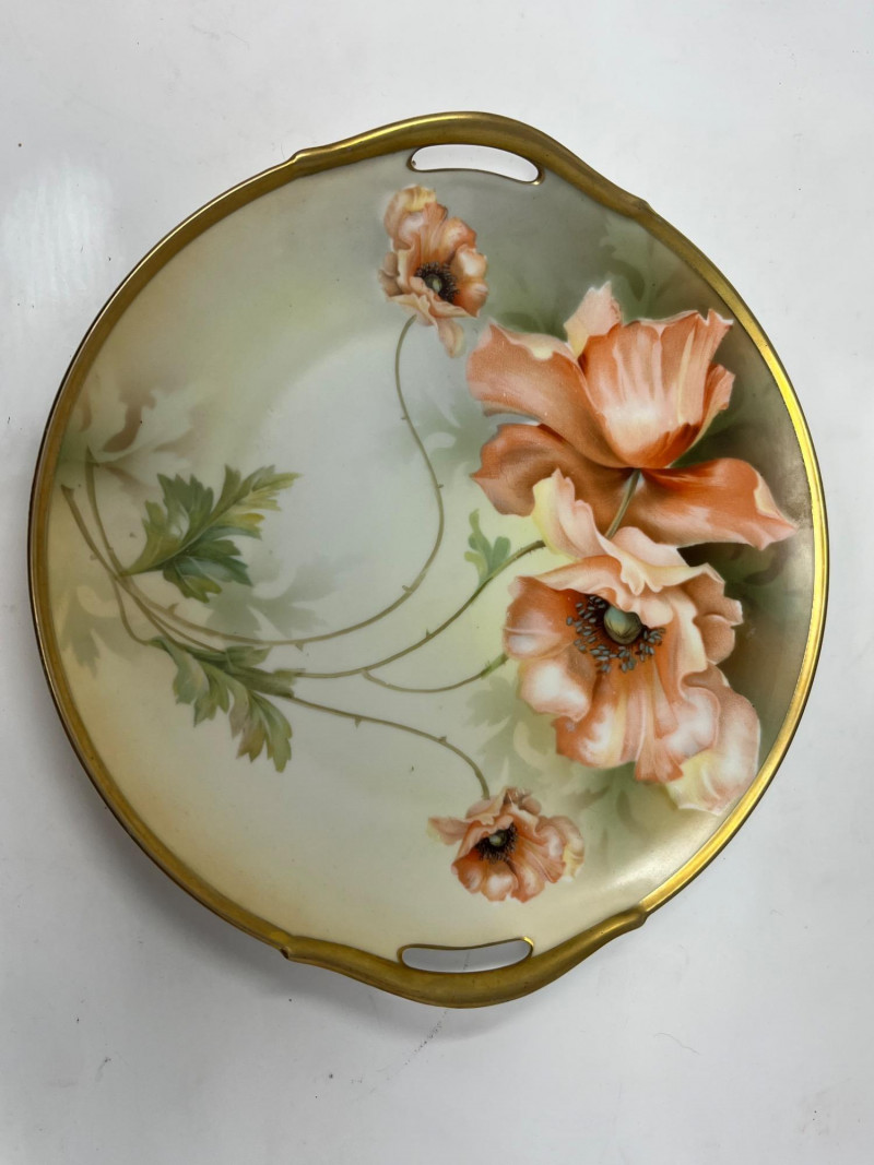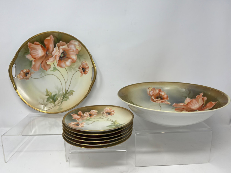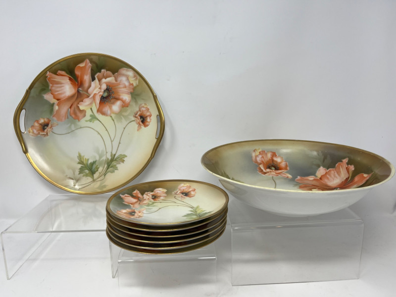 An exquisite 8-piece porcelain serving set from the Reinhold Schlegelmilch Tillowitz factory, featuring hand-painted floral motifs in warm pinks and greens with soft gradient backgrounds and gold-trimmed edges. This grouping includes a handled serving tray, a bowl, and six matching plates, each showcasing the refined artistry and delicate palette associated with RS Germany’s early 20th-century export ware. Ideal for collectors of European porcelain or those curating romantic, vintage table settings. (1) Handled Serving Tray – Oval form with twin gold handles (1) Serving Bowl – Rounded with matching floral motif (6) Matching Plates – Uniform size and design Tray: 13.5" L × 9.5" W × 2" H Bowl: 9" D × 3.5" H Plates: 7.5" D eachDescription