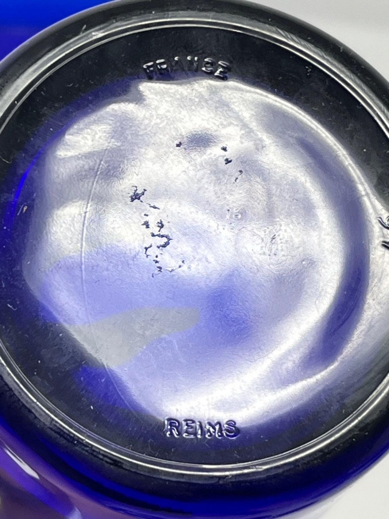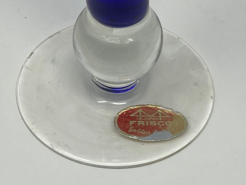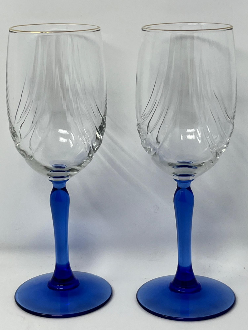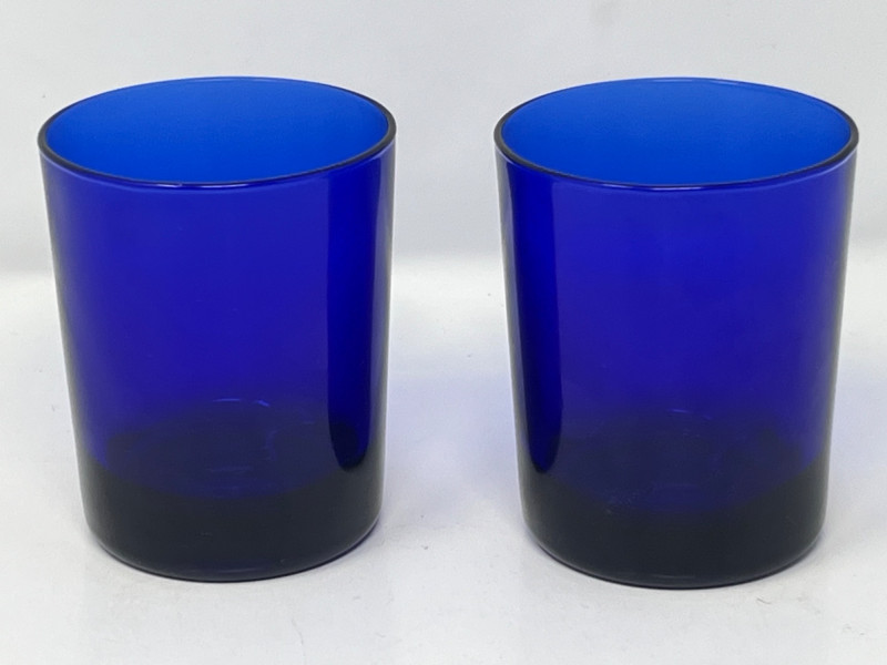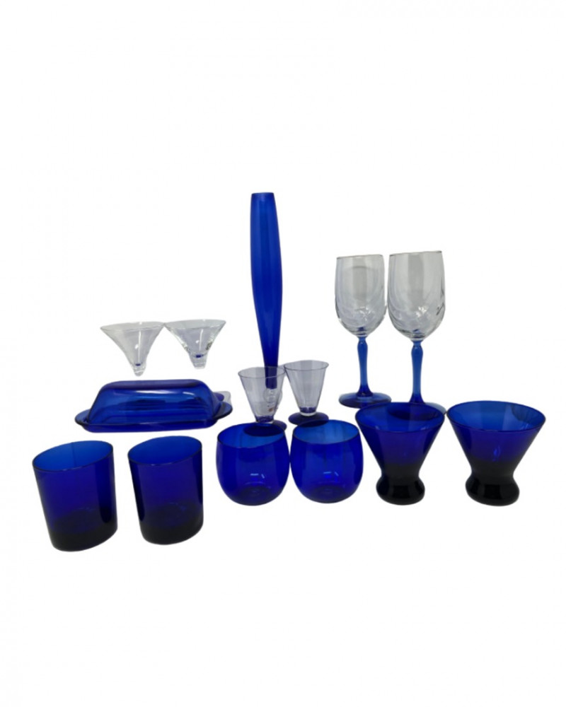 A curated set of cobalt blue and clear glassware designed for intimate entertaining and visual impact. This romantic collection includes tumblers, stemware, and specialty pieces in rich blue tones, paired with classic clear martini and wine glasses. A perfect blend of bold color and timeless form—ideal for date nights, bar setups, or glassware collectors. Total Pieces: 14 Included Items: (2) Clear wine glasses with long stems (2) Clear martini glasses (1) Tall cobalt blue vase (1) Cobalt blue butter dish with lid (2) Small clear shot glasses (1) Small clear glass with wide rim (5) Cobalt blue drinking glasses (varied shapes: tumblers and flared forms) Color Theme: Deep cobalt blue and clear glass; no black bases or rims Era: Mixed vintage and contemporary styles Condition: Excellent; no chips or cracks noted Estimated Value: $60–$120 depending on maker attribution and completeness Use: Barware, romantic table setting, glassware displaySummary