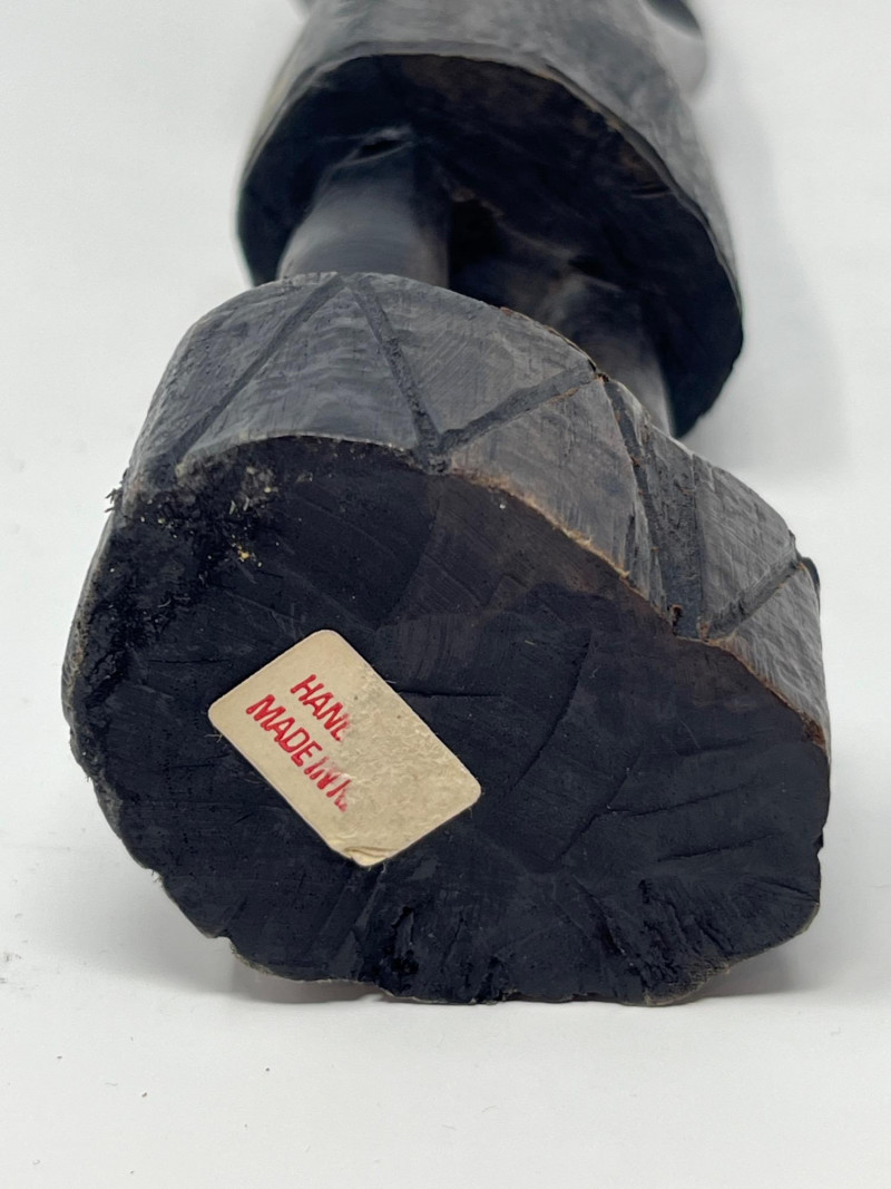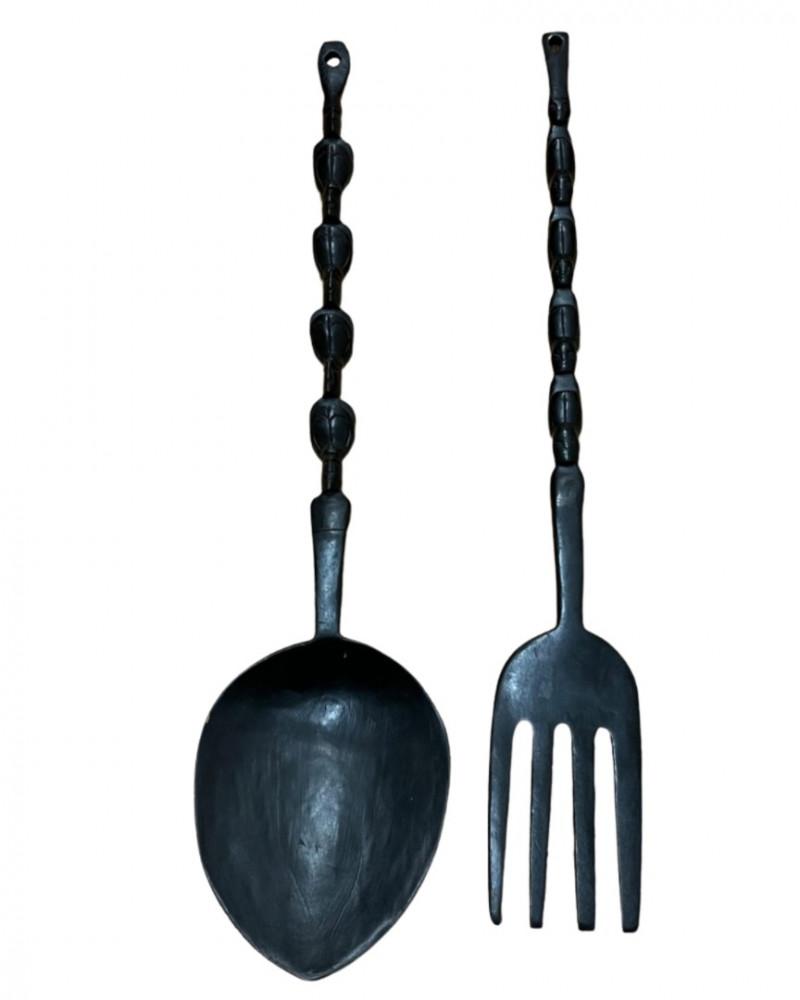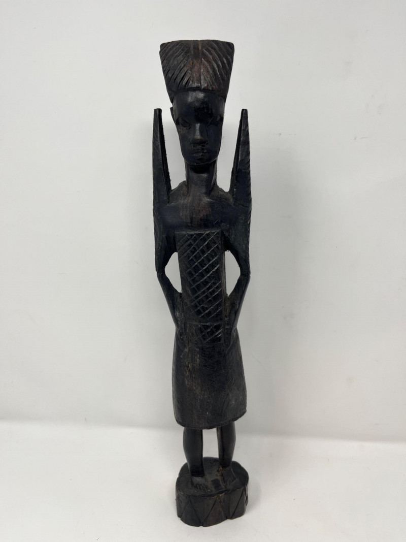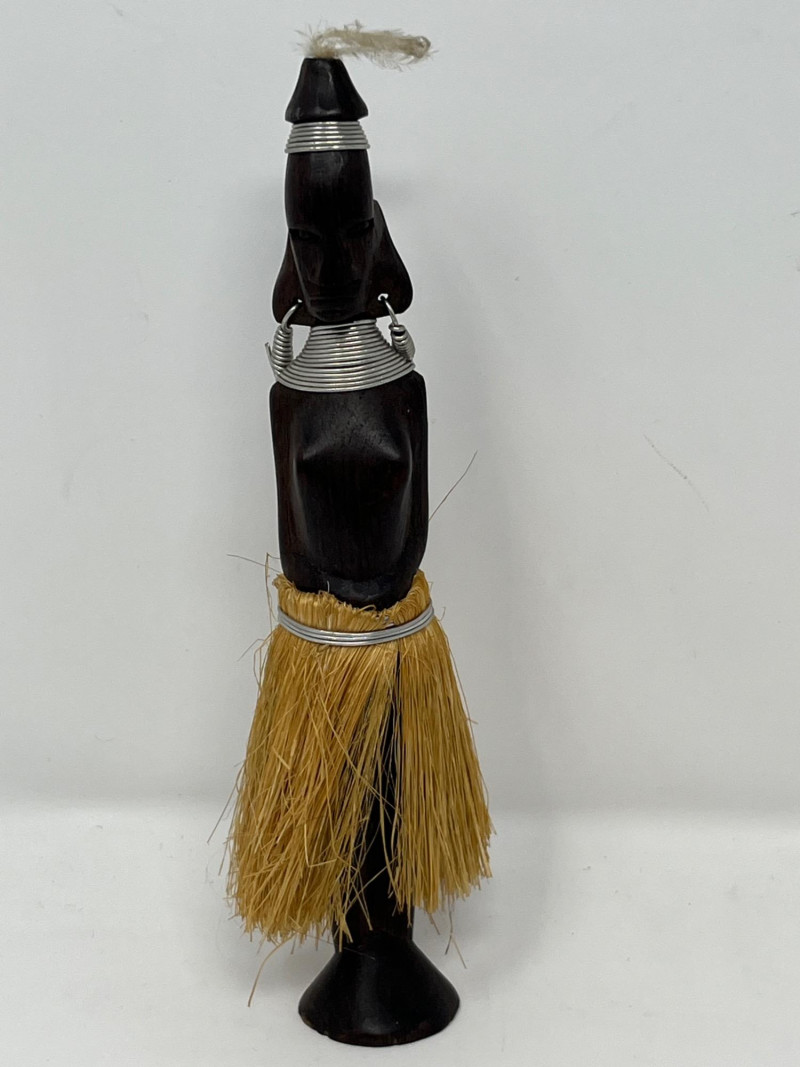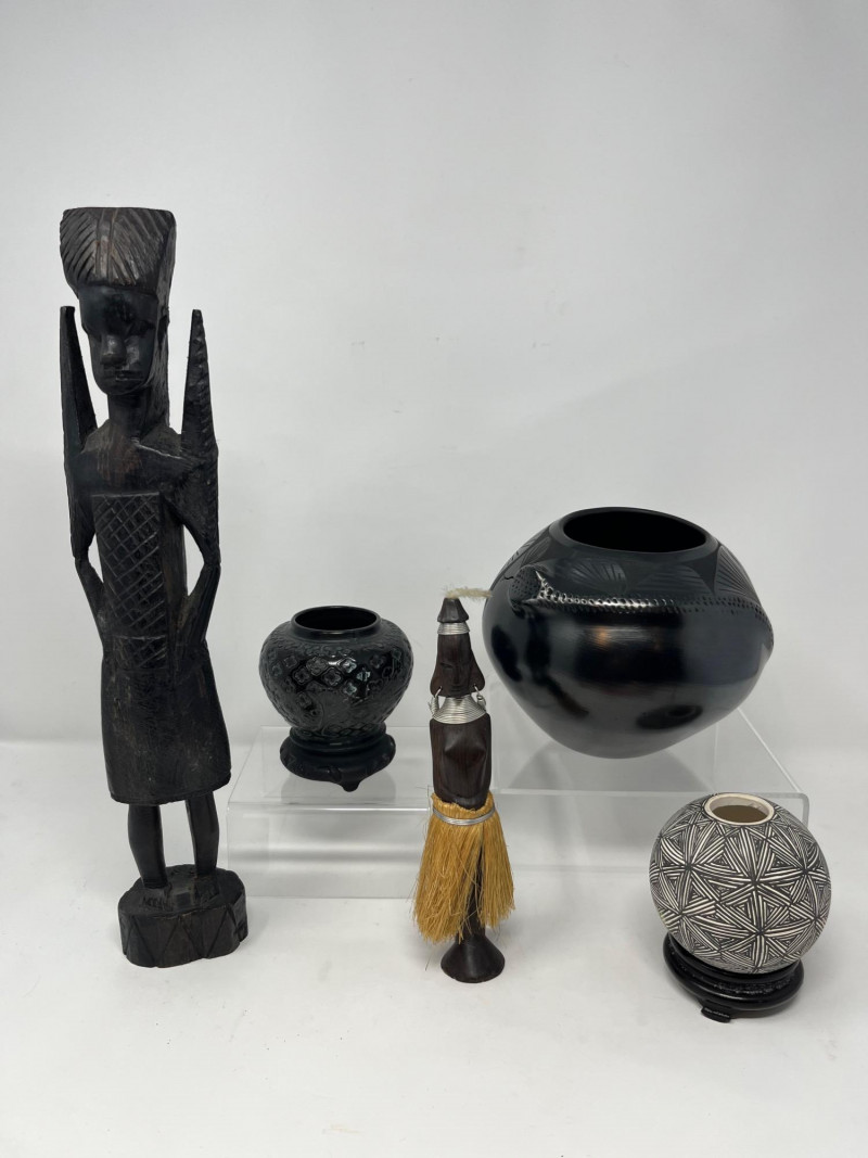 A striking and culturally rich 5-piece collection of handcrafted wood and clay decor, blending tribal artistry with ceremonial symbolism. This grouping includes two carved figures, three pottery vessels, and a ceremonial brush figure, each showcasing unique textures, forms, and regional influences. From the elongated wood sculpture to the geometric clay pot and glossy black vessel, this lot offers visual depth and storytelling potential—ideal for collectors, stylists, or global-inspired interiors. Figures- 8” and 14” tall each small pottery- 4” x 5” on stands black vase- 6”w 5”h fork and spoon- 6”w fork 10”w spoon x 39”hDescription