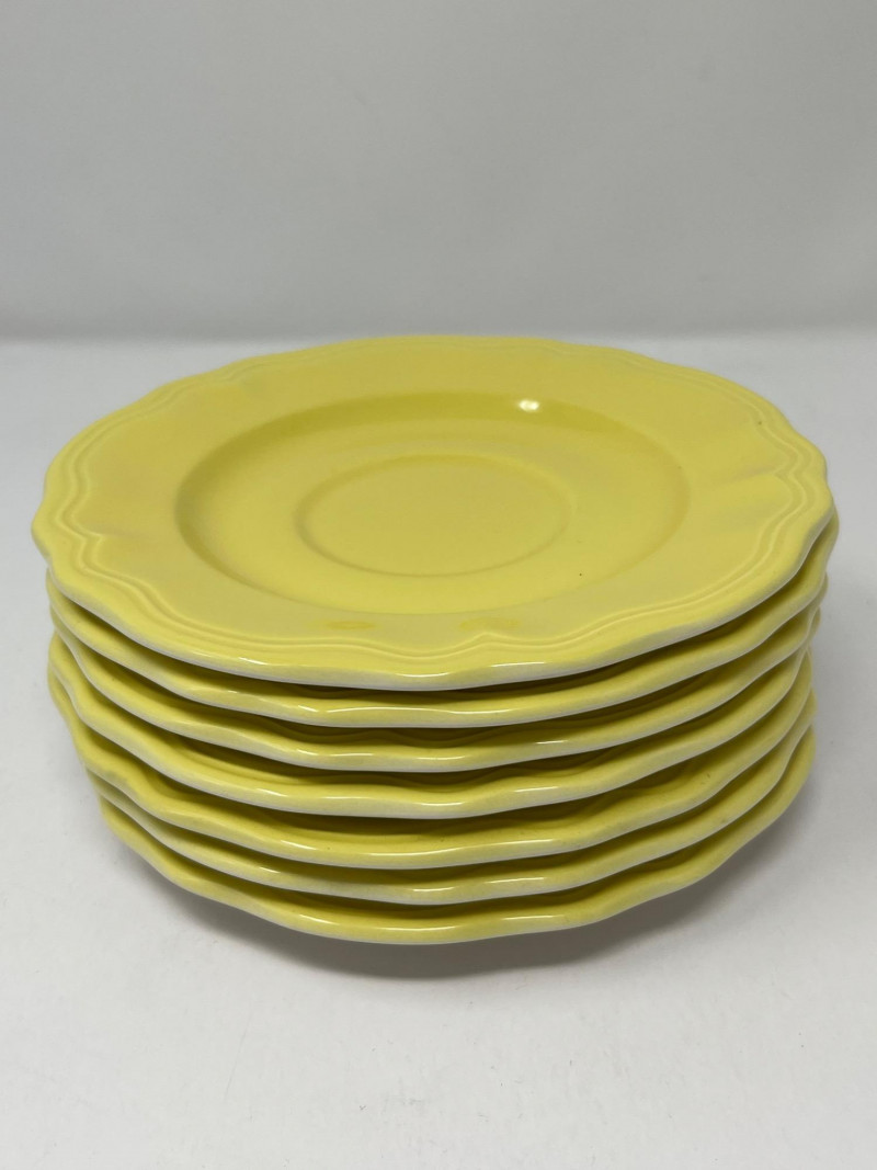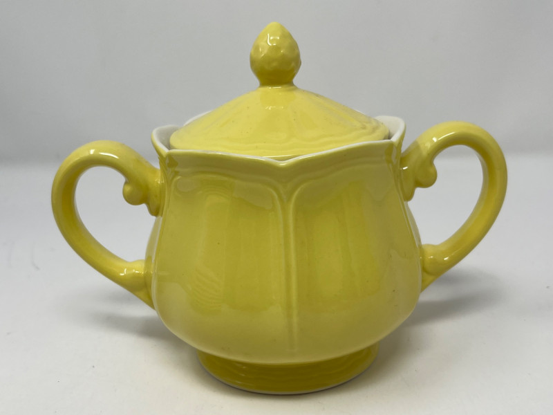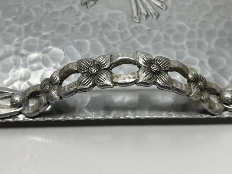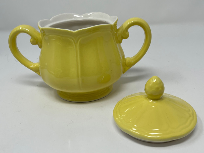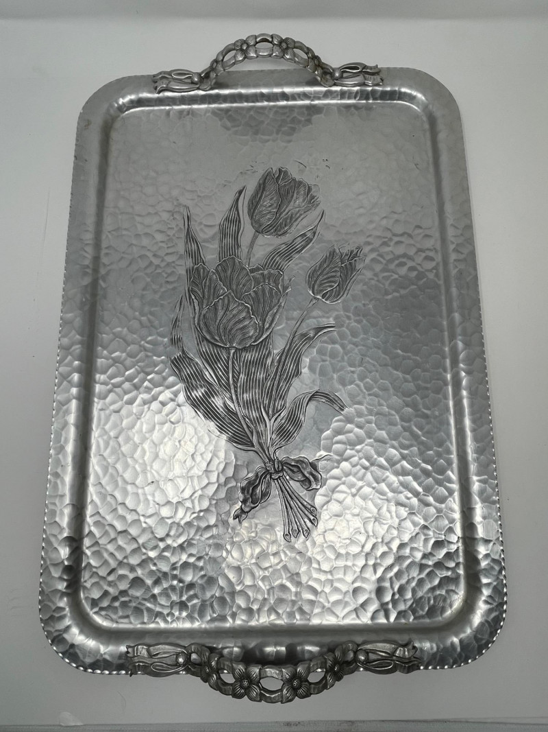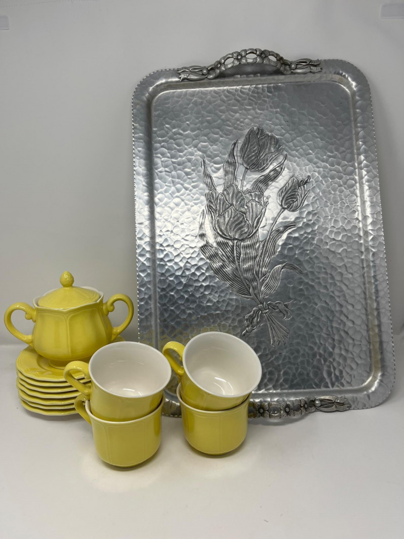 A cheerful mid-century tea service featuring a bright yellow ceramic teapot, four matching cups with white interiors, seven coordinating saucers, and a lidded sugar bowl. The set is paired with a large hammered aluminum serving tray embossed with tulips and finished with ornate handles and scalloped edges. One cup has a small chip, otherwise the set is in excellent vintage condition. A sunny blend of retro hospitality and floral elegance—perfect for spring entertaining or vintage kitchen display. Maker: Unmarked; tray possibly Everlast or Continental Aluminum Material: Tray: Hammered aluminum with embossed tulip design Tea set: Glazed ceramic Color Scheme: Tray: Silver-tone aluminum Tea set: Yellow exterior, white interior Components: 1 teapot with lid and dual handles 4 cups (1 with small chip) 7 saucers 1 sugar bowl with lid 1 aluminum tray Dimensions: Tray: Approx. 18" L × 12" W Teapot: Approx. 7" H × 9" W Era: Likely 1950s–1960s Condition: Very good vintage; one cup with minor chip