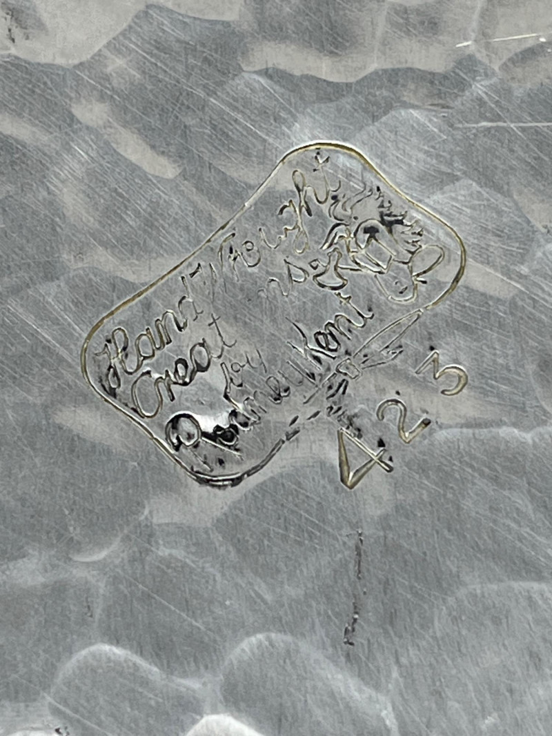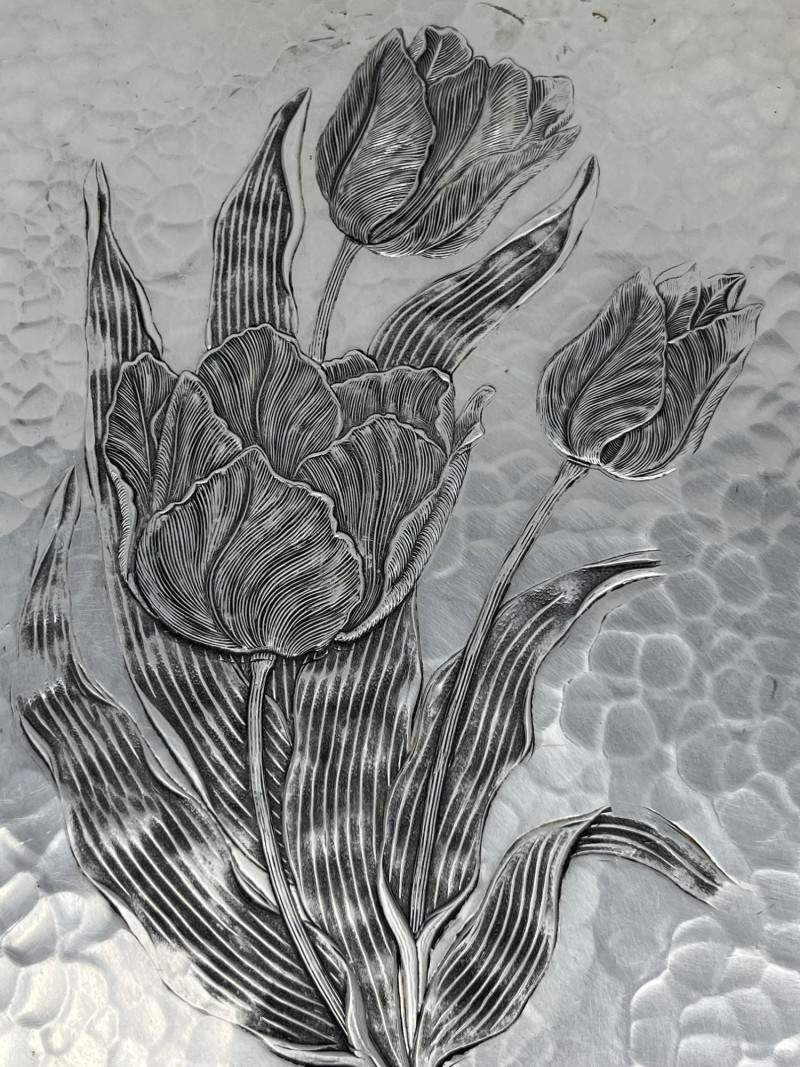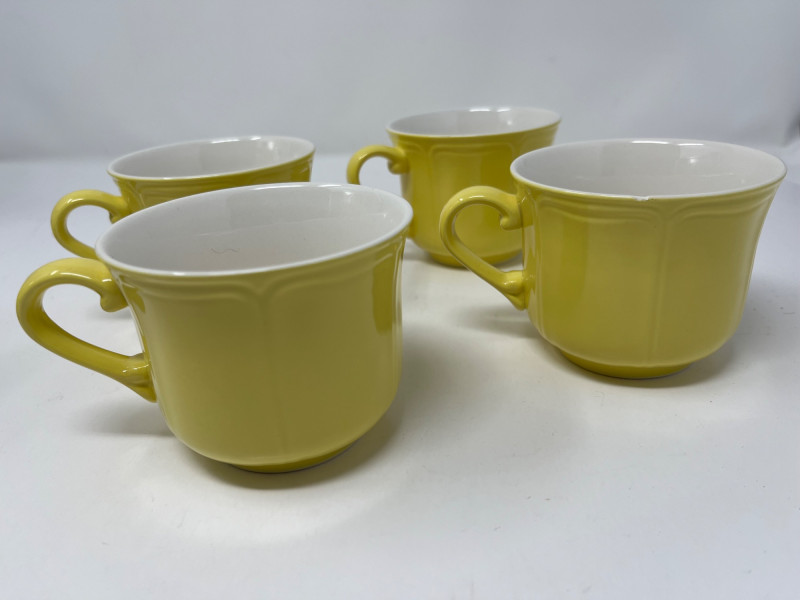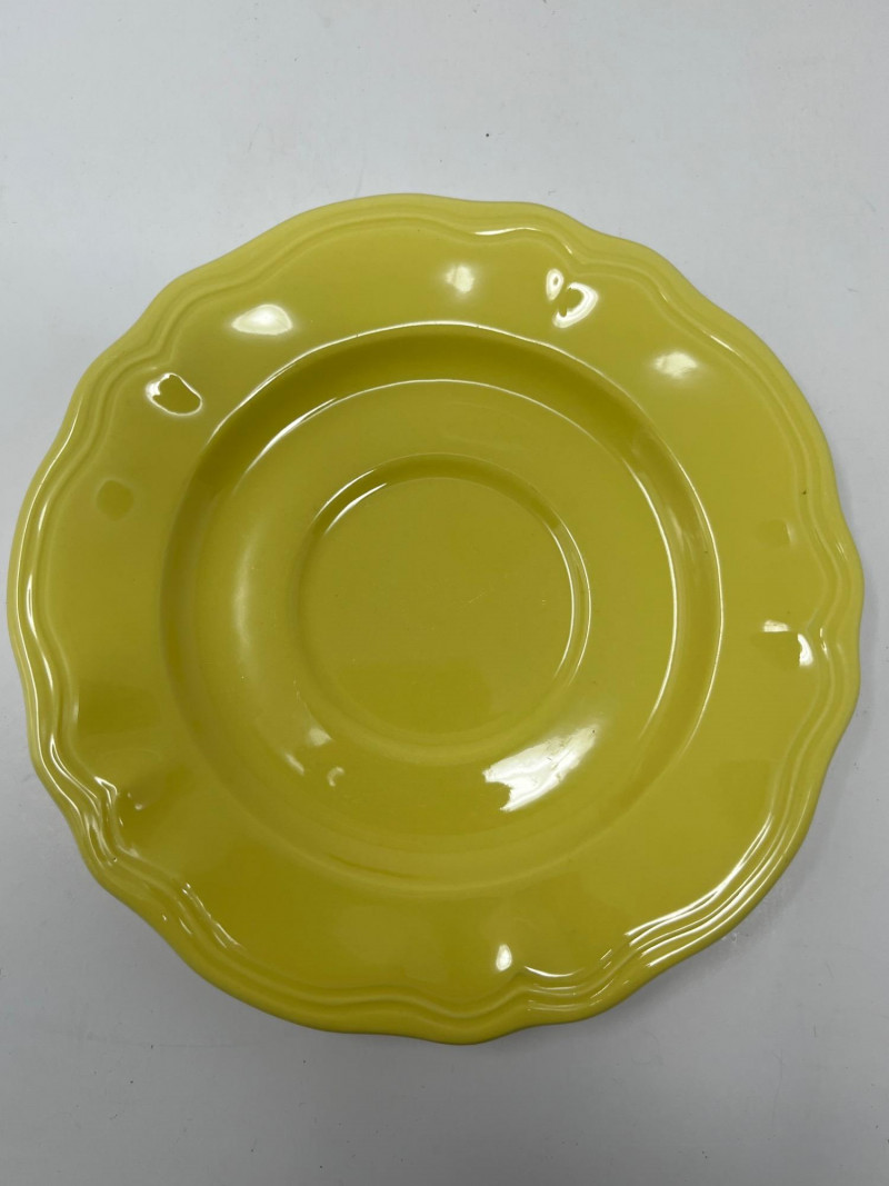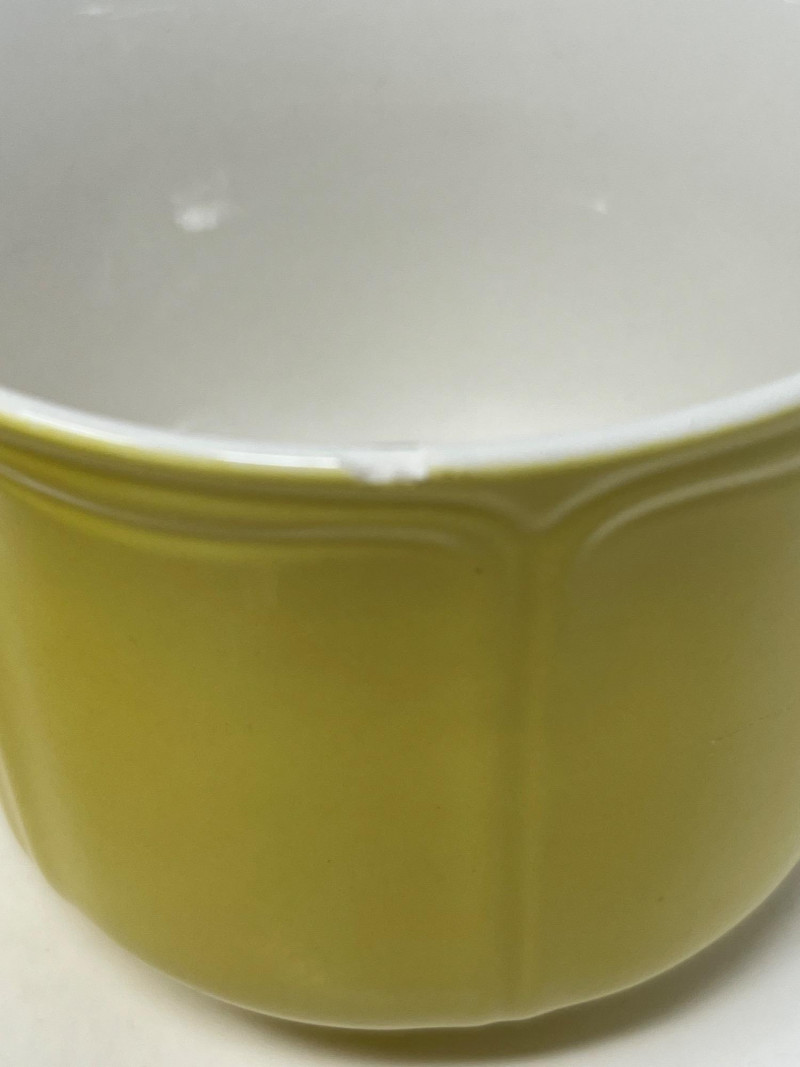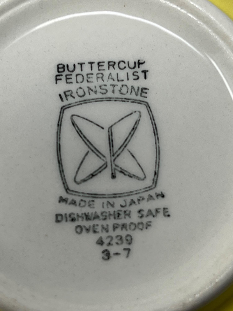 A cheerful mid-century tea service featuring a bright yellow ceramic teapot, four matching cups with white interiors, seven coordinating saucers, and a lidded sugar bowl. The set is paired with a large hammered aluminum serving tray embossed with tulips and finished with ornate handles and scalloped edges. One cup has a small chip, otherwise the set is in excellent vintage condition. A sunny blend of retro hospitality and floral elegance—perfect for spring entertaining or vintage kitchen display. Maker: Unmarked; tray possibly Everlast or Continental Aluminum Material: Tray: Hammered aluminum with embossed tulip design Tea set: Glazed ceramic Color Scheme: Tray: Silver-tone aluminum Tea set: Yellow exterior, white interior Components: 1 teapot with lid and dual handles 4 cups (1 with small chip) 7 saucers 1 sugar bowl with lid 1 aluminum tray Dimensions: Tray: Approx. 18" L × 12" W Teapot: Approx. 7" H × 9" W Era: Likely 1950s–1960s Condition: Very good vintage; one cup with minor chip