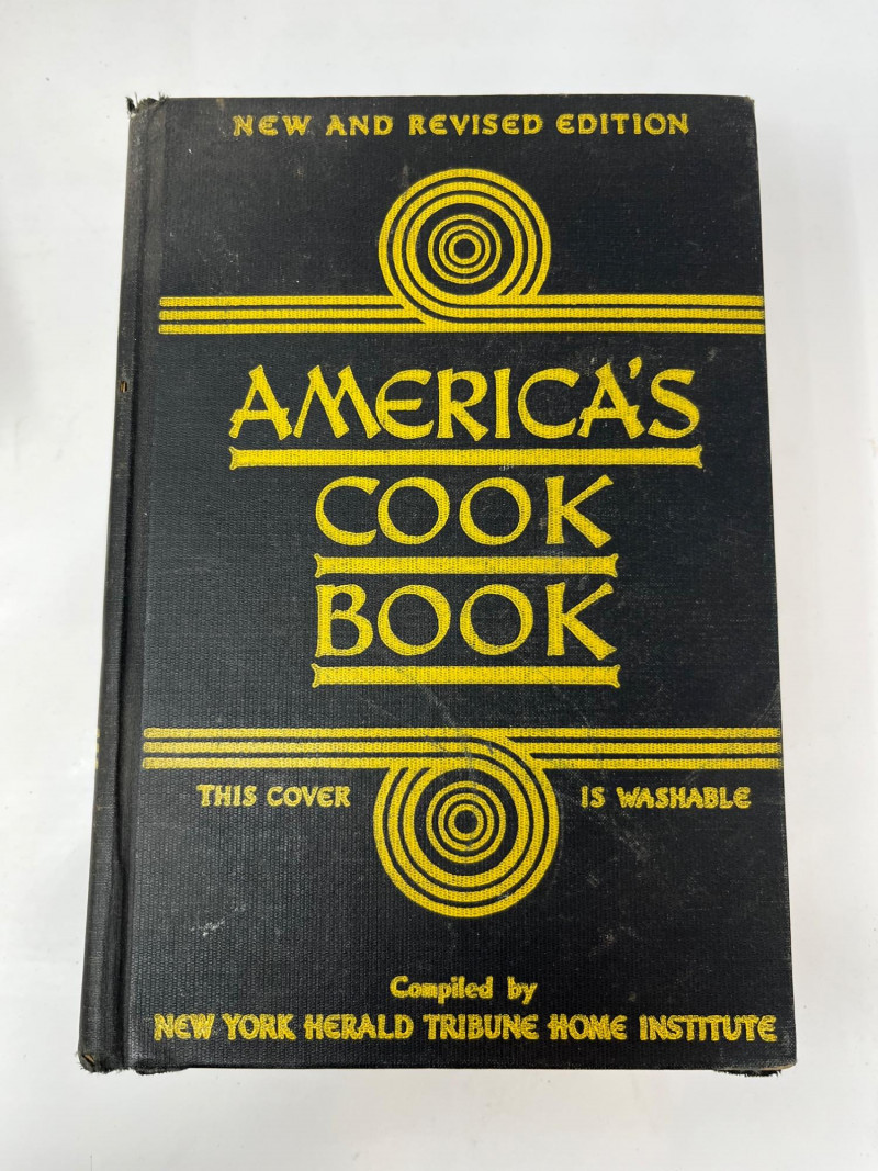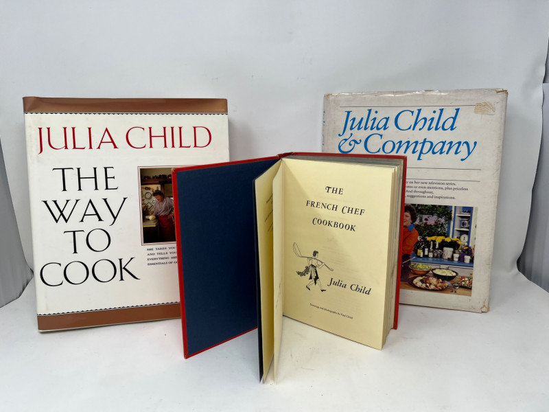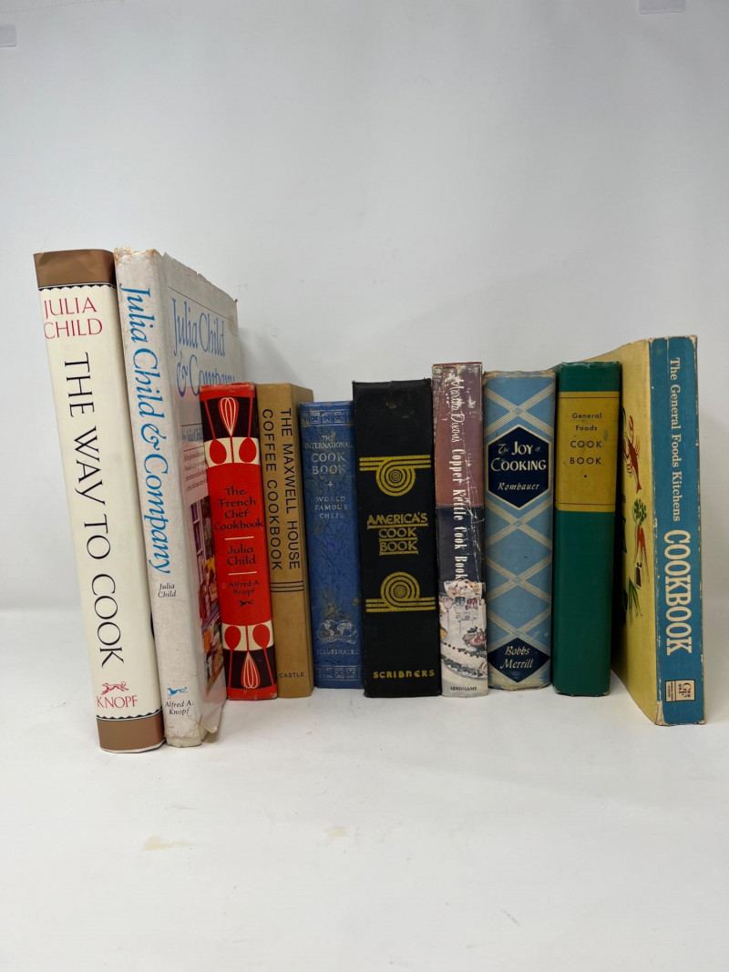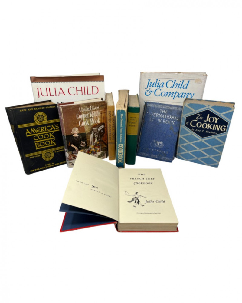 A curated 10-piece collection of vintage cookbooks spanning mid-century American culinary history, anchored by multiple works from Julia Child. This lot includes The French Chef Cookbook, Julia Child & Company, and the iconic red-and-white JULIA CHILD hardcover, alongside foundational titles like Joy of Cooking, America’s Cook Book, and The Good Housekeeping Cookbook. Also featured are The Copper Plate Cookbook by Marcia Adams, The International Cookbook, and regional or promotional volumes like Maxwell House Coffee Cookbook and Martha Dixon Cookbook. A flavorful blend of practical recipes and cultural legacy, ideal for collectors, home chefs, or nostalgic decorators. Julia Child & Company – Hardcover The French Chef Cookbook – Open copy displayed JULIA CHILD – Large red-and-white hardcover Joy of Cooking by Irma S. Rombauer America’s Cook Book The Good Housekeeping Cookbook The Copper Plate Cookbook by Marcia Adams The International Cookbook Maxwell House Coffee Cookbook – Promotional edition Martha Dixon Cookbook – Regional recipes Mix of hardcovers and softcovers Mid-century to late 20th century publication dates Illustrated and text-based formats Approx. 9"–11" tall per book Good to excellent vintage condition Light shelf wear, some edge rubbing No major damage noted; sold as-isDescription