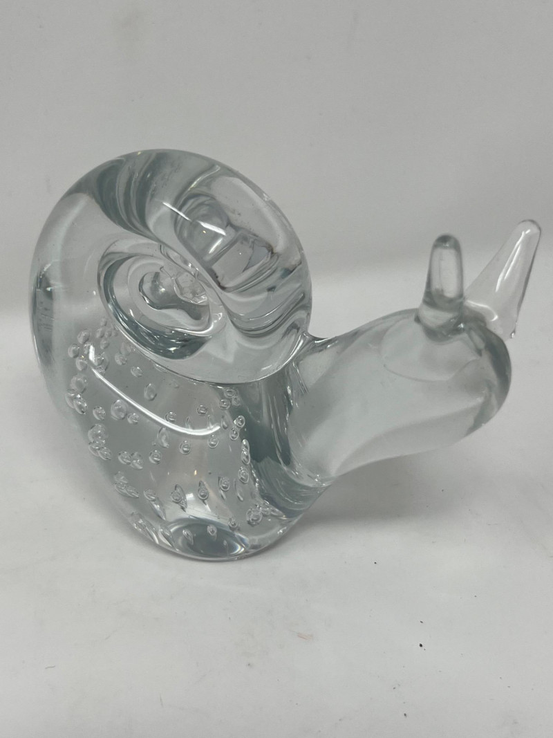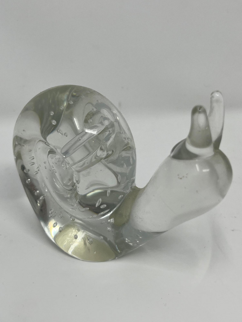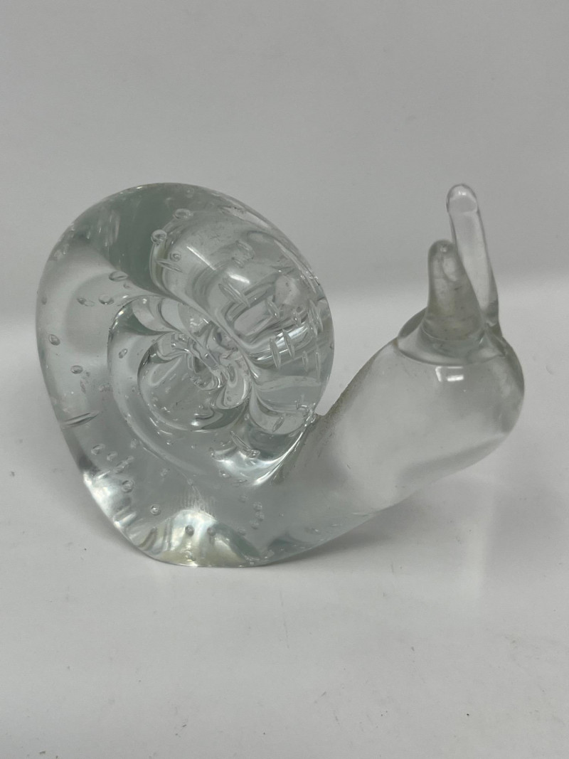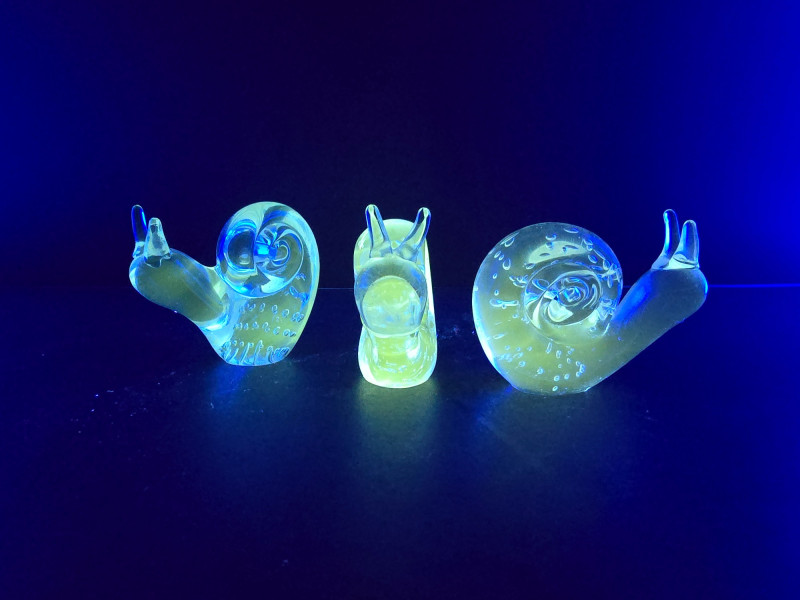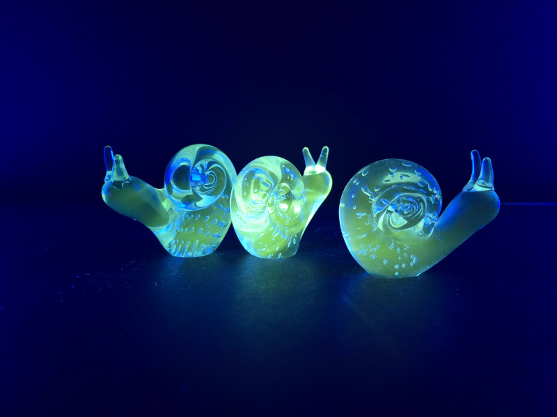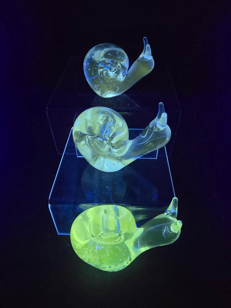 A luminous set of manganese glass snail figurines, each hand-formed with coiled translucent shells and delicate antennae. These whimsical mollusks glow under UV light, revealing embedded air bubbles and subtle yellow-green tinting. Their sculptural forms and radiant finish make them ideal for collectors of art glass, mid-century curiosities, or blacklight-reactive décor. Length: 5" Width: 1" Height: 3" Manganese glass with natural glow under UV/blacklight Swirled shell design with internal air bubbles for texture Translucent yellow-green tint Hand-formed glass with raised antennae and coiled body No maker’s mark; likely mid-century studio or artisan productionDescription