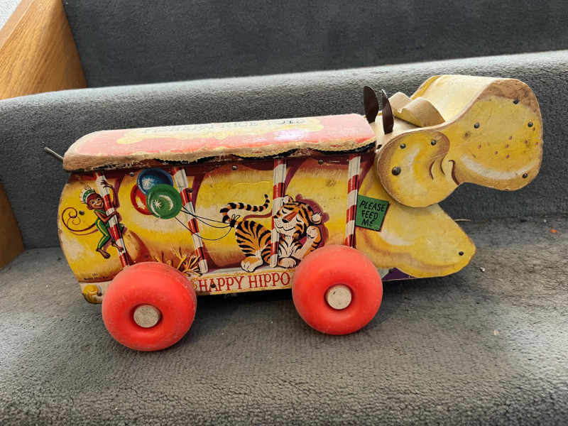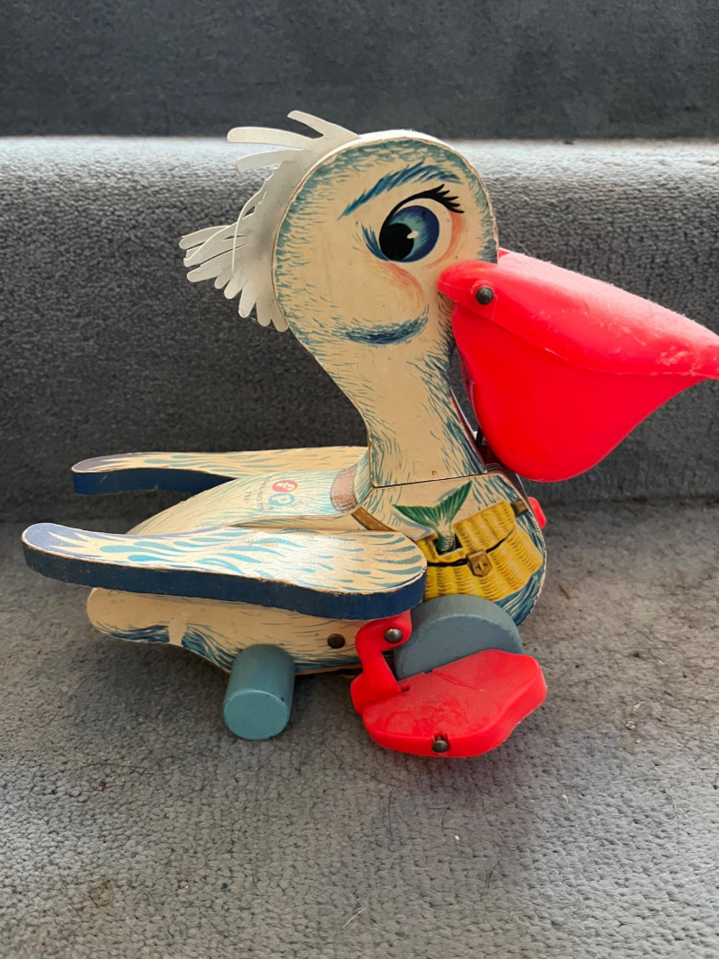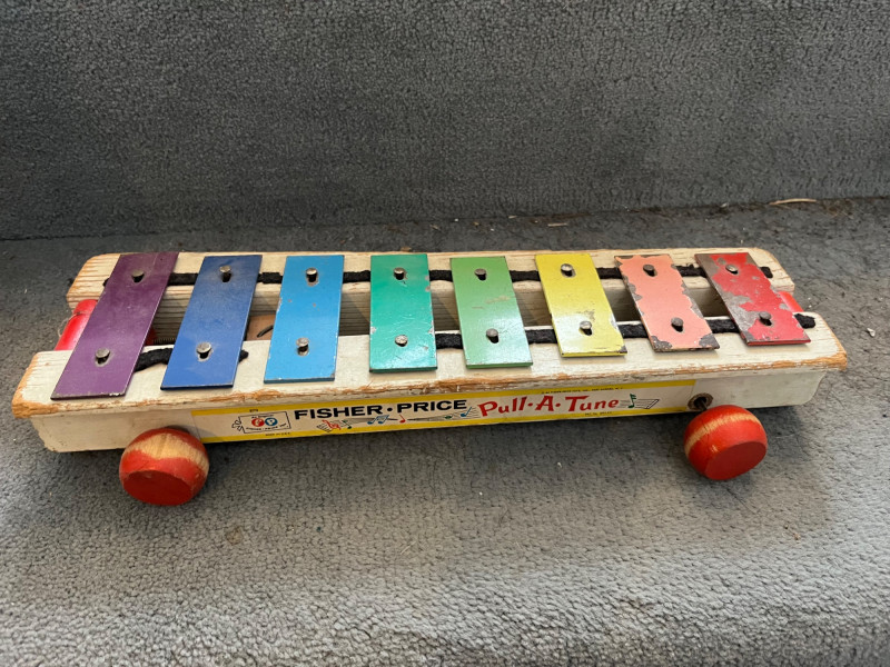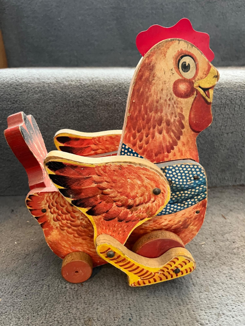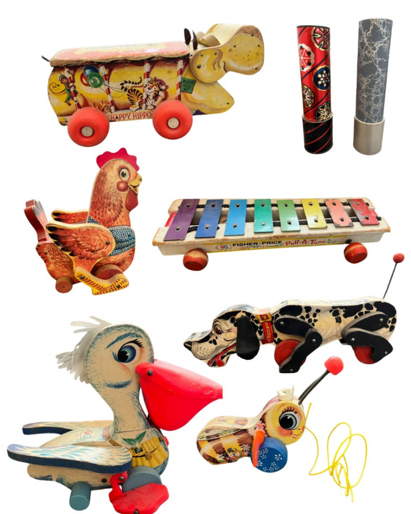 A cheerful and nostalgic collection of eight vintage children’s toys, blending mid-century charm with playful design. This lot includes classic pull toys—ducks, chickens, birds, and a segmented snake—alongside a colorful xylophone, a circus wagon, and two cylindrical musical or novelty toys. Each piece shows signs of loving use and age, ideal for display, prop styling, or collectors of retro childhood memorabilia. Yellow Circus Wagon Pull Toy – Red wheels, cartoon animal graphics White Duck Pull Toy – Red beak, rolling base Brown Chicken Pull Toy – Red comb, vintage styling Segmented Snake Pull Toy – Black and tan body with flexible joints Blue Bird Pull Toy – Small size, red beak Colorful Xylophone – Eight rainbow keys, wooden mallet included Kaleidoscope #1 – Black and red cylindrical body with rotating end Kaleidoscope #2 – Blue patterned cylinder with gray baseIncluded Toys: