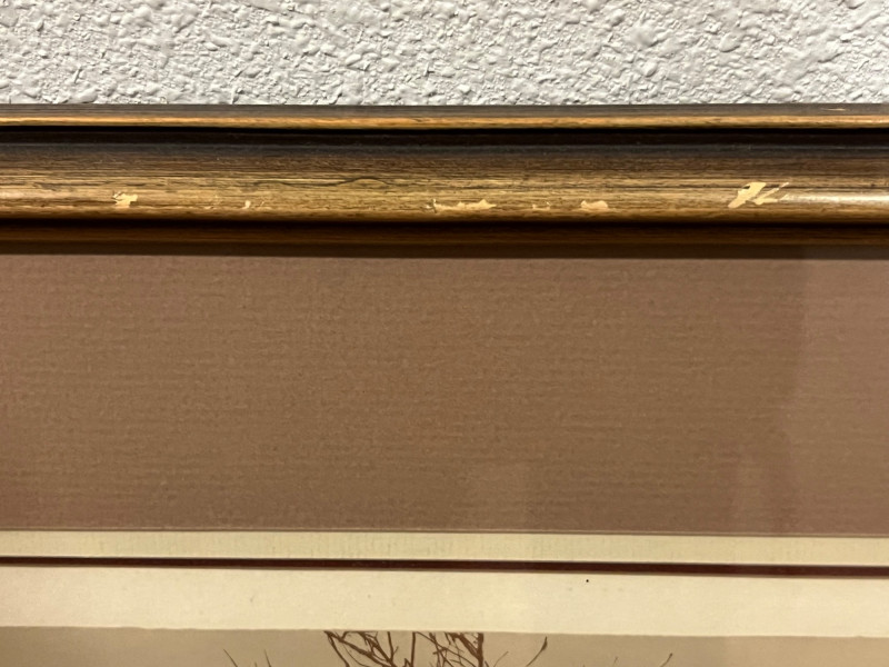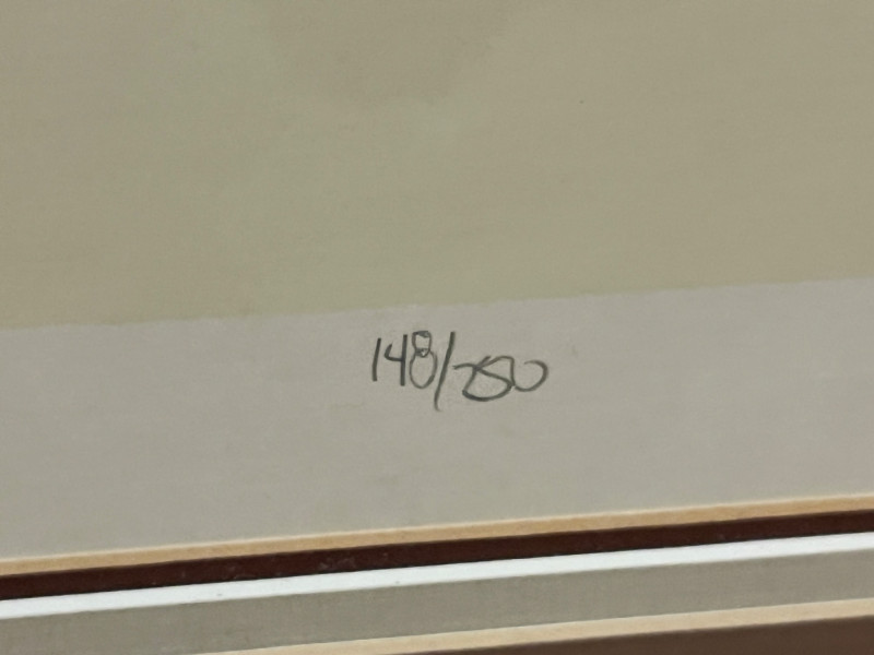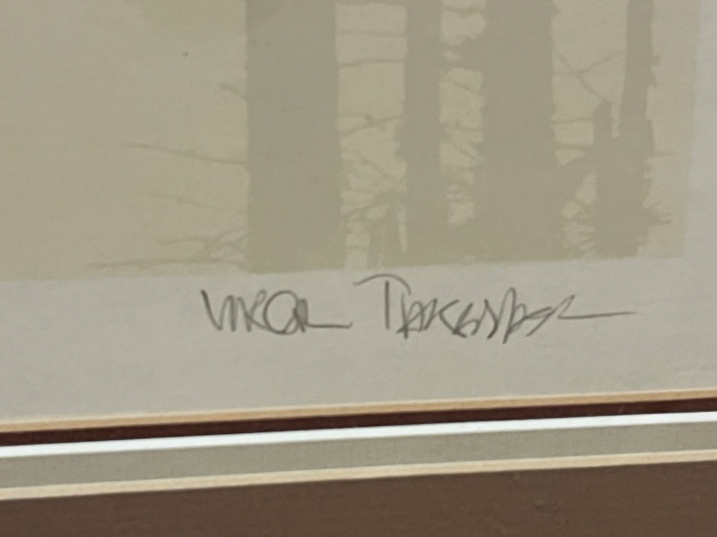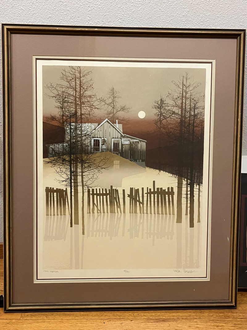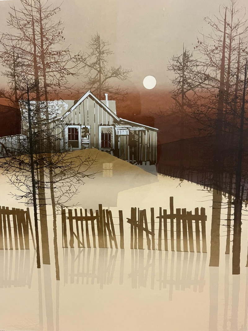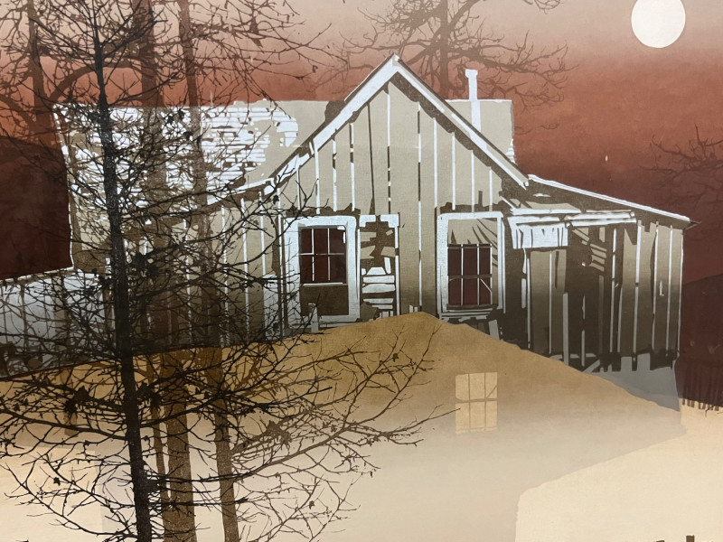A hauntingly serene winter landscape by American artist Virgil Thrasher, titled Cabin Shadows. This limited edition print captures a rustic cabin nestled among leafless trees and a broken fence under a moonlit sky. The snow-covered ground and muted twilight tones evoke solitude and warmth amid cold surroundings. Signed and numbered by the artist, this piece blends realism with emotional depth—ideal for collectors of American landscape prints or those curating a quiet, reflective interior. Artist: Virgil Thrasher (b. 1943) Title: Cabin Shadows Edition: 148/250 Signature: Hand-signed by artistDescription