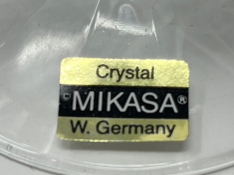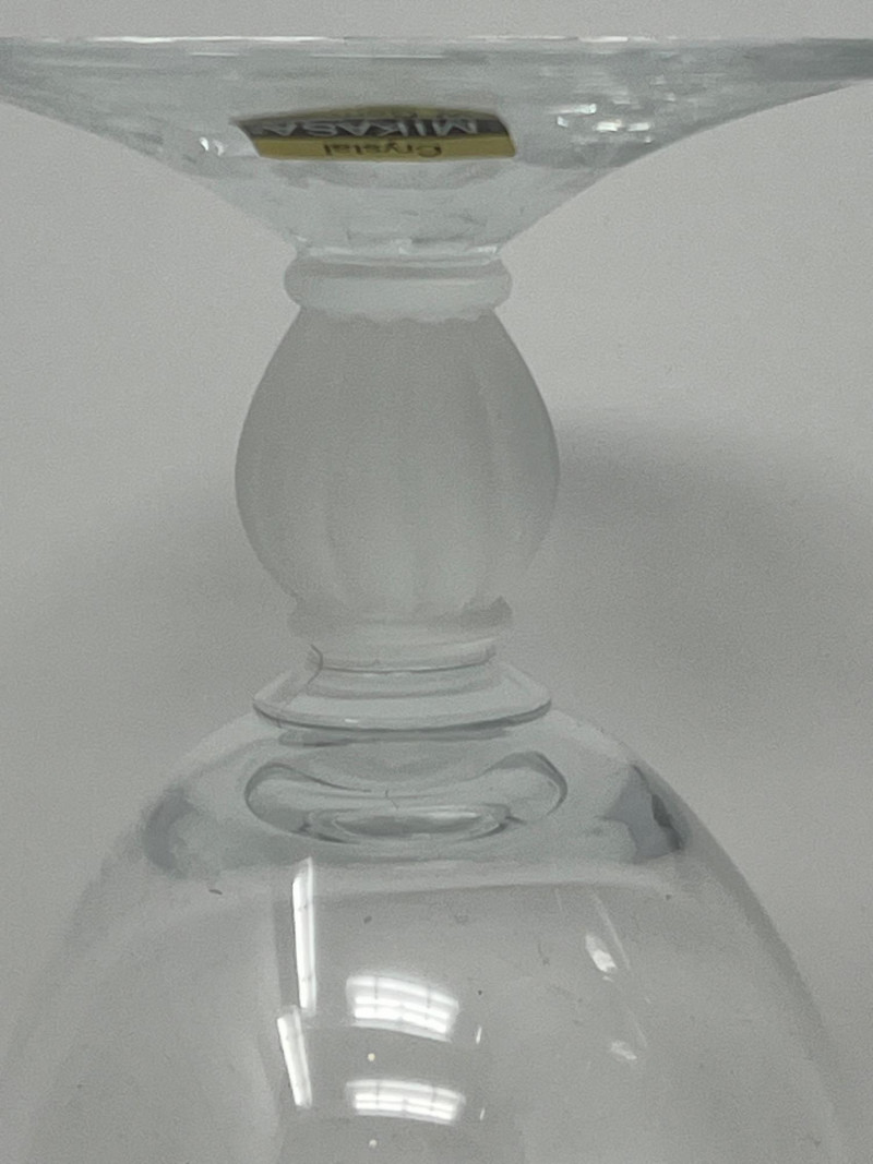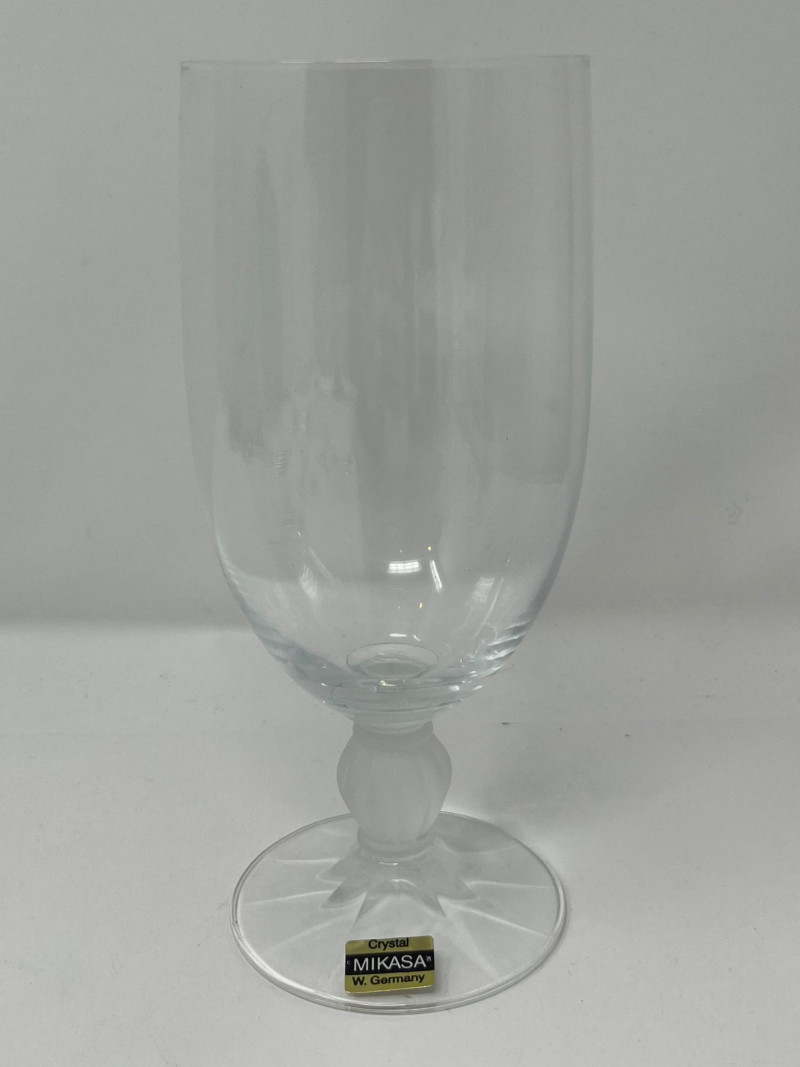 A sleek set of six Mikasa crystal goblets, each standing 8" tall with clear bowls and frosted stems. Made in Germany, these glasses blend modern elegance with durable craftsmanship. Ideal for water, wine, or cocktail service, they reflect Mikasa’s reputation for quality and timeless design. A versatile addition to formal table settings or minimalist glassware collections. Maker: Mikasa Origin: Made in Germany Material: Lead crystal Color: Clear bowl with frosted stem Dimensions: 8" H × 4" W Design Features: Smooth, rounded bowl Frosted stem and base Mikasa sticker on foot Era: Likely 1990s–2000s Condition: Excellent; no chips or cracks noted