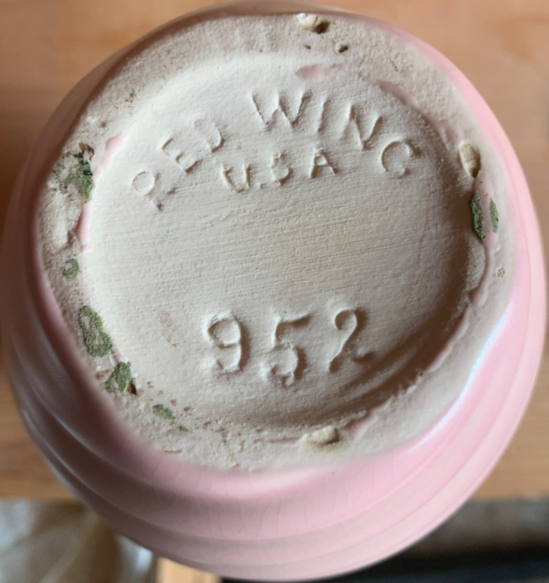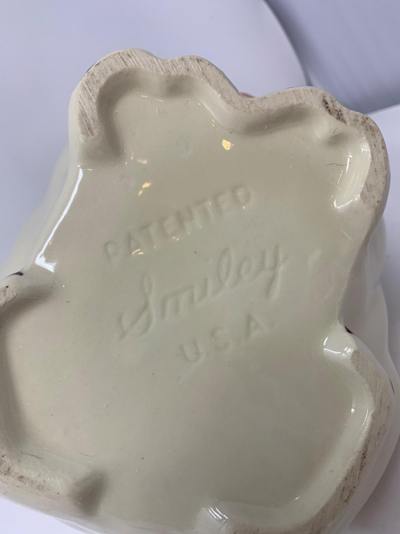 Vintage ceramic pitcher, planter, vase and a creamer. The figurine on the left is a vintage Southern Belle or Dutch girl planter, possibly from the 1940s or 1950s. The pink, spiral-ribbed vase is a vintage ceramic vase, potentially from red wing USA number 952, a line introduced in 1940. The pig-shaped creamer or planter with a brown hat is a vintage Spaulding pottery piece. These types of pieces are often referred to as "mid-century. "Shawnee Pottery "Smiley" Figural #2 Patented Ceramic Pig Pitcher | Pink Flower | Vintage Pig | Shawnee Pig | Juice Pitcher | Shawnee Pitcher is 8” high. $125. Value