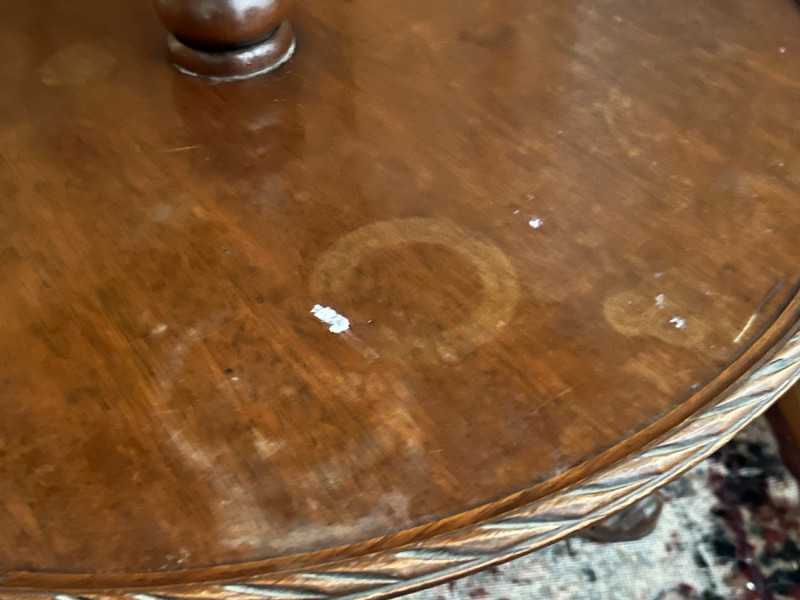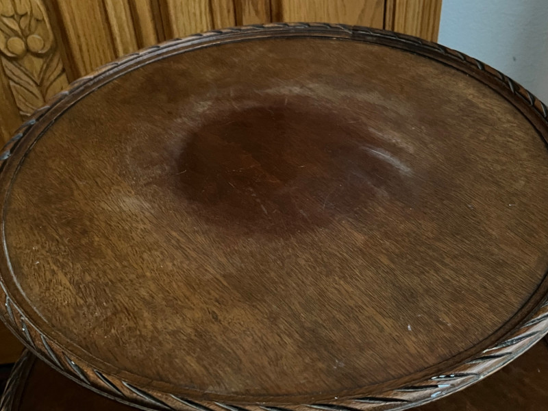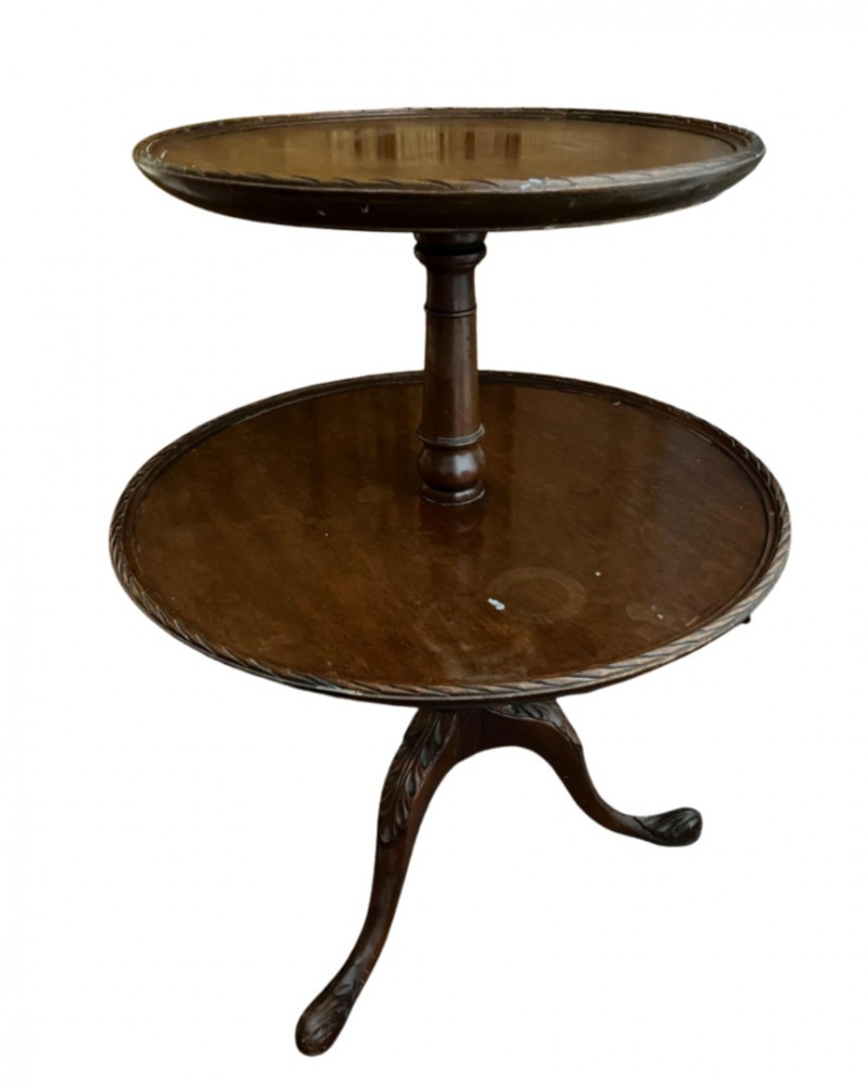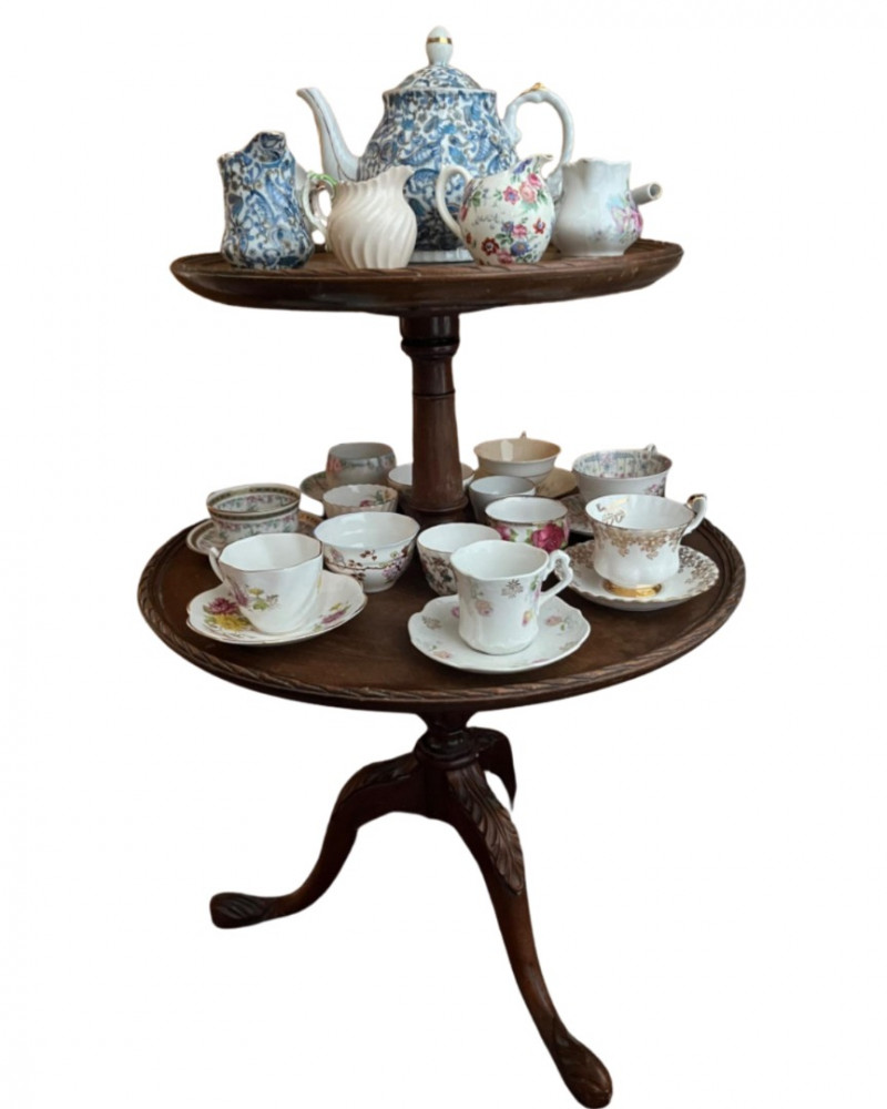 The centerpiece of this collection is a lovely two-tier wooden tea table, possibly in the style of a dumbwaiter or a server. The table features a turned wooden central column and carved feet. Please note that the table shows signs of its age, including visible water marks and general wear, which add to its vintage character.
