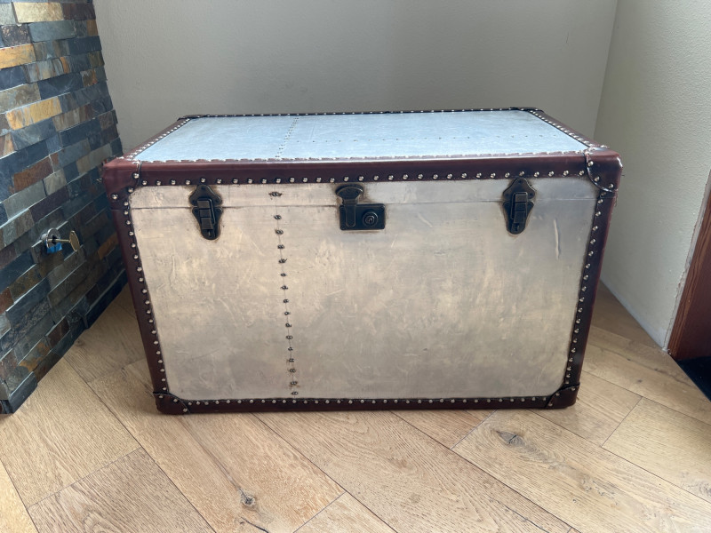 A Restoration Hardware-inspired coffee table with trunk-style storage and industrial charm. This compact piece features a weathered finish and functional interior space, perfect for storing blankets, books, or keepsakes. Ideal for lofts, dens, or curated living rooms. Studded leather detail and handles.