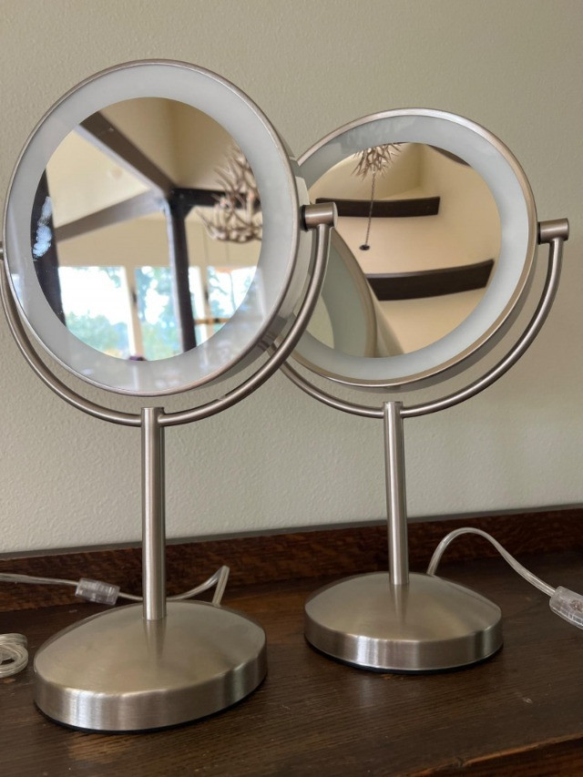 A matching pair of Conair BE21GDH lighted vanity mirrors in satin nickel finish. Each mirror features a double-sided oval design with 1x and 7x magnification, energy-efficient LED lighting, and a sleek, modern silhouette. Ideal for grooming, makeup, or detail work, these corded mirrors offer both elegance and utility. Light wear consistent with use.