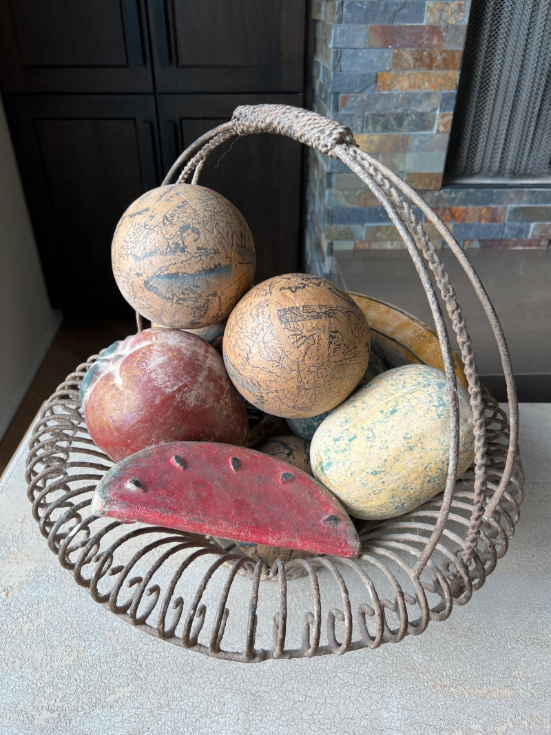 A rustic centerpiece that blends weight, whimsy, and heritage. This twisted wrought iron basket cradles a collection of hand-painted ceramic fruits—each piece substantial in feel and rich in color. Nestled among them are four vintage-style paper mâché sphere balls, evoking Old World artistry with marbled finishes and muted tones. Ideal for farmhouse kitchens, seasonal displays, or collector vignettes that celebrate texture and tradition. Fruit lengths range from 8" to 11" length and 6" width