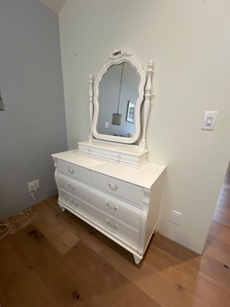 This Stanley Furniture dresser offers timeless charm with a clean white finish and gently curved lines. Featuring three spacious drawers and a matching framed mirror, it evokes a soft cottage aesthetic—perfect for a guest room, nursery, or transitional space. The mirror adds light and vertical presence, while the dresser’s compact footprint makes it ideal for smaller interiors. Light wear consistent with use. Mirror is removable. Note pictures for screw types and bring your own tools. Mirror height is 42" tall. Dresser height 30" tall. Bidding on this lot is an agreement that: (1.) You will have 2 capable, able-bodied persons to lift and load at a minimum. (2.) You