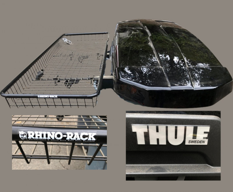 Thule roof-mounted cargo carrier paired with Rhino-Rack crossbars and mounting hardware. This system blends Thule’s reputation for sleek, durable design with Rhino-Rack’s rugged, utility-focused engineering. Ideal for transporting gear with confidence—whether for travel, work, or outdoor use. Stored indoors. Buyer should bring appropriate transport and assistance for loading. Includes key. Note: Thule is widely recognized for its premium-grade roof carriers and rack systems. Known for: Durability: Built to withstand long-term use and harsh weather conditions. Security: Locking mechanisms and aerodynamic designs that reduce noise and drag. Ease of Use: Tool-free mounting systems and intuitive installation. Design: Sleek, Scandinavian styling with a focus on functionality. Rhino-Rack, an Australian brand, complements Thule with: Heavy-duty engineering: Often favored for off-road and utility applications. Modular versatility: Compatible with a wide range of accessories. Reputation for ruggedness: Especially popular among outdoor enthusiasts and tradespeople. Together, a Thule carrier mounted on Rhino-Rack crossbars offers a blend of refined design and robust utility—ideal for buyers who value both aesthetics and performance. This pairing is often used for transporting gear like skis, camping equipment, or oversized cargo with confidence. Note: A replacement key has been ordered for the Thule storage box The Yakima locking racks that locks the Thule to the car does not currently have a key A replacement key will need to be ordered by the winner if you intend to keep those locks