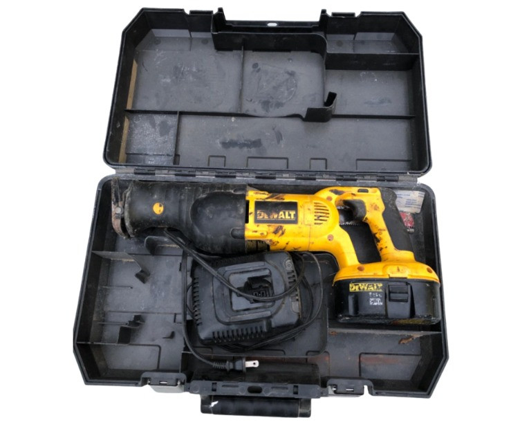 DeWalt DC385 cordless reciprocating saw in working condition. Features variable speed trigger, keyless blade clamp, and pivoting shoe for controlled cuts in wood, metal, and demolition materials. Powered by 18V battery (included along with charger) this saw is known for durability and versatility in tight spaces. Ideal for contractors, remodelers, and restoration crews needing portable cutting power. Included: