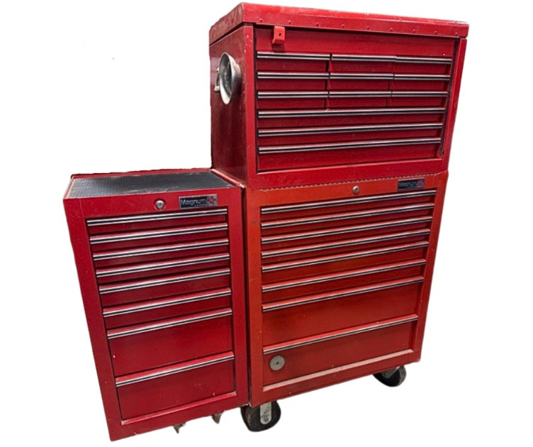 Magnum tool chest with matching extension, fully stocked with a wide variety of hand tools. This multi-drawer setup offers organized access to wrenches, pliers, screwdrivers, fasteners, measuring tools, and more. It's a ready-to-roll solution for any startup contractor, handyman, or shop owner looking to build out their tool inventory. The chest itself is built for durability, with ball-bearing drawer slides, locking mechanisms, and a powder-coated finish. The extension adds vertical storage and easy access to frequently used gear. Brand: Magnum Type: Tool chest with extension Contents: Assorted hand tools Use: Contractor, handyman, shop setup Condition: Usable Dimensions: Larger unit - 33" W x 18" D x 46" T Side extension unit - 21" W x 18" D x 43" T Includes all tools that have been photographed in each drawer. Unit is on casters.