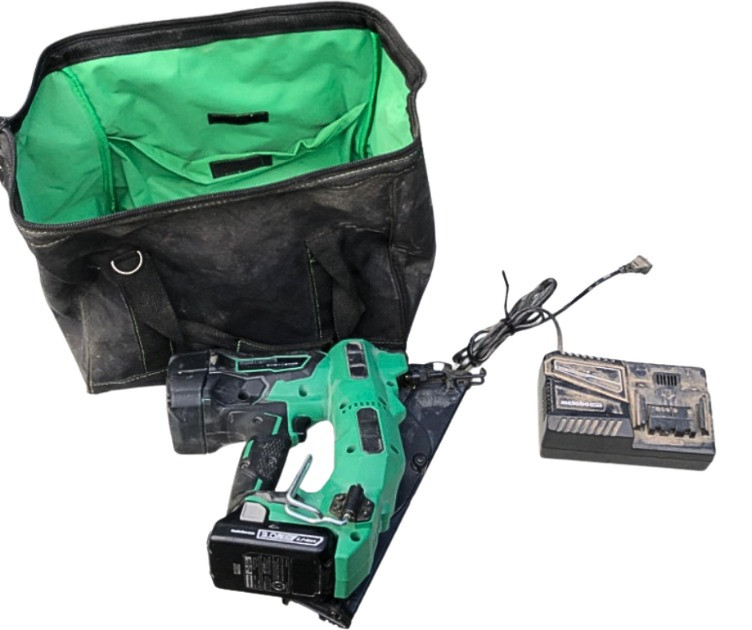 Metabo HPT cordless 15-gauge angled finish nailer in working condition. Includes battery, charger, and carrying case. Designed for precision trim work, cabinetry, and finish carpentry, this tool offers tool-free depth adjustment, dry-fire lockout, and brushless motor efficiency. Lightweight and maneuverable with angled magazine for tight corners. A reliable choice for contractors and restoration crews.