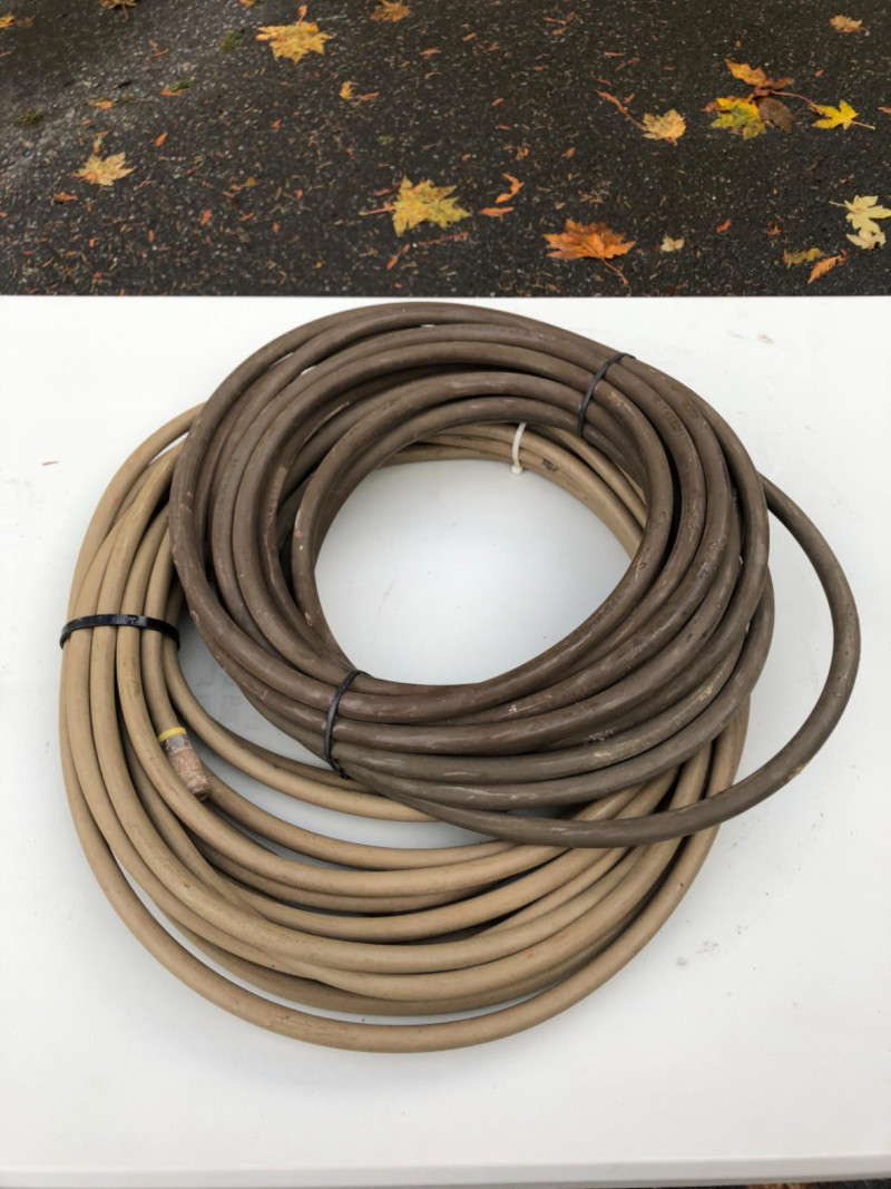 Two (2) 25-foot air compressor hoses. In working condition. Built for construction environments, these hoses offer flexibility, durability, and reliable airflow for pneumatic tools. Ideal for framing, roofing, or shop setups where reach and resilience matter. A practical addition to any contractor’s gear.