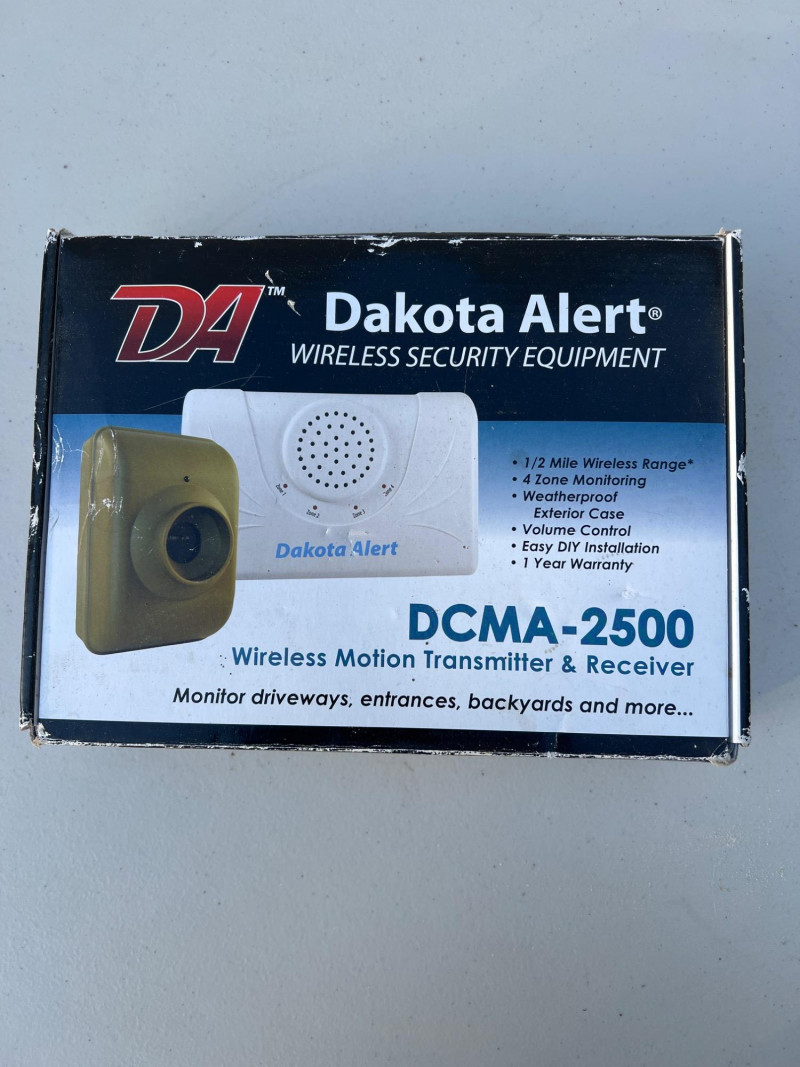 New-in-box Dakota Alert DCMA-2500 wireless motion alert system. This kit features a motion-detecting sensor and receiver designed to monitor driveways, entrances, or remote zones. The sensor detects movement (vehicles or people) up to 50 feet away and transmits alerts wirelessly to the receiver up to ½ mile away. Ideal for residential, farm, or light commercial use, the system offers reliable perimeter awareness with simple installation and expandable components. Model: DCMA-2500 Includes: Motion sensor + receiver Range: Up to ½ mile wireless transmission Detection Distance: Up to 50 feet Power: Sensor uses one 9V battery (not included); receiver plugs into standard outlet Condition: New in box