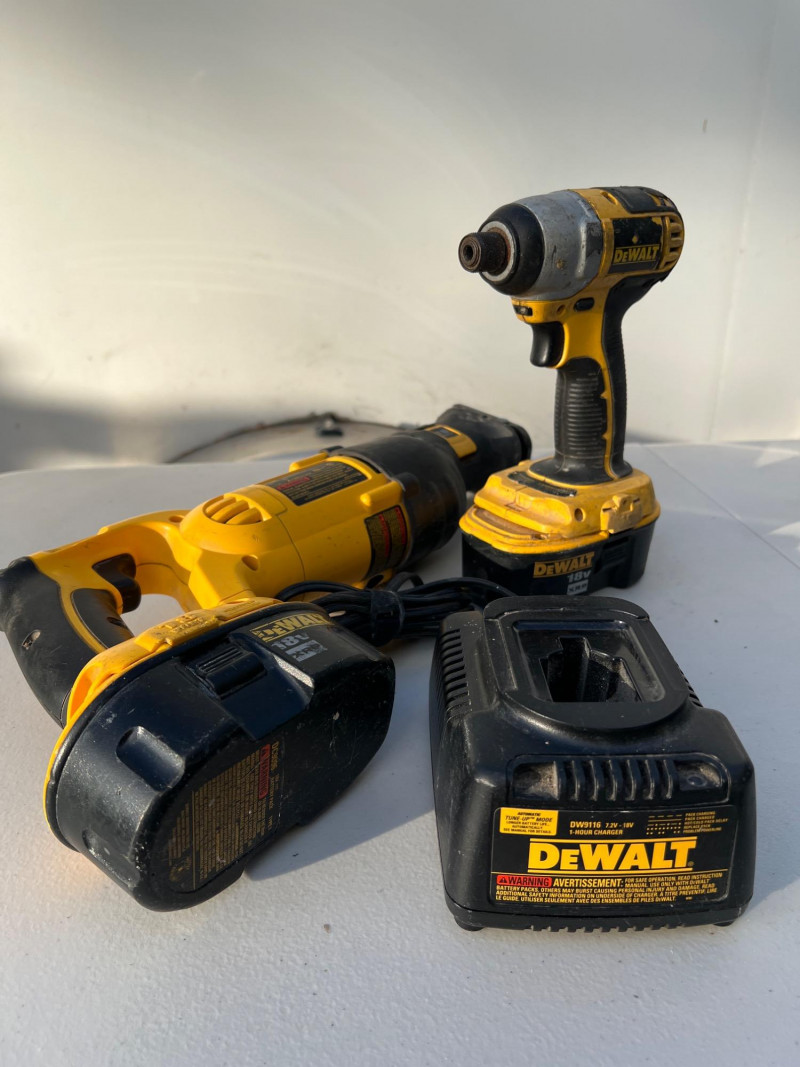 Two DeWalt cordless hand tools. In working condition. Includes a ¼" impact driver and a compact drill/driver—ideal for framing, cabinetry, or shop use. Lightweight and battery-powered for mobility and precision. A trusted set for contractors or DIYers. Included: