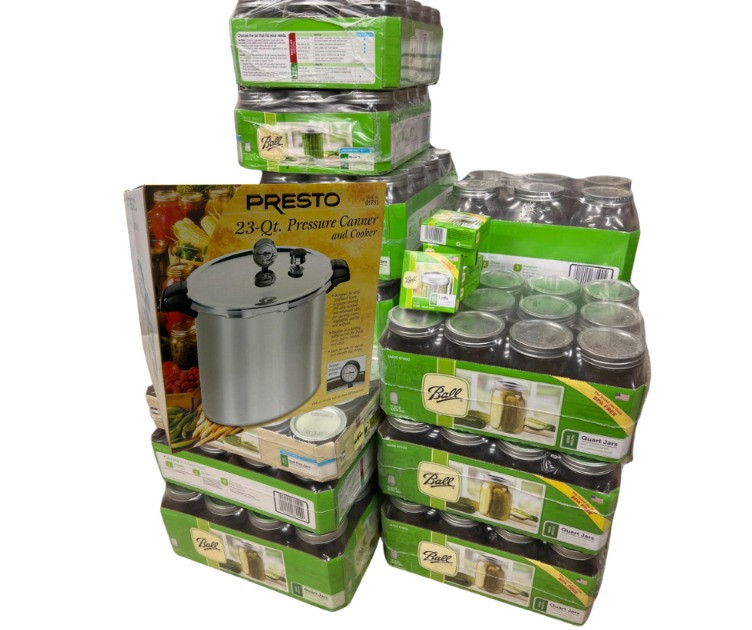 Presto 23-quart pressure canner and cooker, paired with 15 cases of glass canning jars in assorted sizes. The canner is ideal for preserving vegetables, meats, and fruits using pressure or water bath methods. Jar sizes include quart, half-gallon, pint, and specialty fruit jars—perfect for seasonal harvests, pantry stocking, or small-batch production. A complete setup for home canning enthusiasts, food preservationists, or anyone preparing for winter storage. Canner: Presto 23-quart pressure canner and cooker Jars: 15 cases total Sizes: Quart, Half-Gallon, Pint, Fruit Jars Condition: New and usable