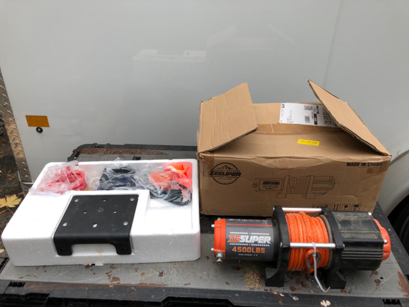 ZESUPER 4500 lb winch with synthetic rope, new in box. Compact yet powerful, this winch is ideal for ATV recovery, trailer mounting, or contractor rigs. Includes remote control and mounting hardware. Lightweight synthetic rope offers safety and ease of handling.