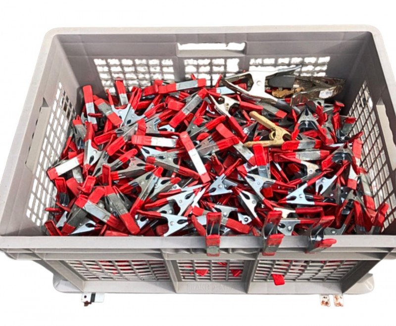 Large bin filled with dozens of 4-inch red-handled spring clips. These heavy-duty clamps are ideal for securing tarps, holding materials in place, organizing cords, or assisting with shop, garage, and contractor tasks. The bright red handles offer easy visibility, and the strong spring tension ensures a firm grip on wood, metal, plastic, or fabric surfaces. A versatile addition to any workspace. Type:Spring clips Size:4-inch Handle:Red vinyl-coated Quantity:Large bin (dozens) Use:Shop, contractor, garage, utility Condition:Usable