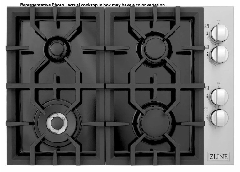 ZLINE RC30 30" drop-in range top, compatible with both gas and propane setups. This unit is brand new in its original unopened box, making it ideal for kitchen remodels, contractor inventory, or appliance resellers. The RC30 model includes four high-performance burners and a sleek black porcelain cooktop surface. Known for its durability and modern styling, ZLINE appliances are a favorite among designers and builders. Brand: ZLINE Model: RC30 Type: 30" drop-in range top Fuel: Gas or propane Color: Undetermined from product information on outside of box. Zline typically manufacturers cooktops in black, stainless, or bronze. Burners: 4 Condition: New in unopened box
