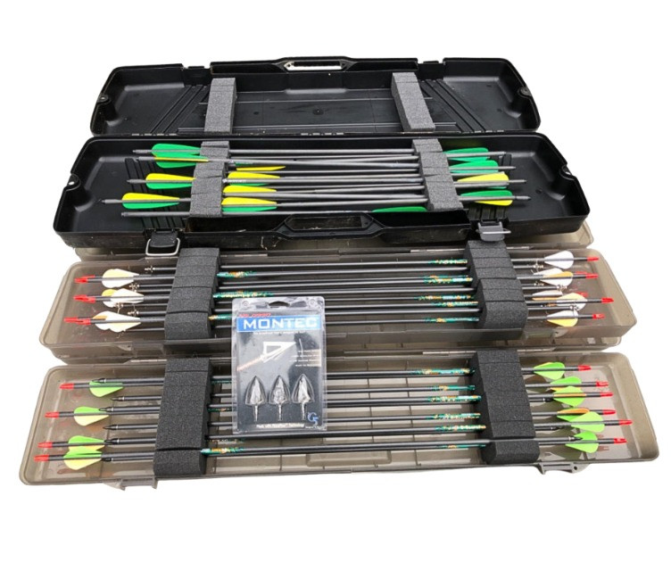 Assortment of hunting arrows and accessories, including brands Hunter and Barnett. Features Montec broadheads known for one-piece stainless steel construction and razor-sharp edges. Includes protective cases for transport and storage. Suitable for compound or crossbow setups depending on shaft type and nock configuration. Quantity: 13 Barnet Arrows - Each is approx. 22.5" in length 22 Hunter Arrows - Each is approx. 30" in length
