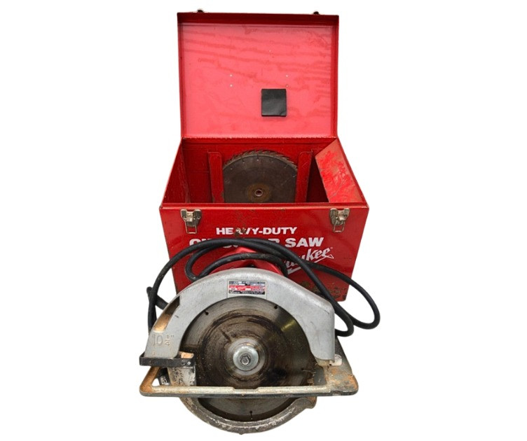 Milwaukee 10-1/4" heavy-duty circular saw housed in its original metal case. Cat No. 6460, Listed 480A. Built for deep cuts and framing applications, this saw features a powerful motor and rugged construction suited for professional jobsite use. Ideal for timber framing, beam work, and large dimensional lumber. Includes blade guard, handle grip, and corded power. Working condition.